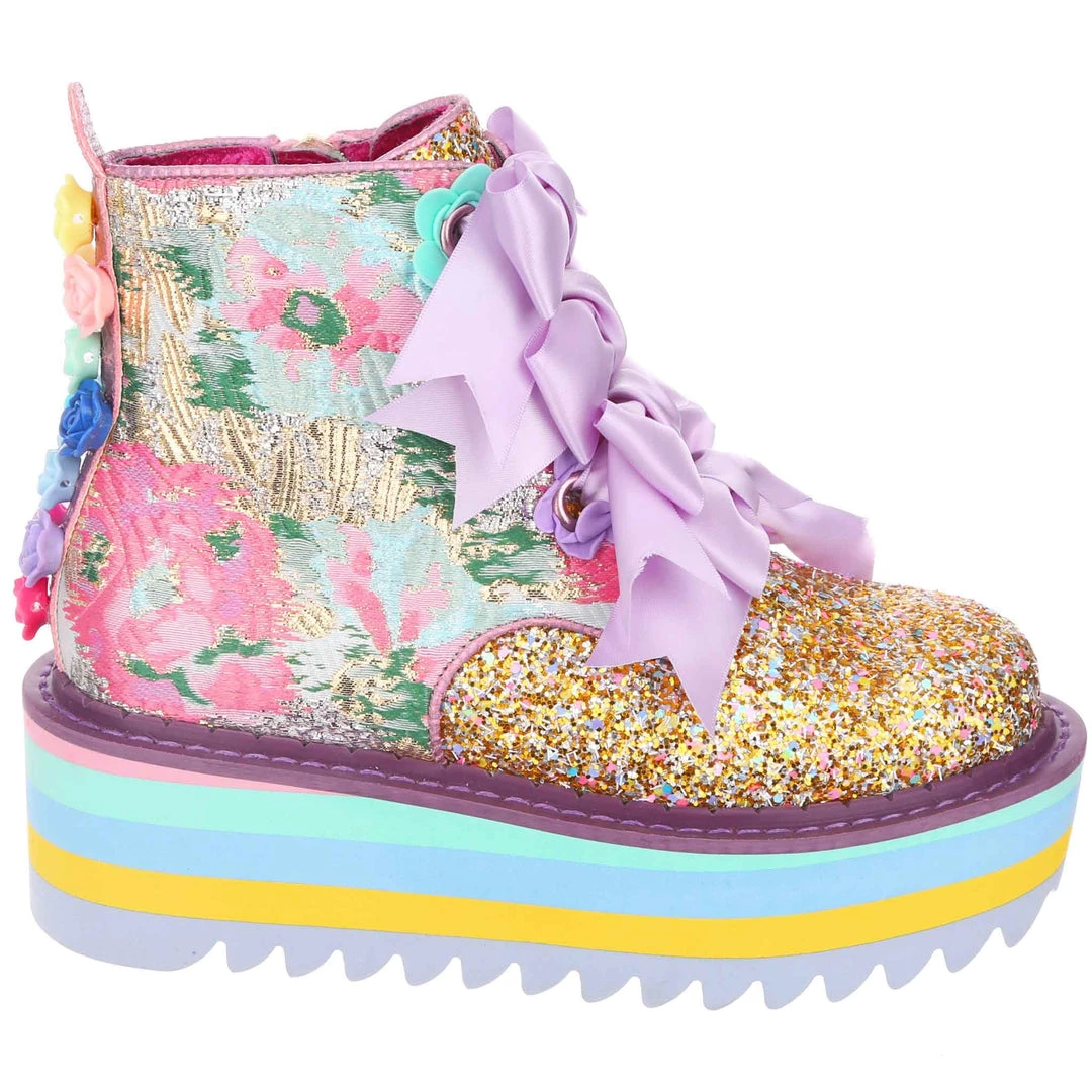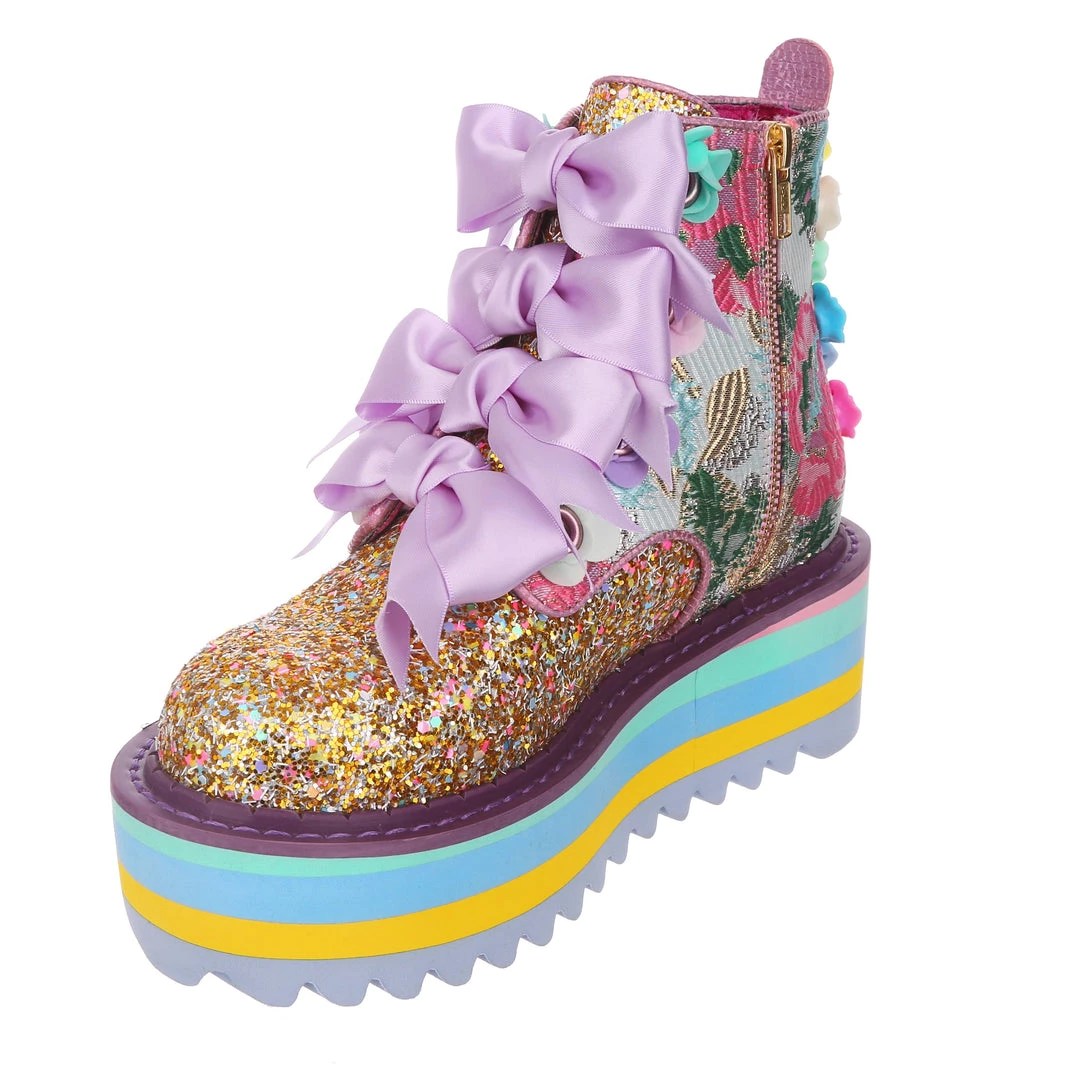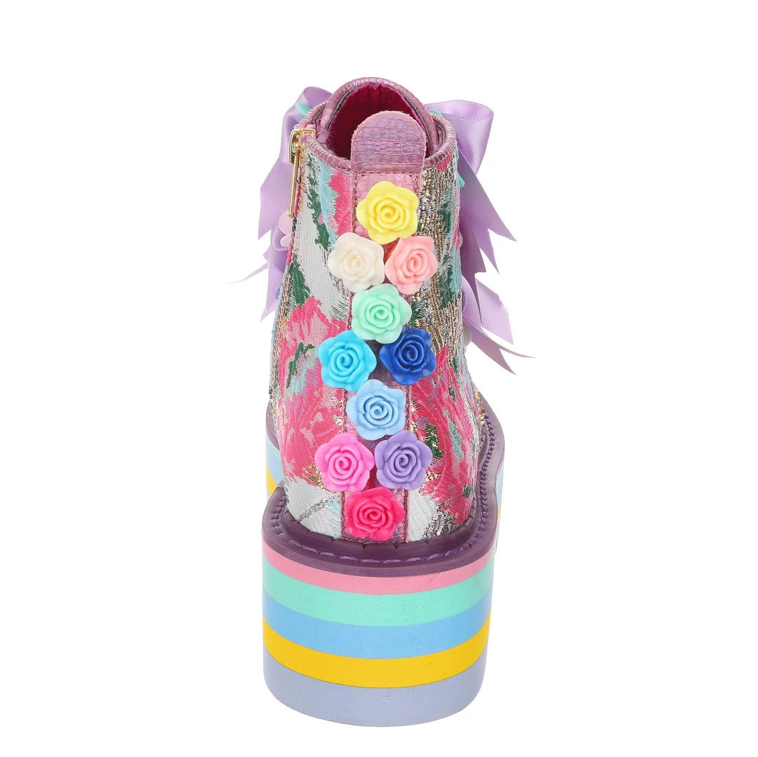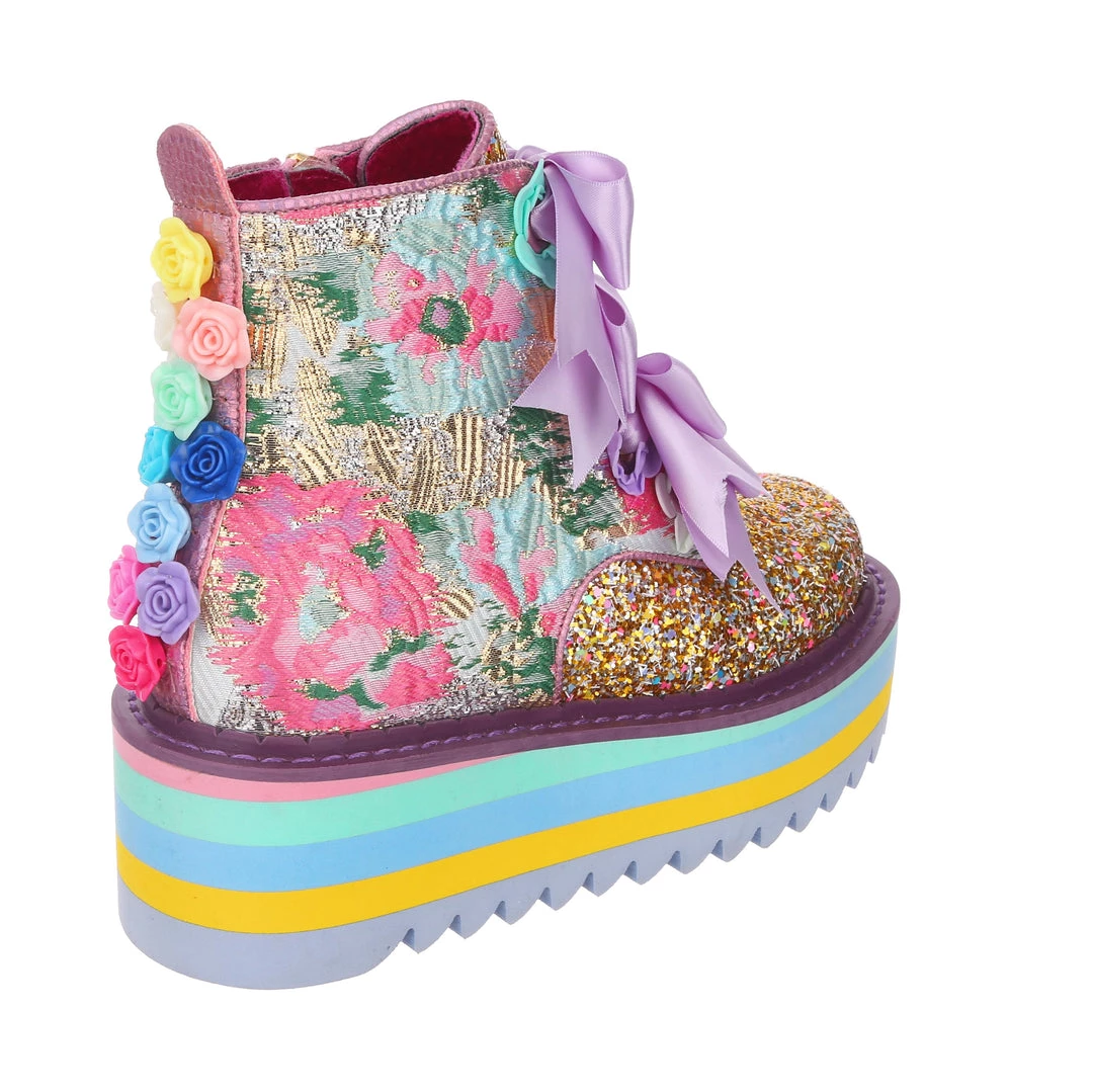 Covered in bows, these boots are a combination of textures, from the lilac ribbons on the laces, to the tapestry brocade in blues, pinks and green on the side, to the gold glitter on the toe, these lovelies are sure to turn heads! Little details like the multicoloured roses along the back, and the stacked sole with a jagged tread give these shoes a bit of a bright streetwear feel, perfect to give your outfit that boost you’ve been looking for!