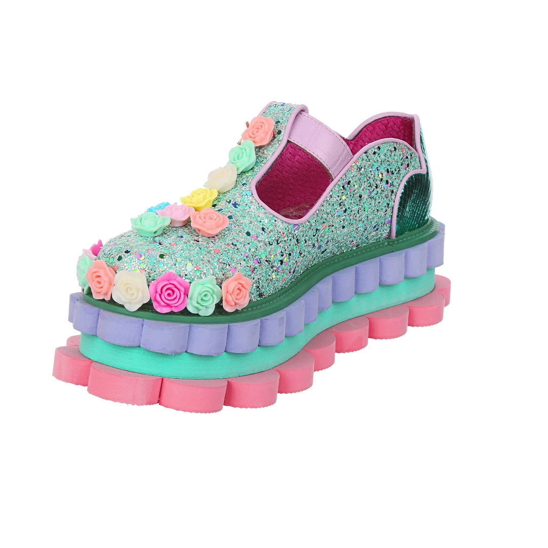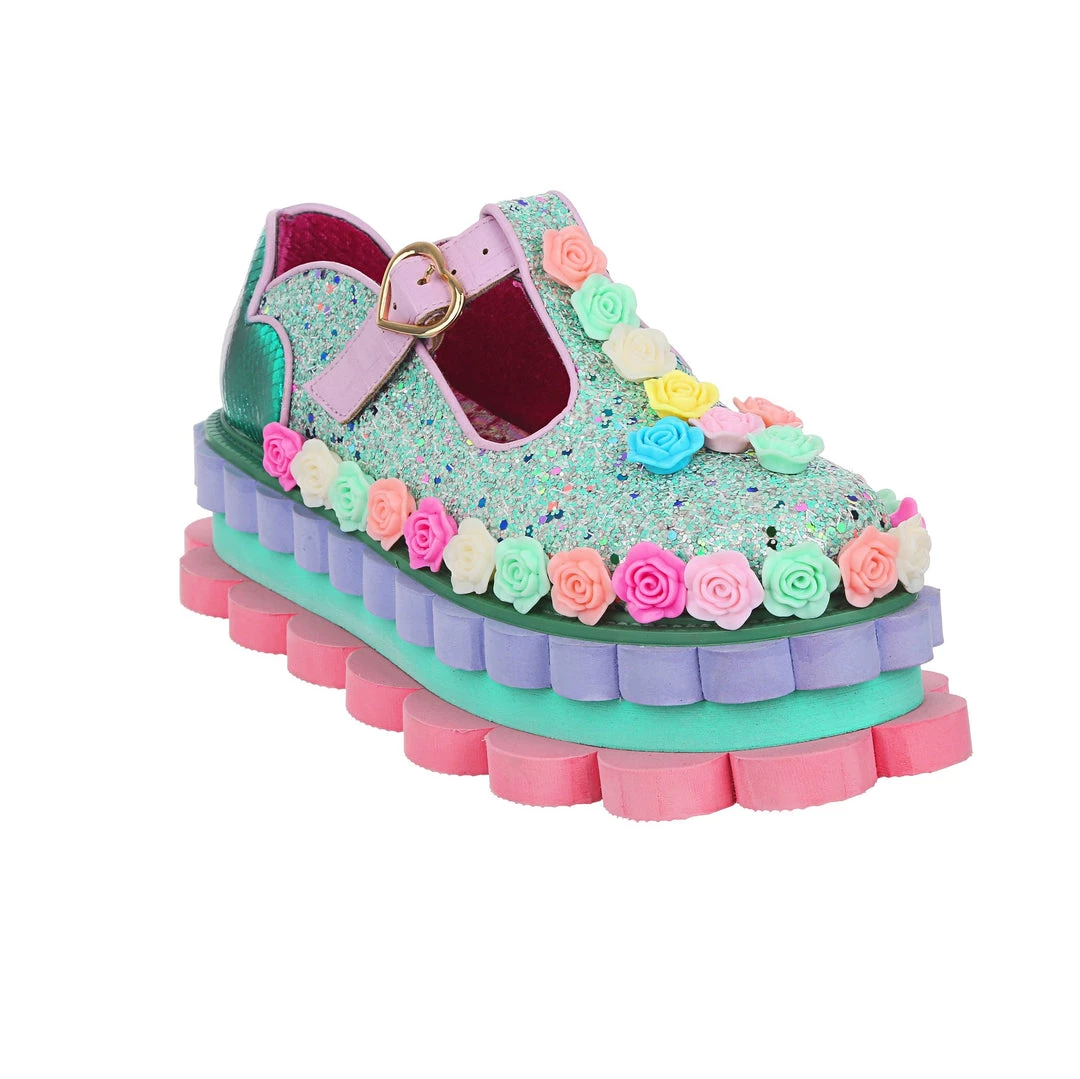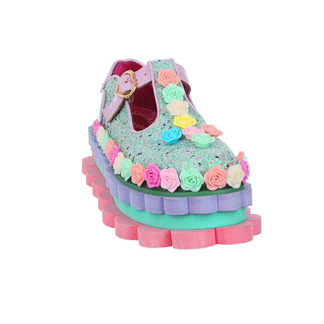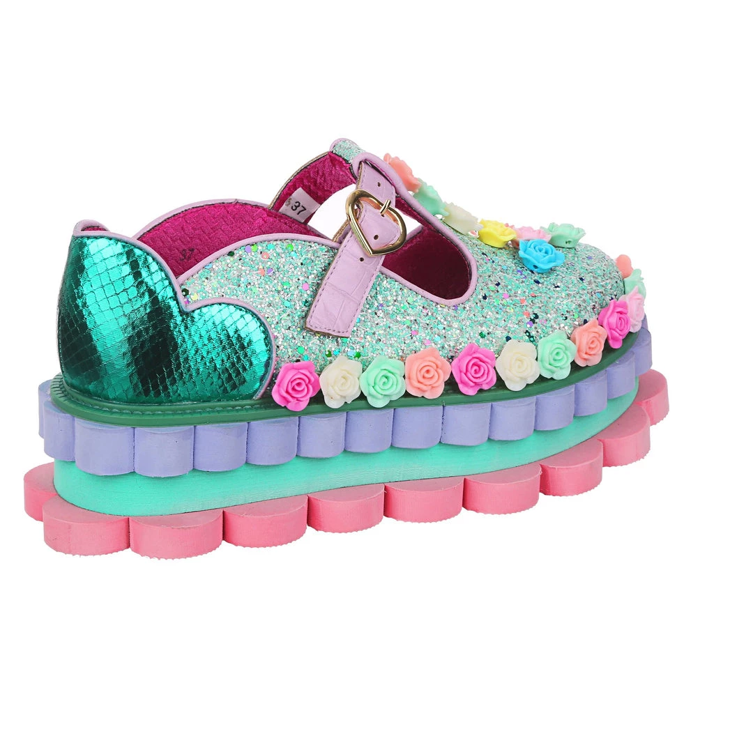 Show the world that you are the sweetest cake on the stand in these flatform beauties! A fabulous and bright statement sole looks like layered sweet treats and is topped with the sweetest treat of all – you! The T-Bar upper is a gorgeous blend of chunky mint glitter and a shimmering teal metallic, which is all topped with fantastical multicoloured flowers! Add them to your plate today and feel like a kid in a candy store!