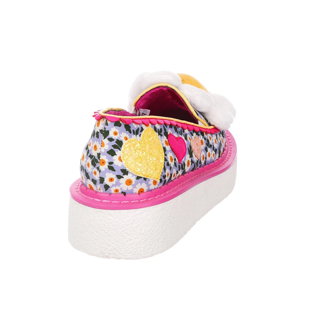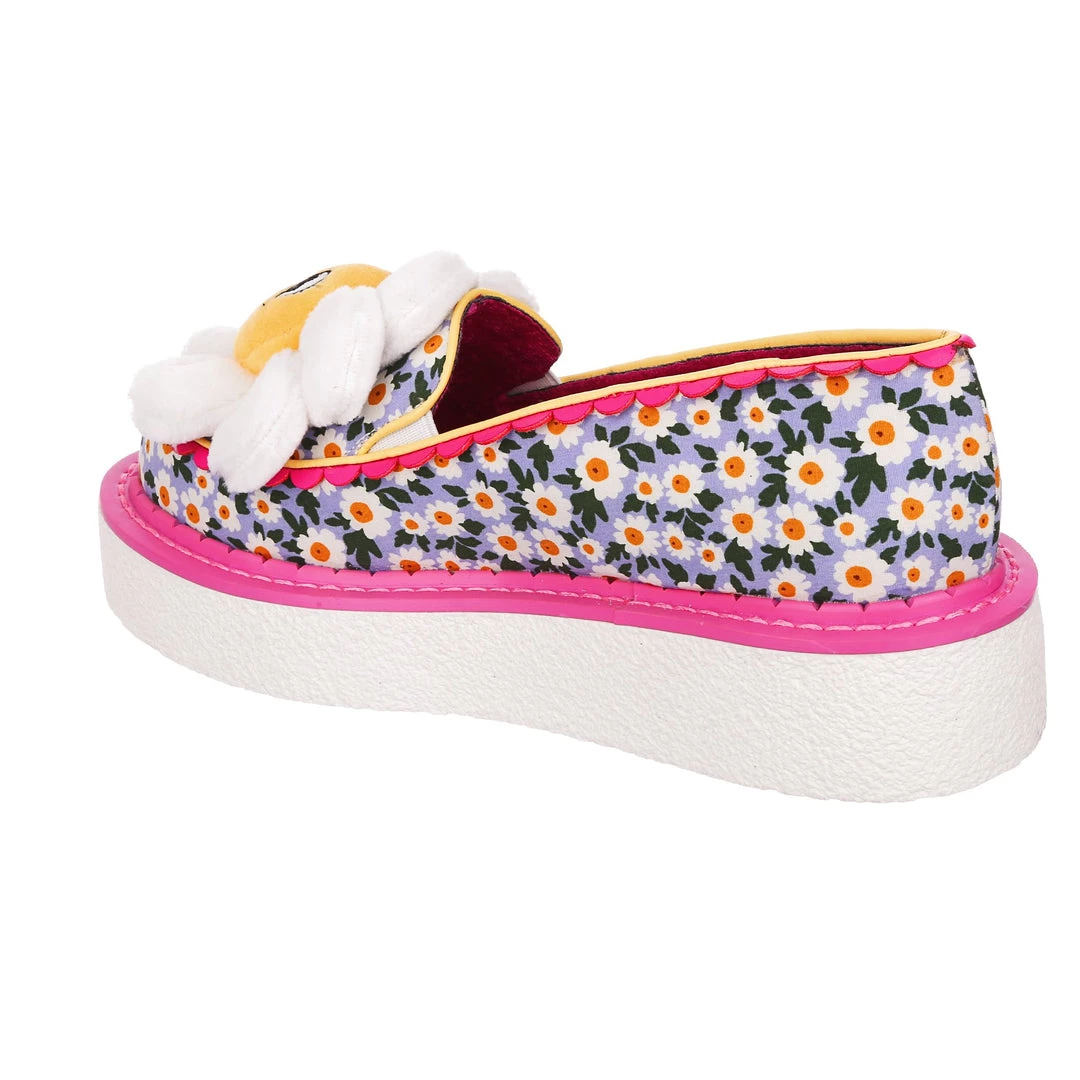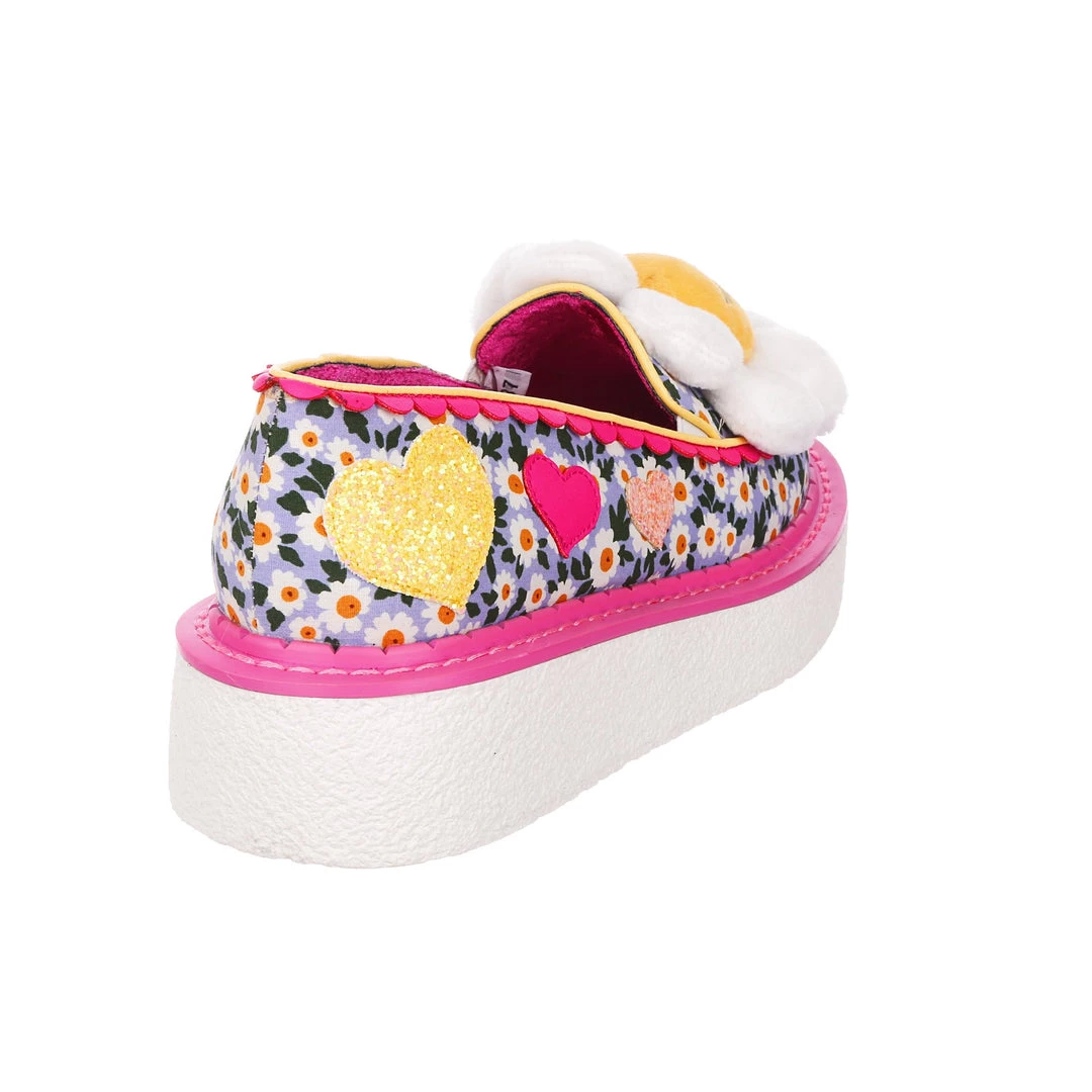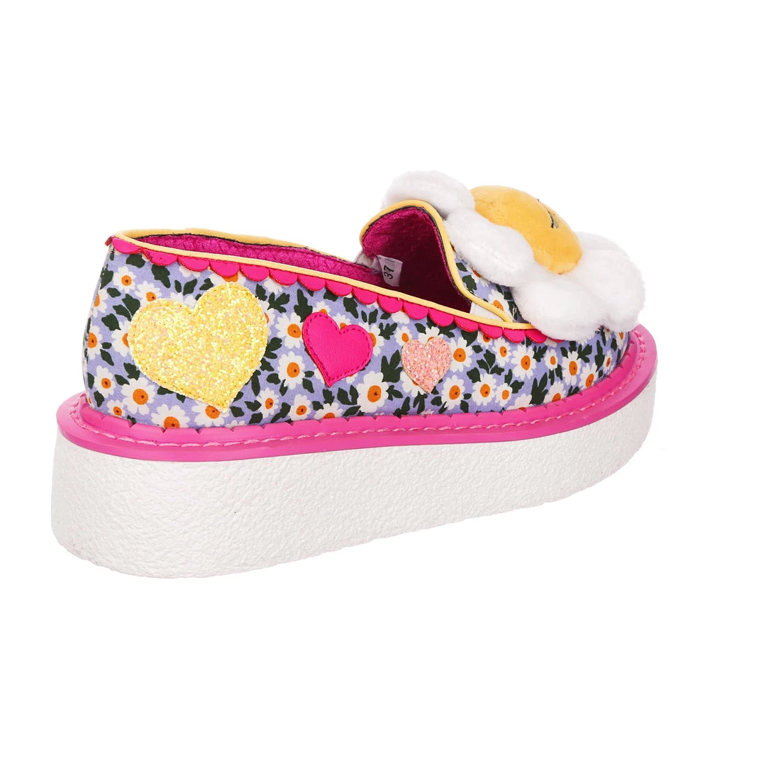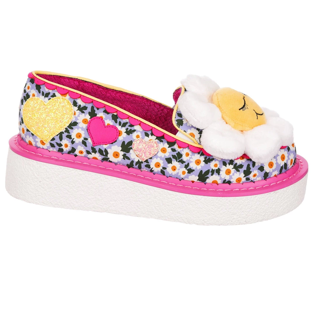 Add some floral fun to your wardrobe today! These slip on sassy flatform shoes are sure to put a smile on your face, featuring a 3D plush white and yellow flower on the toe, which is paired with the gorgeous purple based floral upper fabric! Little details include the hot pink scalloping and gold piping along the top edge, linking to the adorable applique hearts on the side! So pop these platforms on and get grooving!