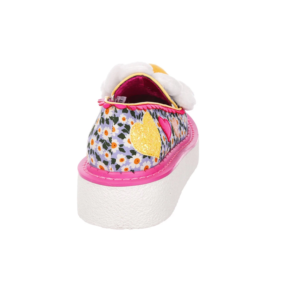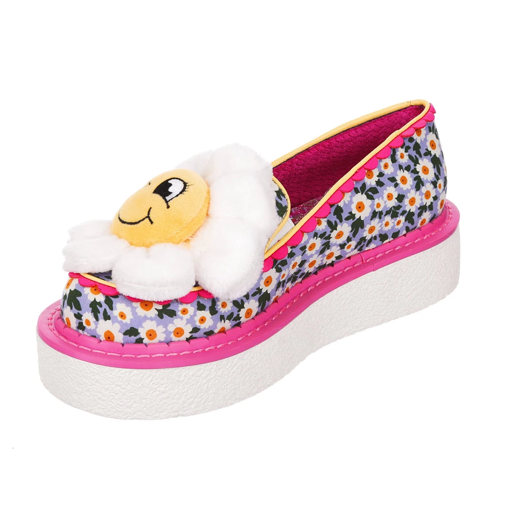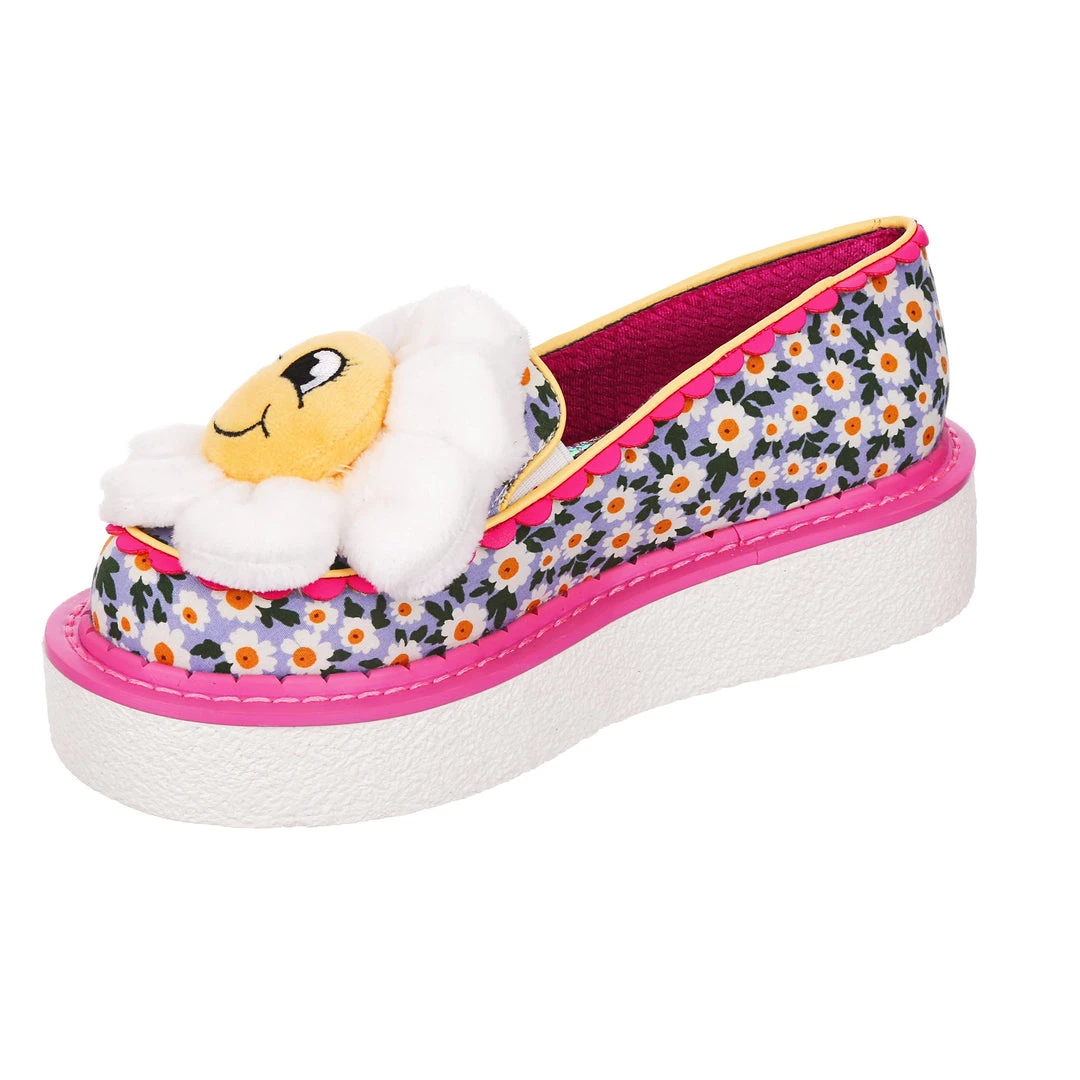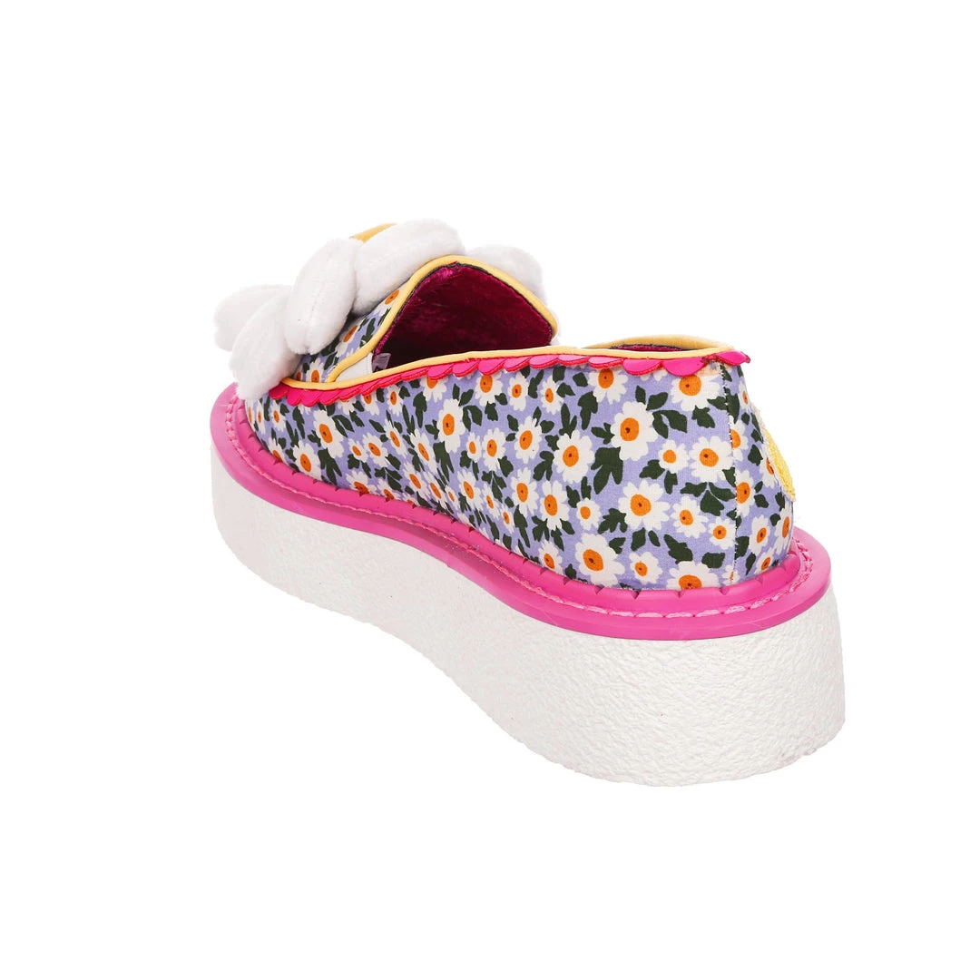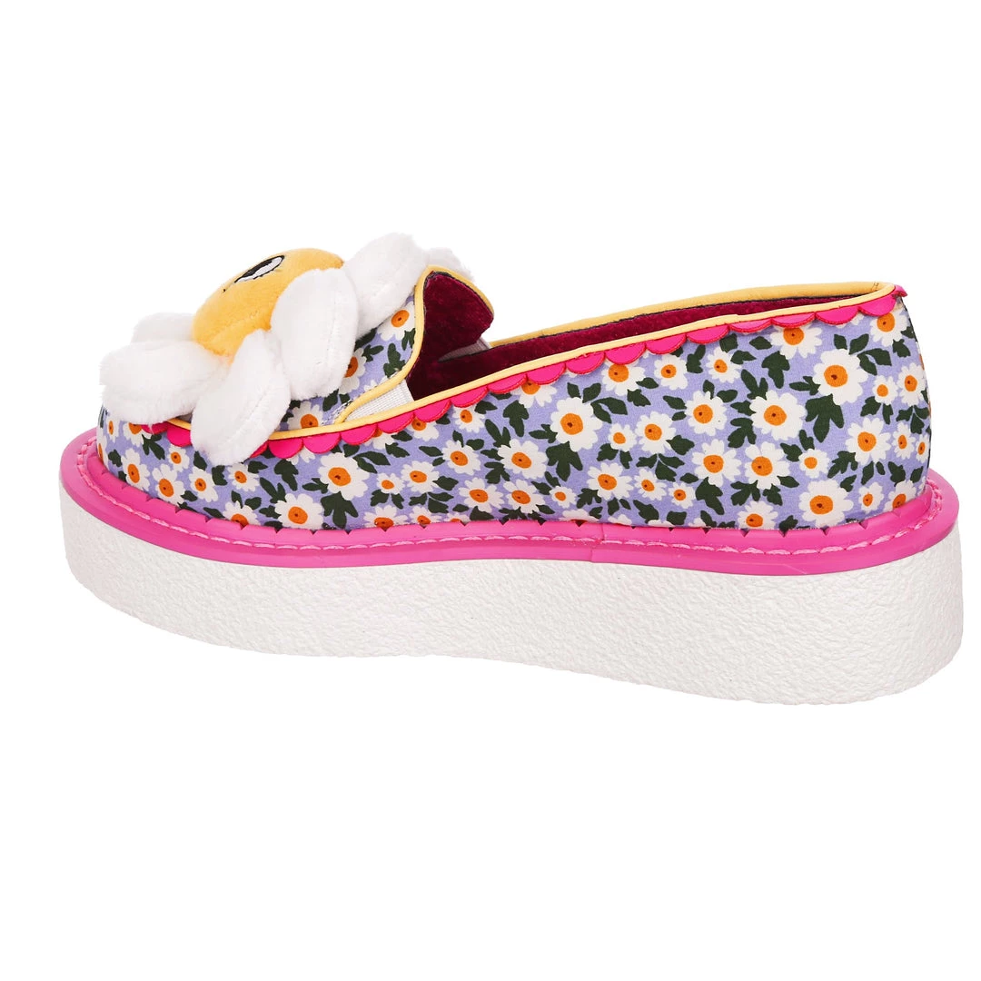Add some floral fun to your wardrobe today! These slip on sassy flatform shoes are sure to put a smile on your face, featuring a 3D plush white and yellow flower on the toe, which is paired with the gorgeous purple based floral upper fabric! Little details include the hot pink scalloping and gold piping along the top edge, linking to the adorable applique hearts on the side! So pop these platforms on and get grooving!
