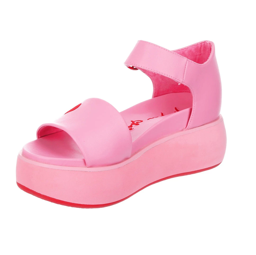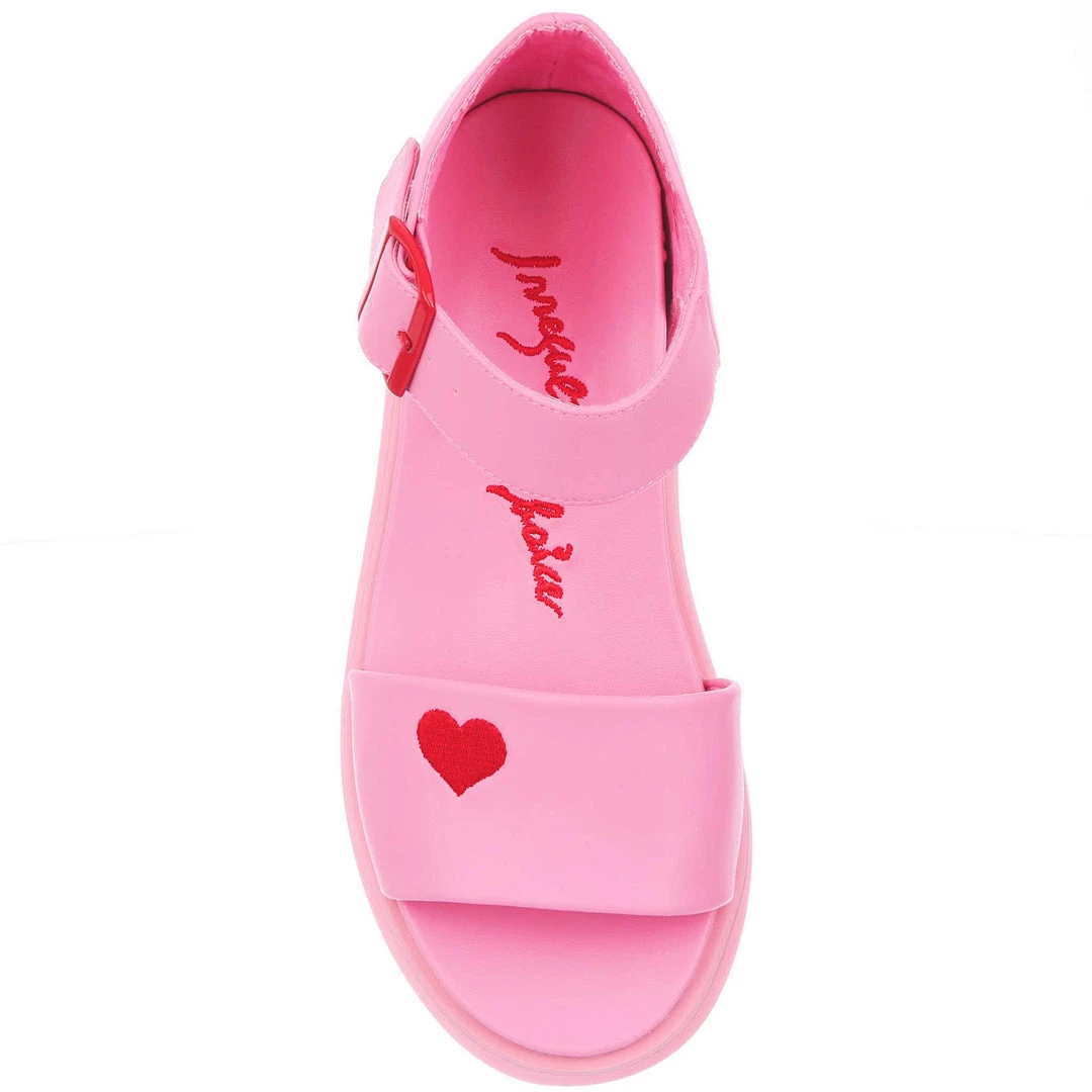 Hello new faves! These sleek and bright sandals are here to become your new go-to’s! A super comfy flatform sole and classic two strap look is all decked out in a pink monochromatic fantasy, only broken up by the striking red heart embroidery and matching buckle! Great to style with other block colours, or to use as a pop of colour in any outfit!