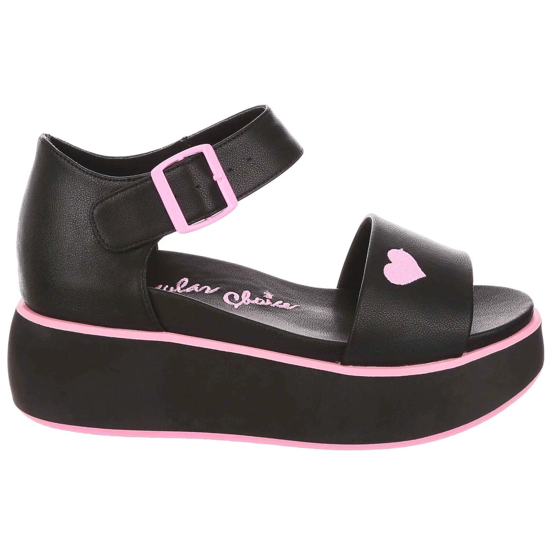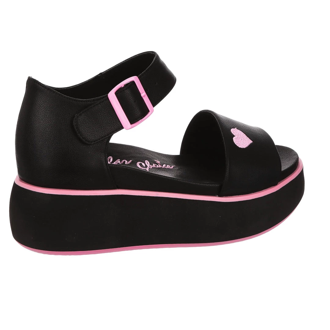 Hello new faves! These sleek and bright sandals are here to become your new go-to’s! A super comfy flatform sole and classic two strap look is all decked out in a black monochromatic fantasy, only broken up by the striking pink heart embroidery and matching buckle! Great to style with other block colours, or to use as a pop of colour in any outfit!
