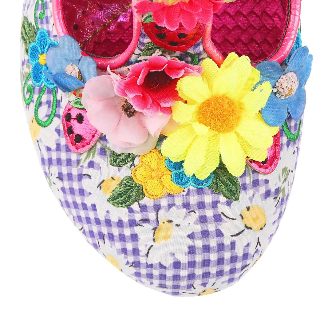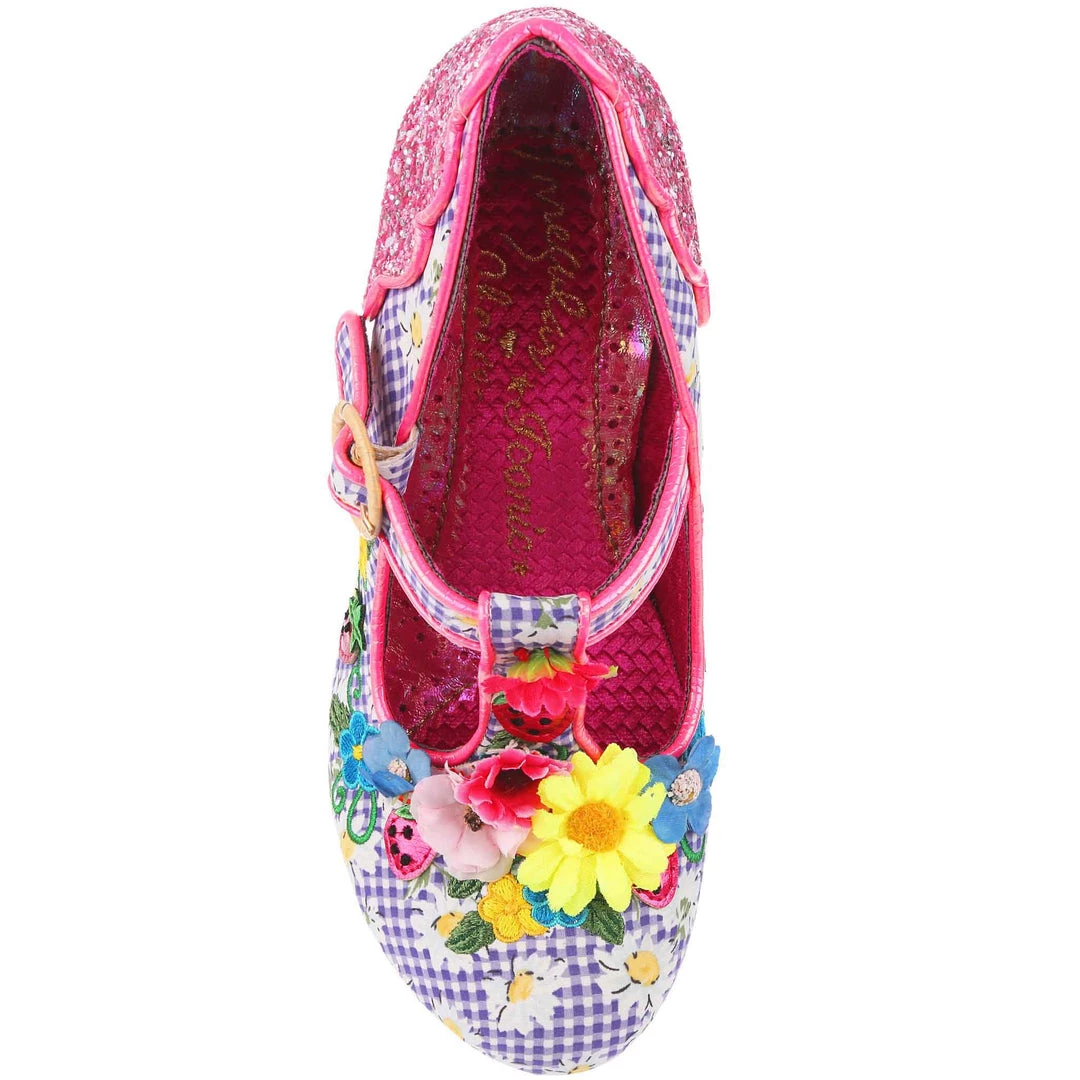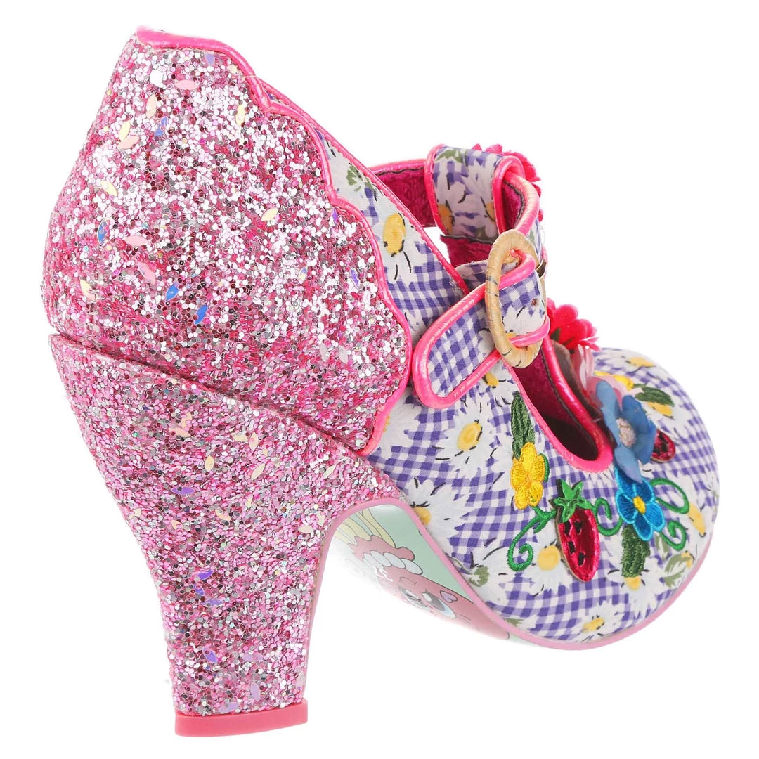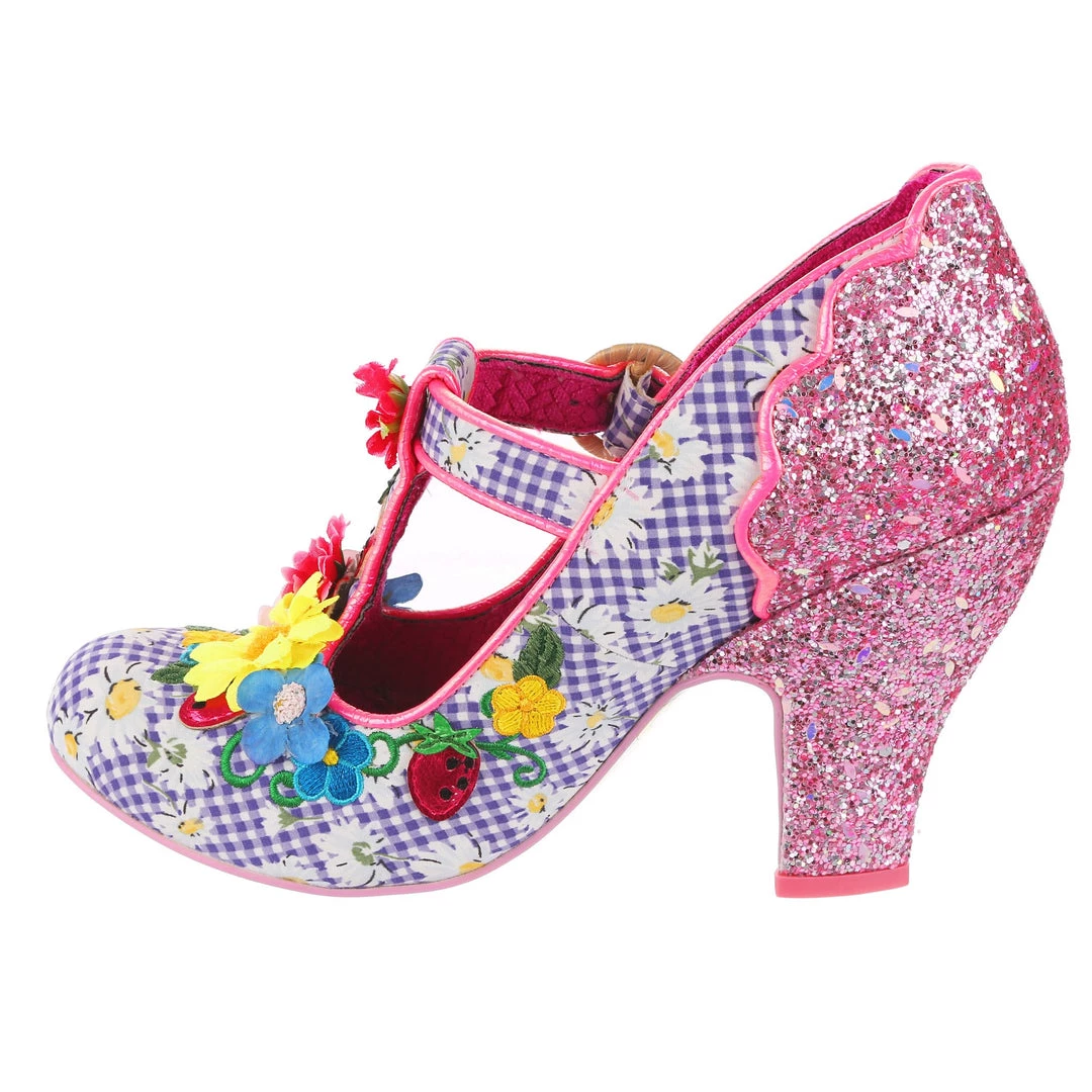 The perfect shoes to put a spring in your step! These T-Bars are covered in the most gorgeous little springtime blooms, which match the darling purple and white gingham upper which has adorable printed daisies on it! The heel and back panelling of the shoe is encrusted in chunky pink glitter, sure to add a little sparkle wherever you go!