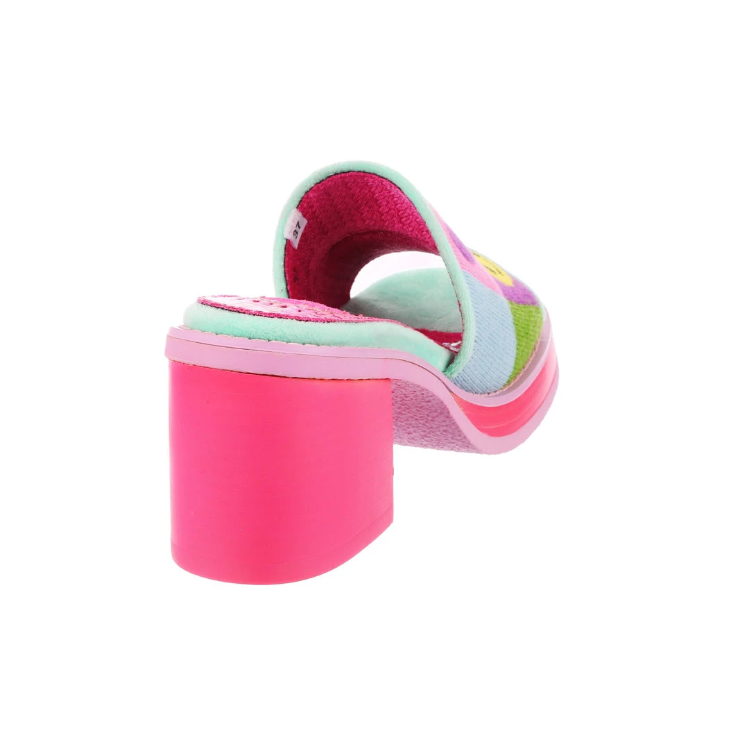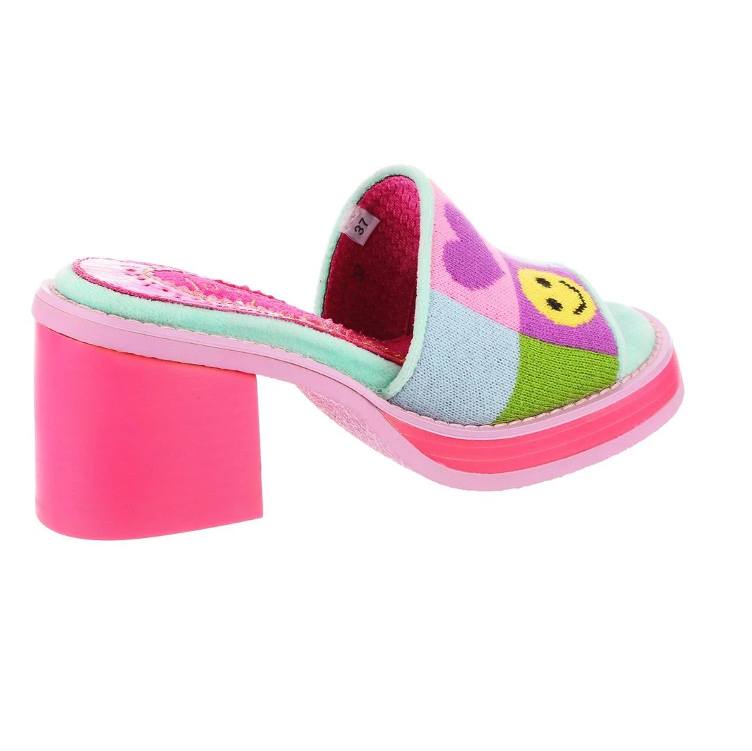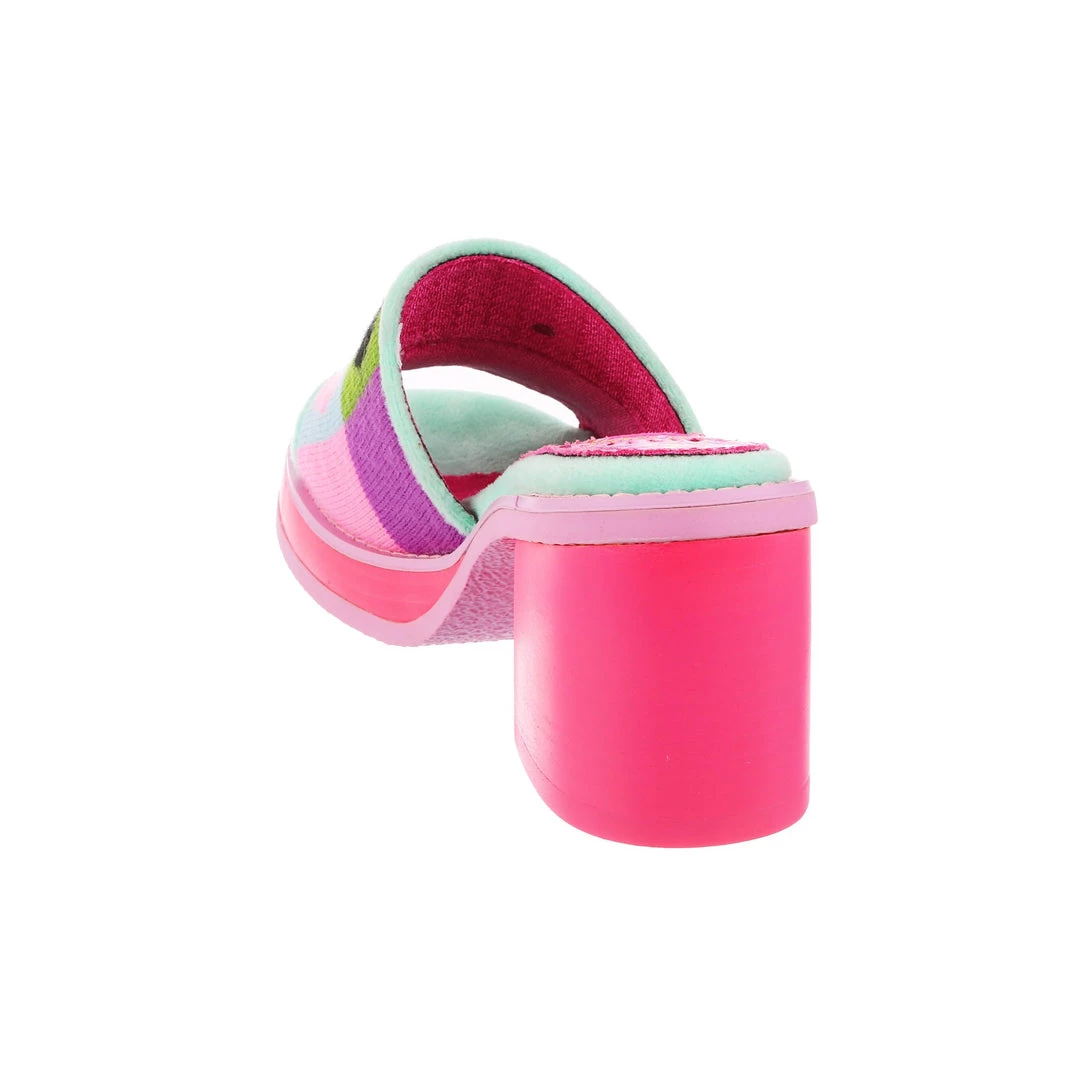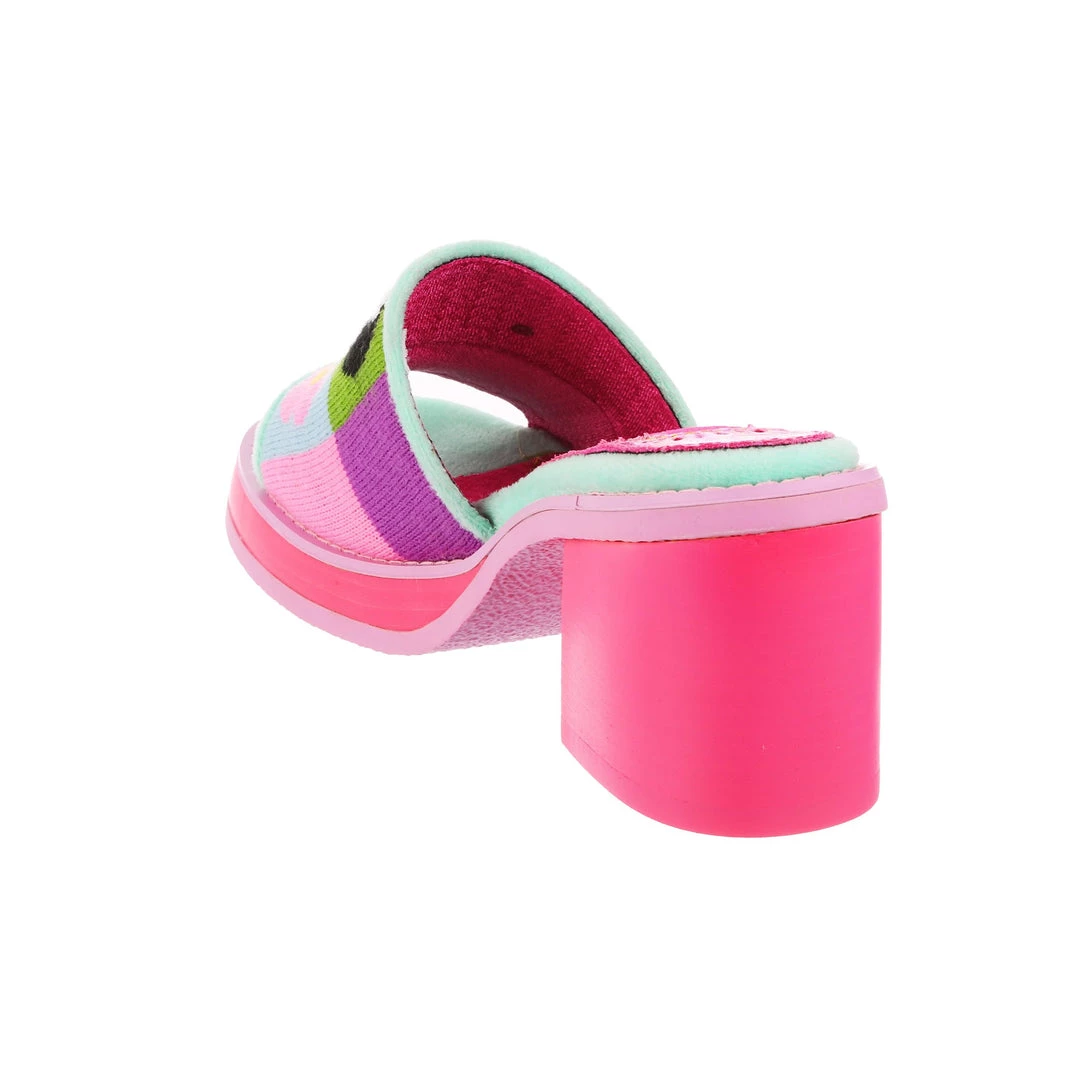Slip-on these funky fashionista faves! Super cute slide on style, these mules are covered in super cute graphics and have a fun and wearable hot pink chunky heel so that you can slip them on and go all day!