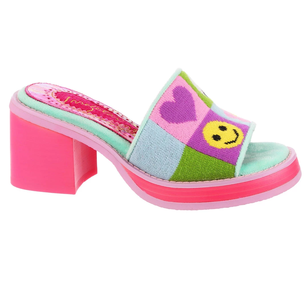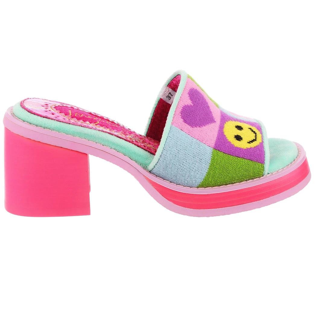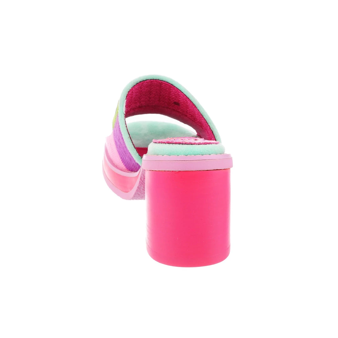 Slip-on these funky fashionista faves! Super cute slide on style, these mules are covered in super cute graphics and have a fun and wearable hot pink chunky heel so that you can slip them on and go all day!
