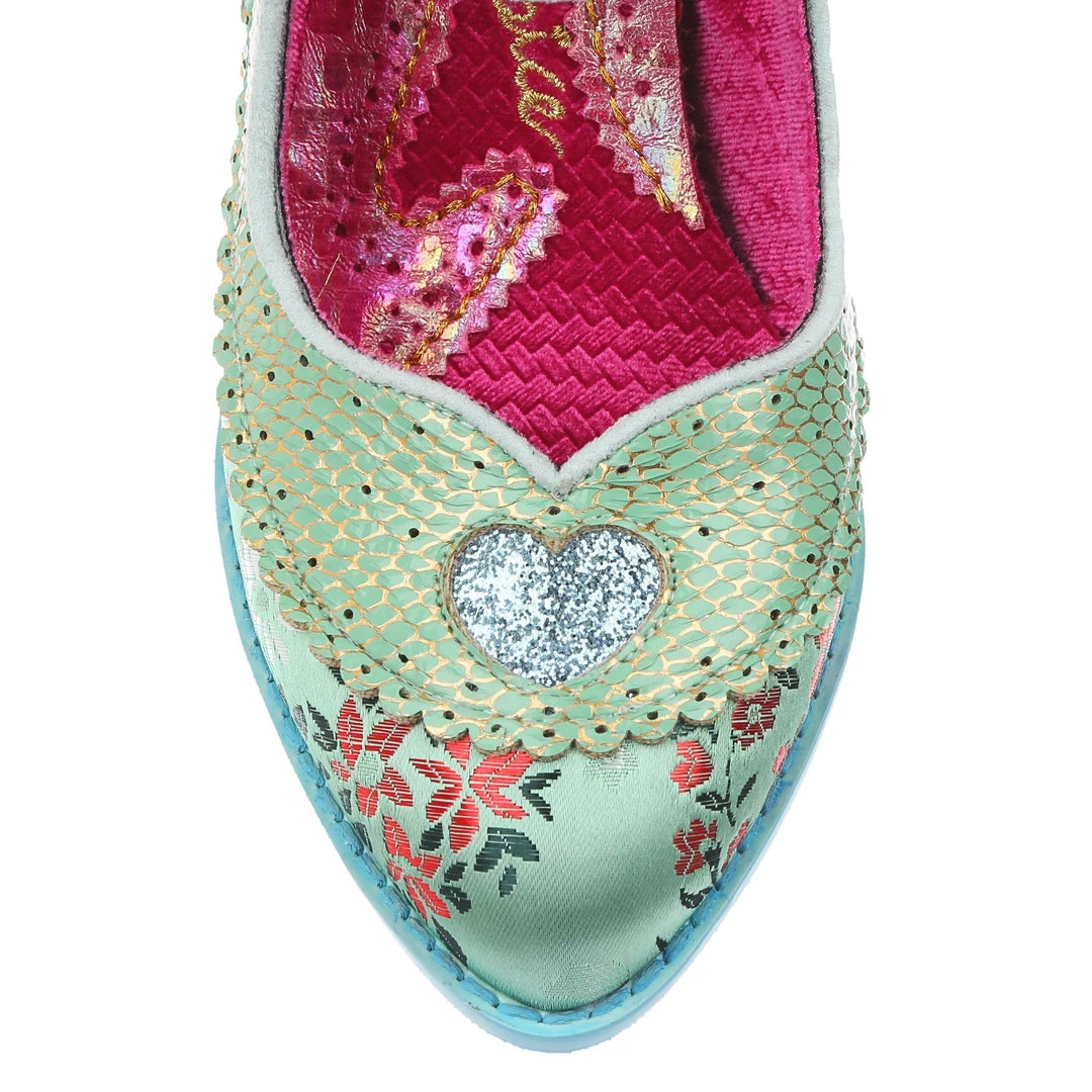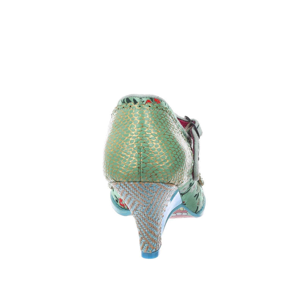 Want to feel some romance and adventure in your wardrobe? These green mid heel shoes are here for you! Sumptuous mint green brocade is paired with a dusky brushed metallic pistachio and striking blue sole and heel details to give these shoes a bold and fresh colour scheme, and the comfortable Mary Jane strap is fastened with a heart buckle, meaning that these are wearable and secure as well as fabulous! Add them to your collection today and fall in love!