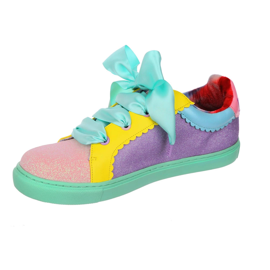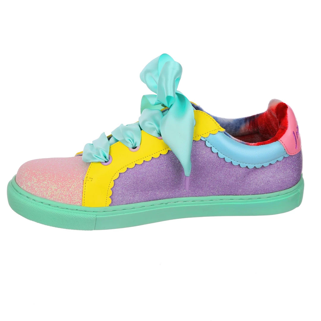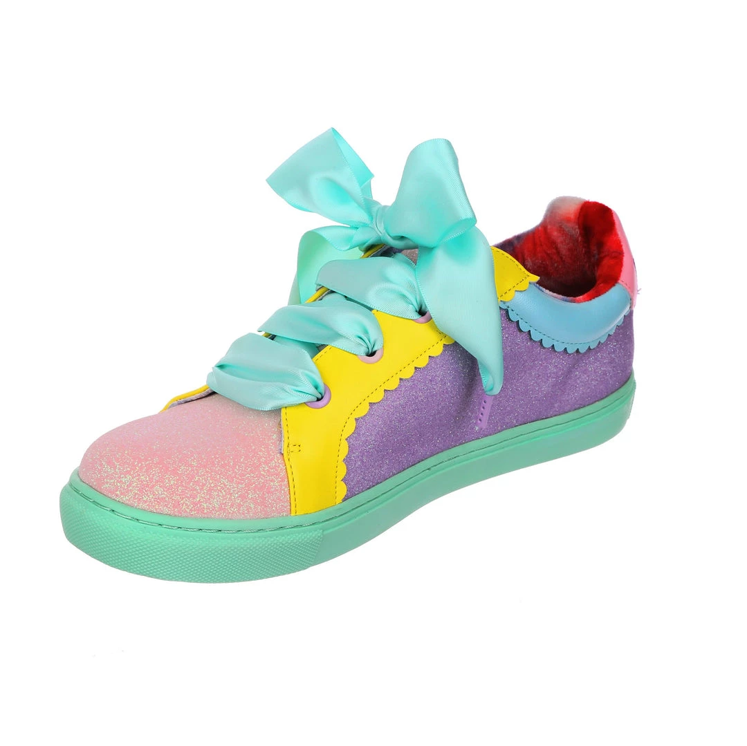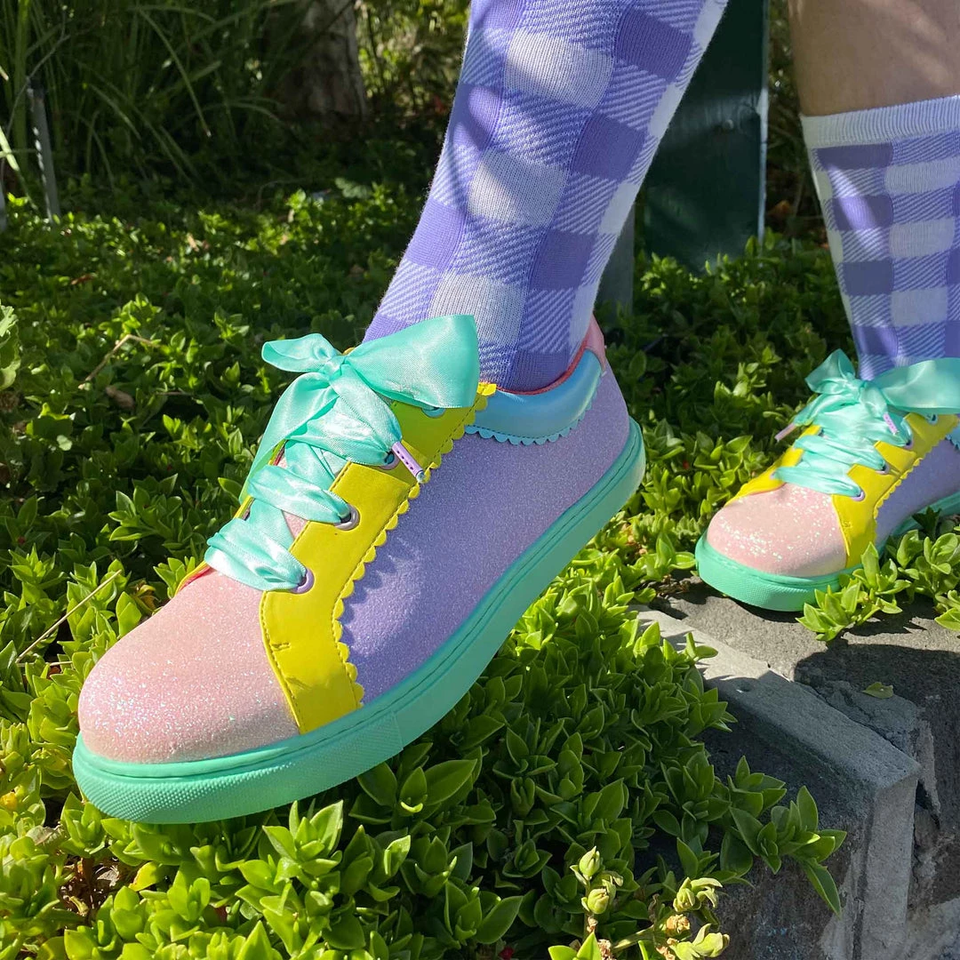 Wanting something comfy and casual but still with some irregular flair, these are the shoes for you! A comfy lace up sneaker style, these pumps are all decked out in a shimmering mismatch patchwork of pastel glitter tones, with bright yellow details and a sumptuous sea foam satin ribbon lace! Absolutely perfect to lace up, step out and show the world what you are made of!