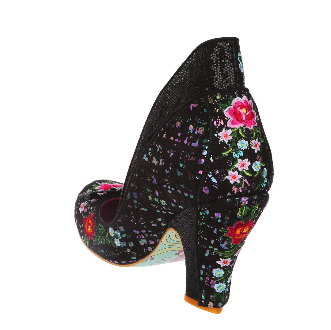Adorned in embroidered tumbling roses and posies, these lovely heels feature a statement collar around the top edge! Covered in embroidery, this collar links through florals to the rest of the details of this oil slick snakeskin texture pair of heels, the perfect addition to any collection!