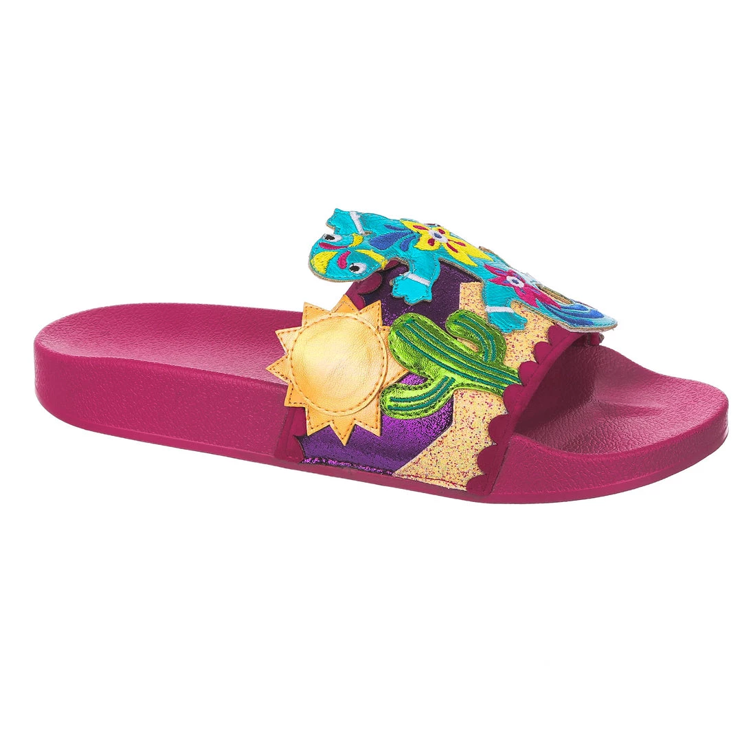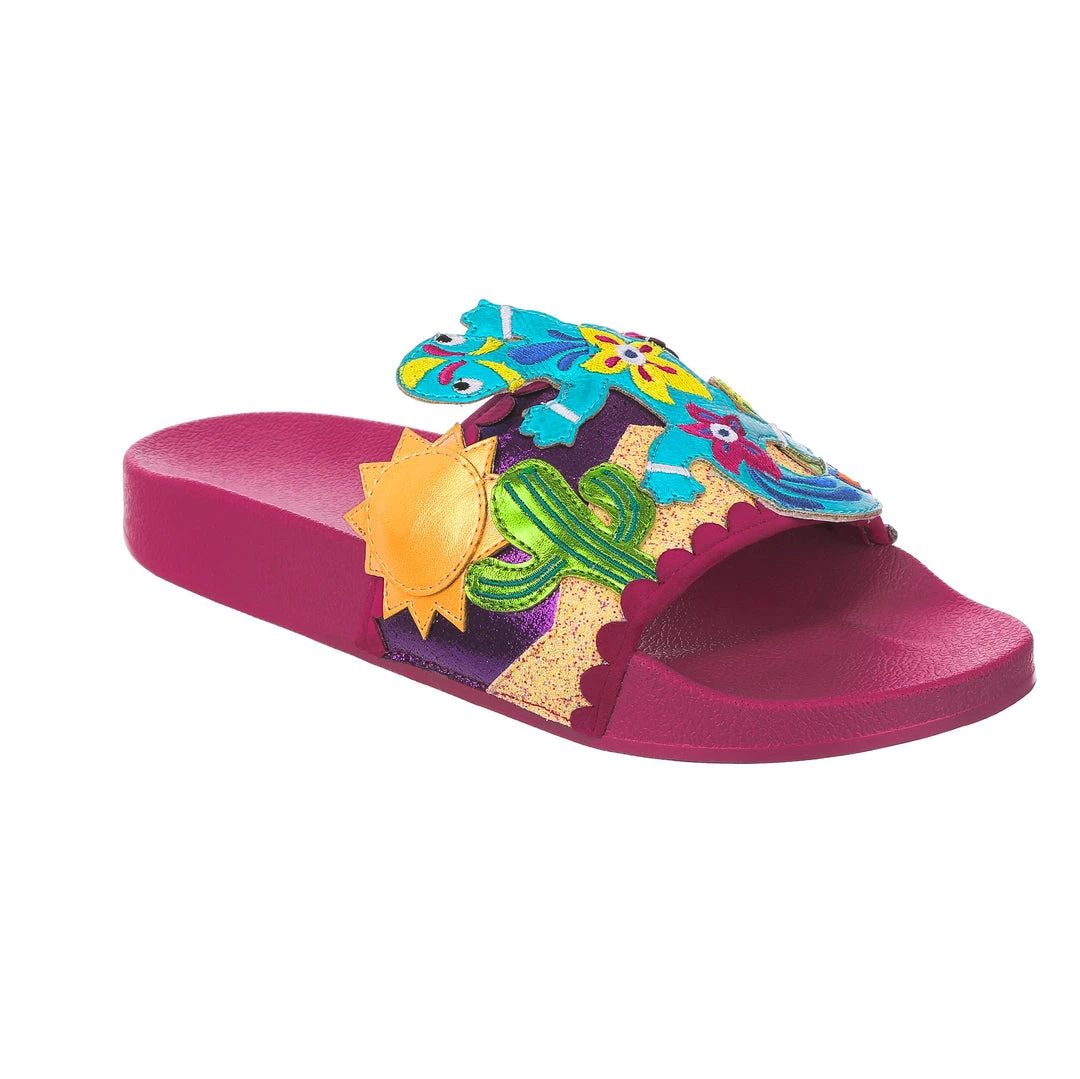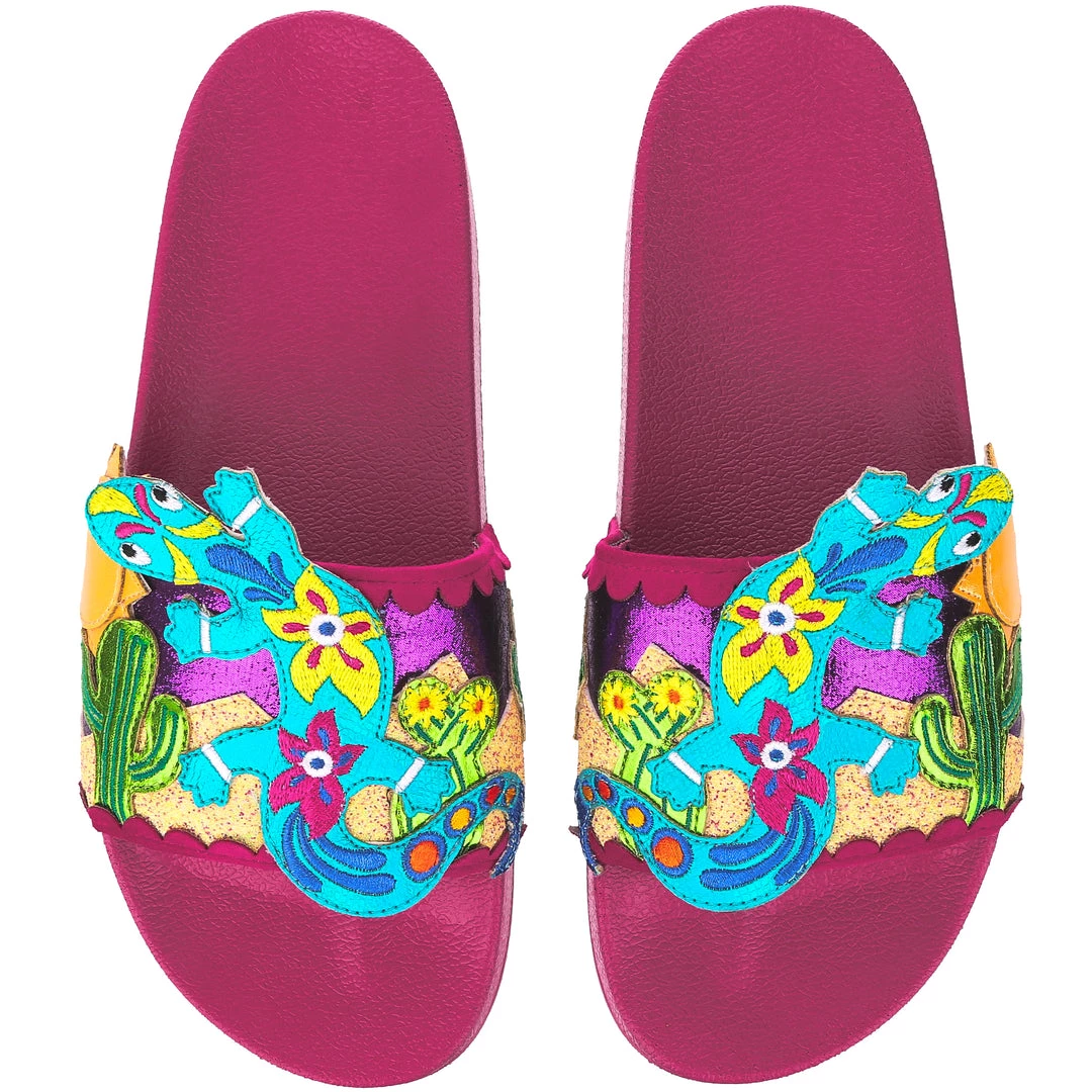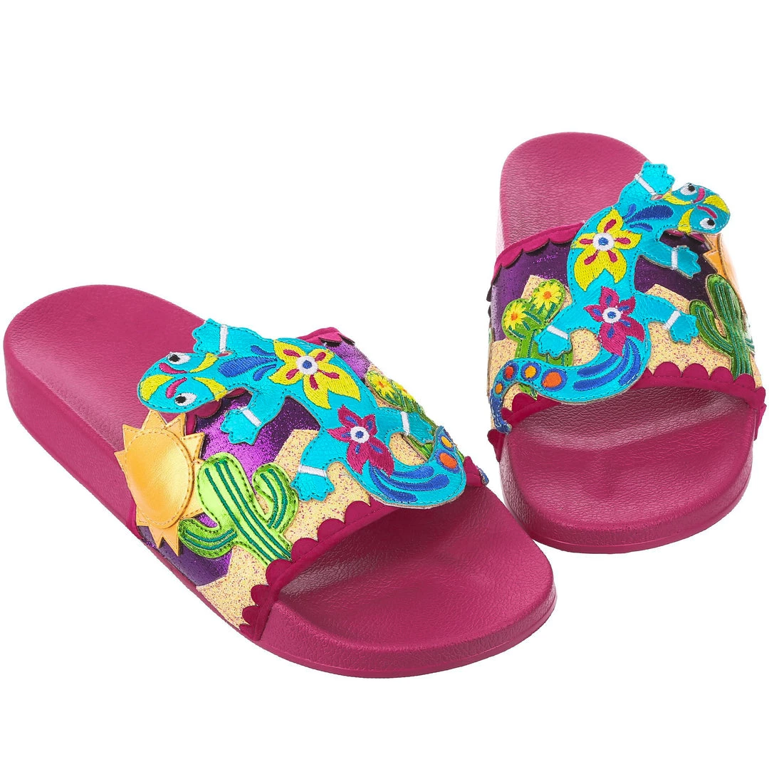 Want to slip in to something so salamader cool? These slides are ready to get up and gecko whenever you are! The hot pink comfy footbed is combined with bright and eyecatching lizard applique, complete with a cactus and sun too! So what are you waiting for? You know you iguana have them in your life!