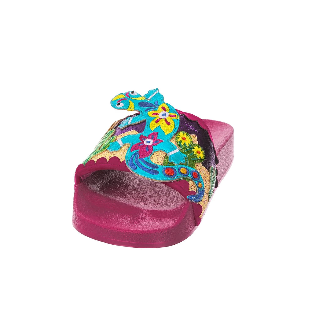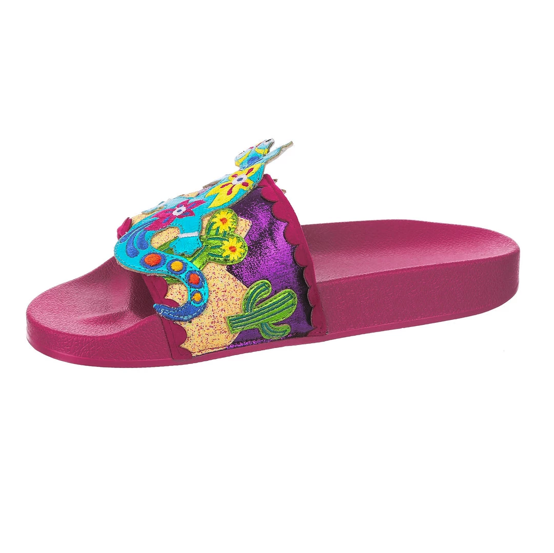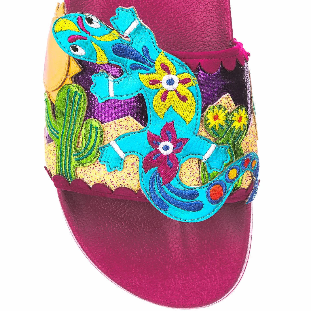Want to slip in to something so salamader cool? These slides are ready to get up and gecko whenever you are! The hot pink comfy footbed is combined with bright and eyecatching lizard applique, complete with a cactus and sun too! So what are you waiting for? You know you iguana have them in your life!
