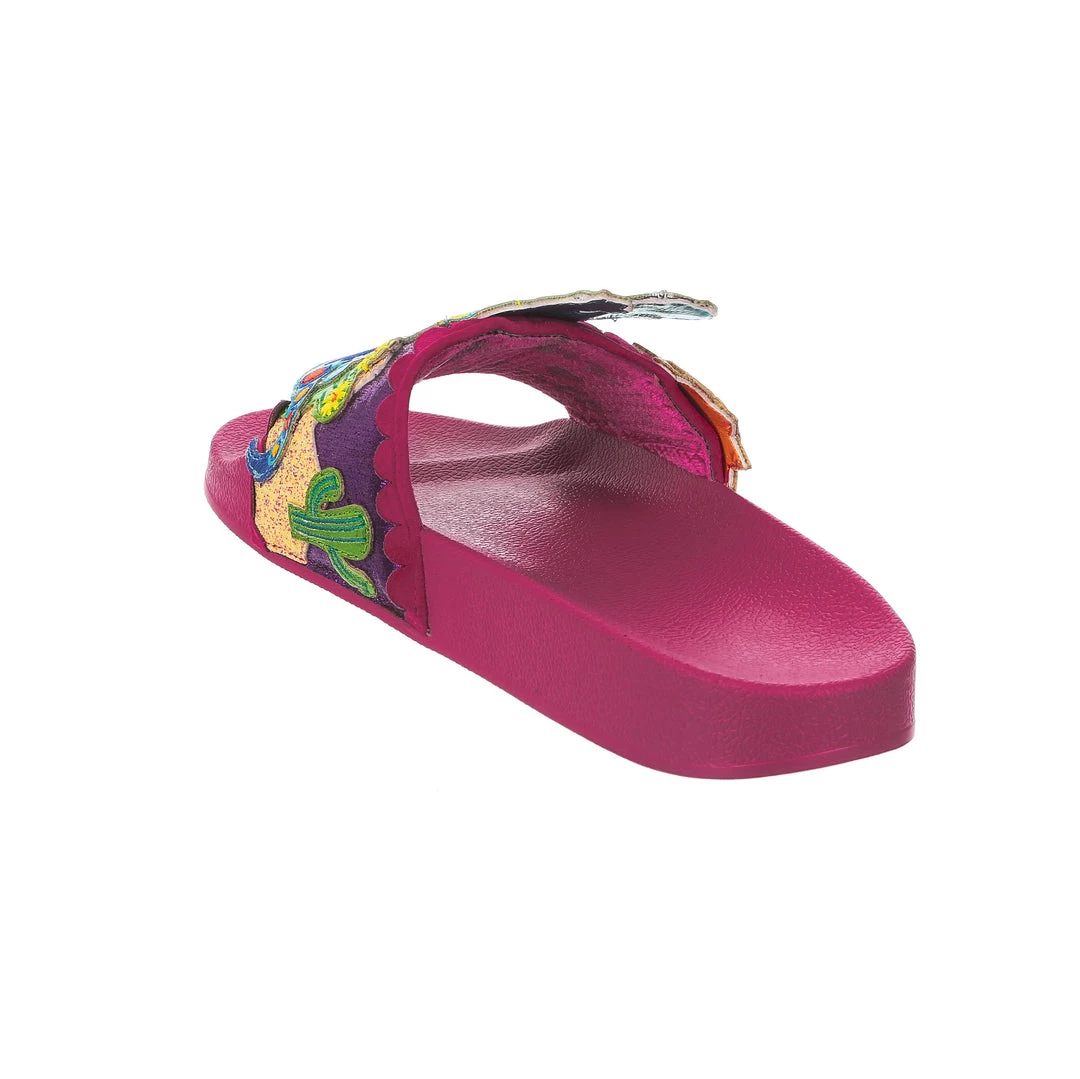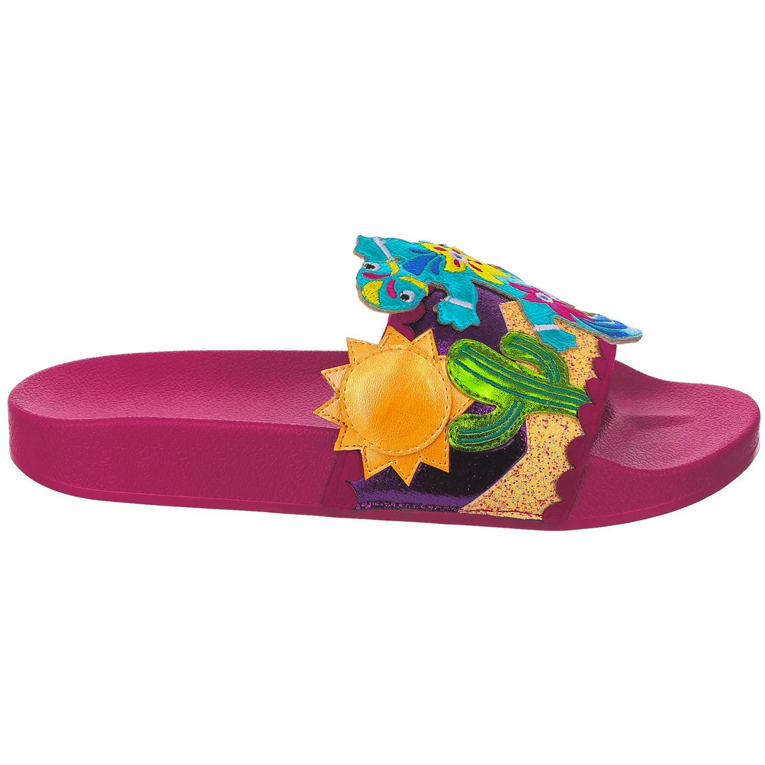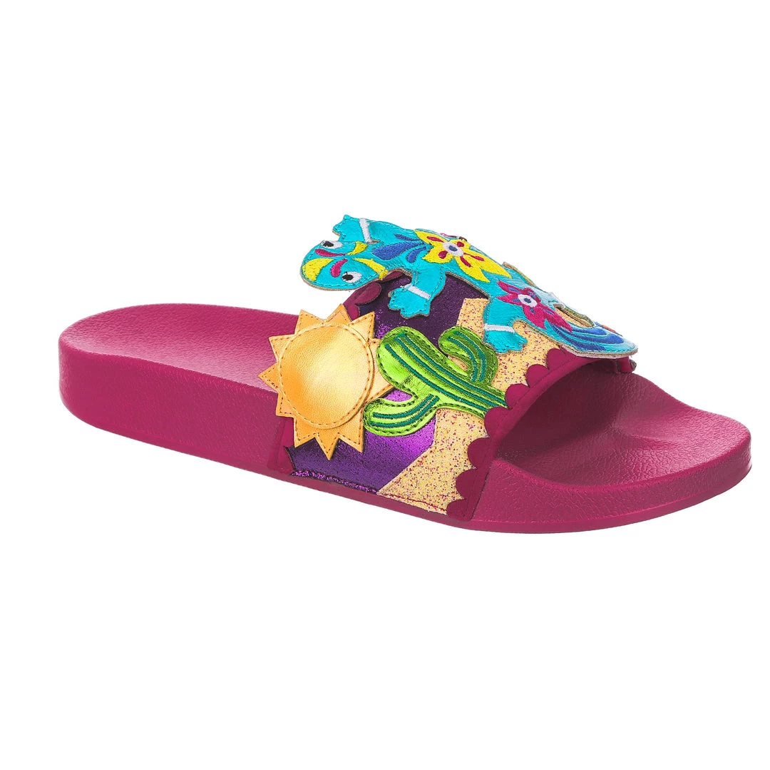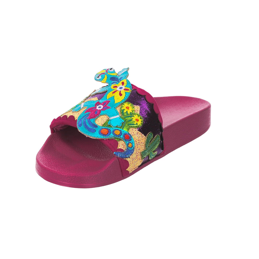 Want to slip in to something so salamader cool? These slides are ready to get up and gecko whenever you are! The hot pink comfy footbed is combined with bright and eyecatching lizard applique, complete with a cactus and sun too! So what are you waiting for? You know you iguana have them in your life!