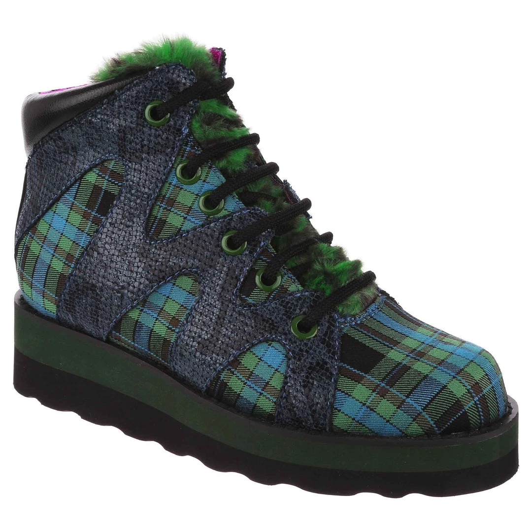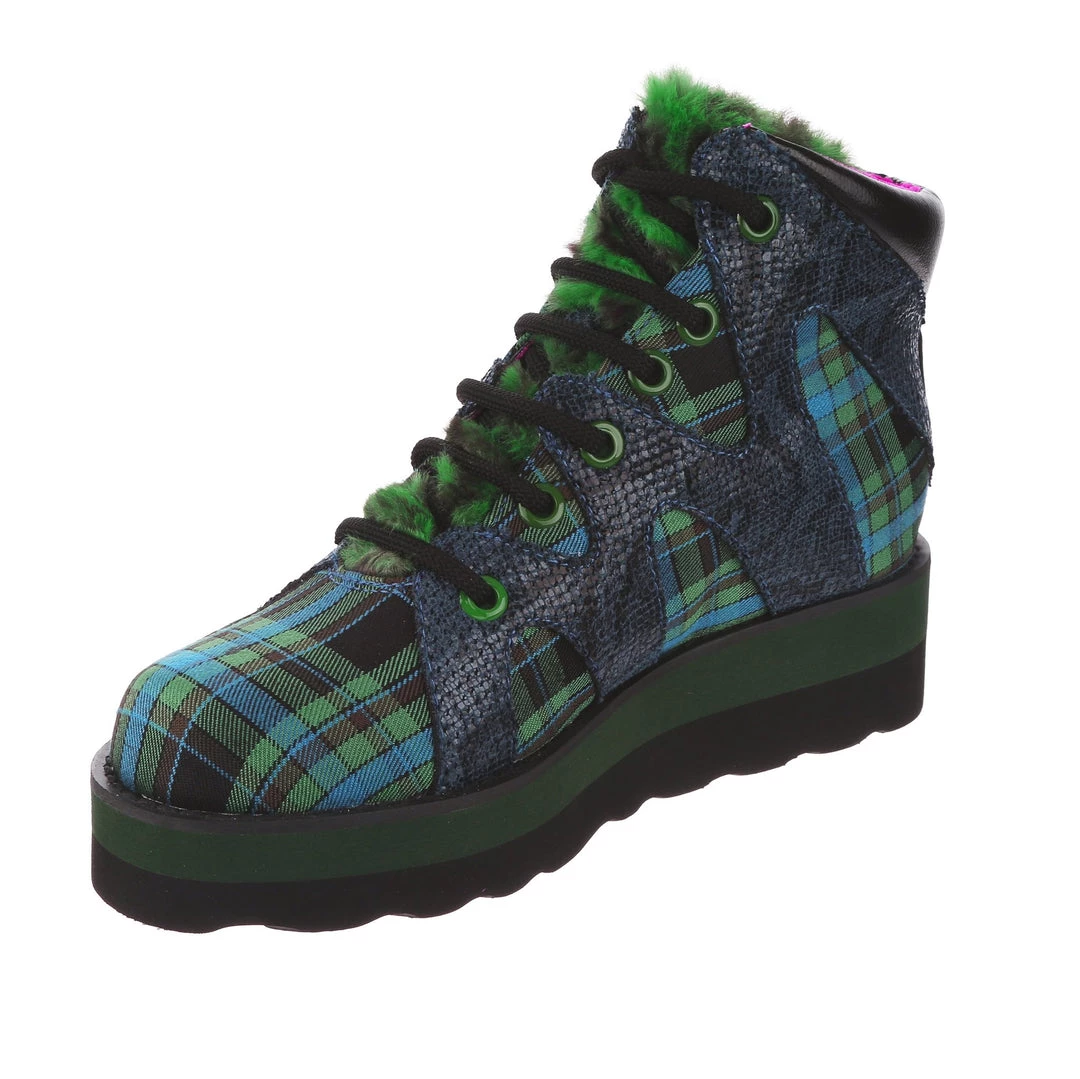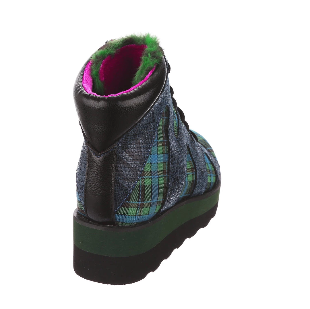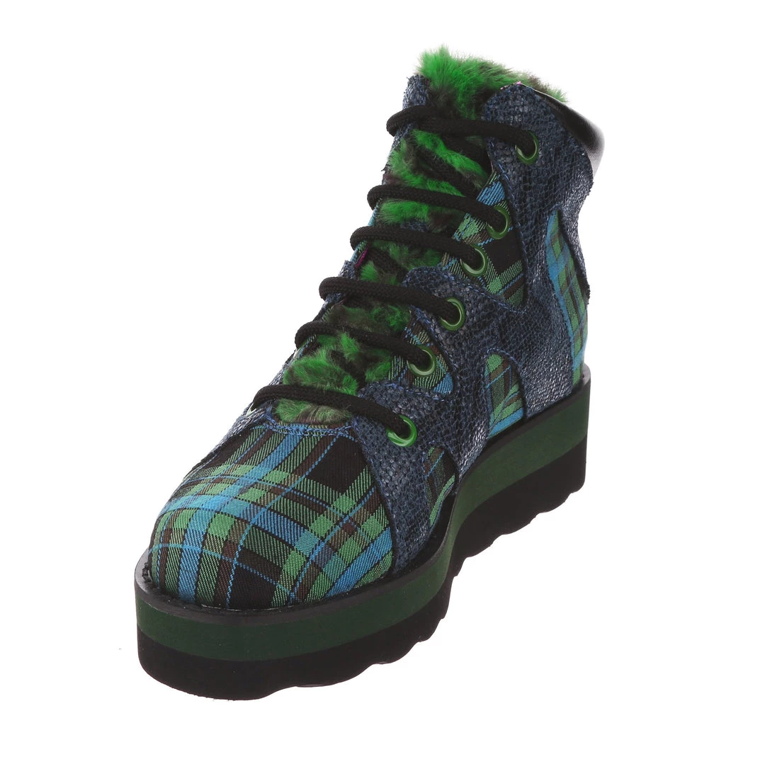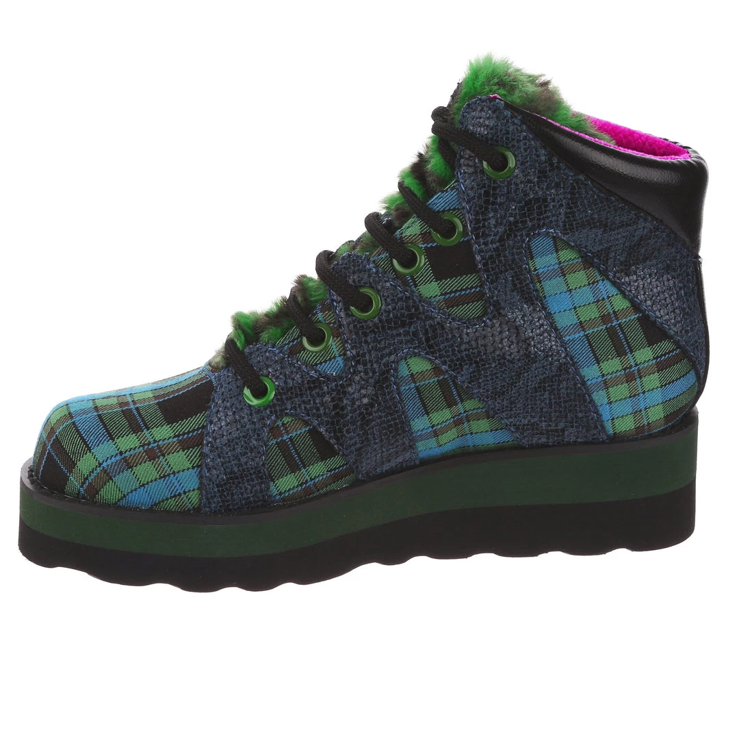 Lace-up into these awesome high tops! A striking dark blue snakeskin texture crisscrosses along the blue and green tartan upper, complemented by the tonal stacked sole and fun faux fur tongue! The perfect way to inject some texture and cool into your outfit!