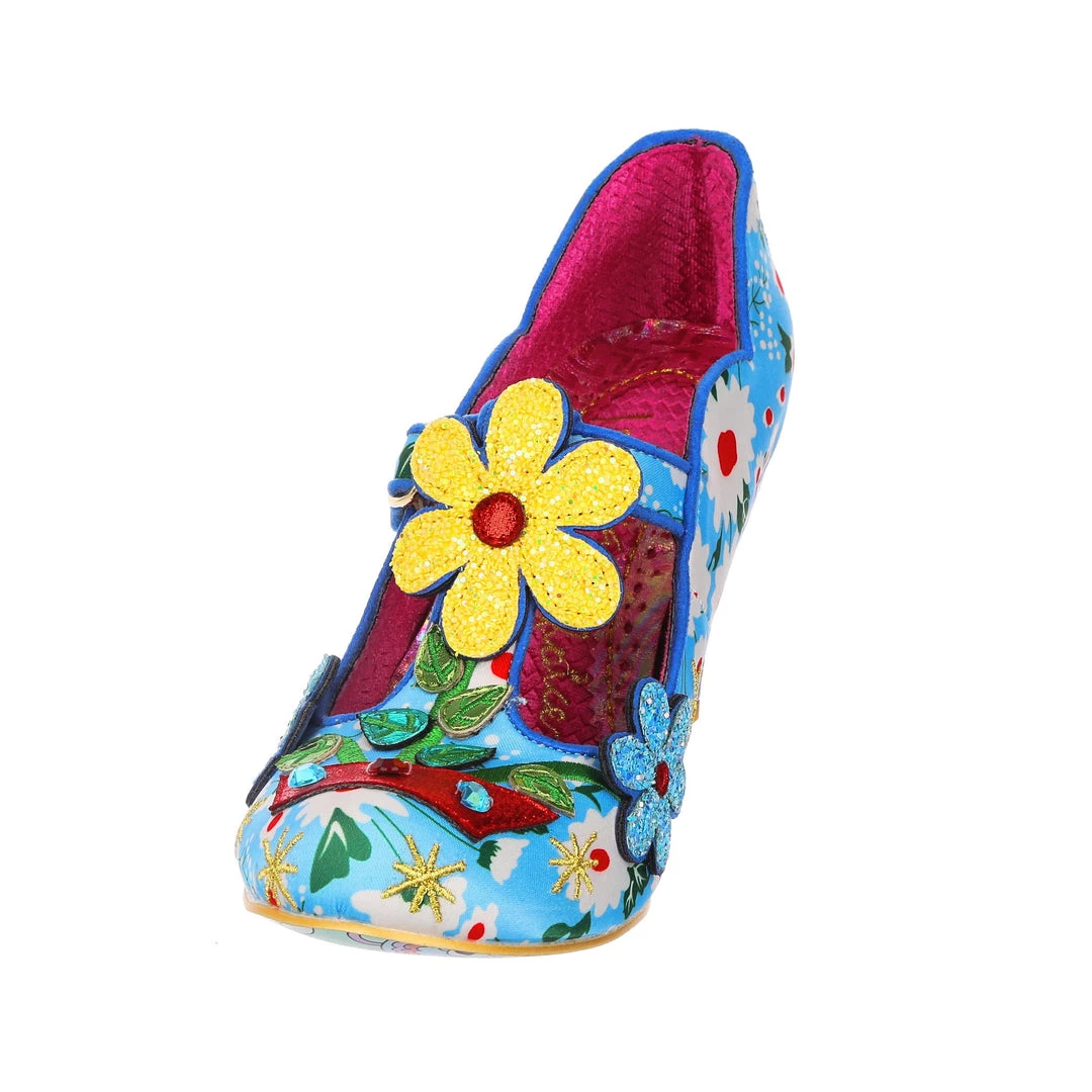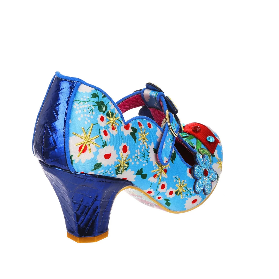 Potted and perfect, these house plant-tastic pretties are here for all you green fingered lovelies! A fabulous T-Bar strap is adorned with a fantastic beaded flower, stem and even a little pot on the toe! The main fabric is an eye catching blue based floral, which is paired with a dark blue metallic texture on the heel and piping! Add these floral mid heels to your collection today!