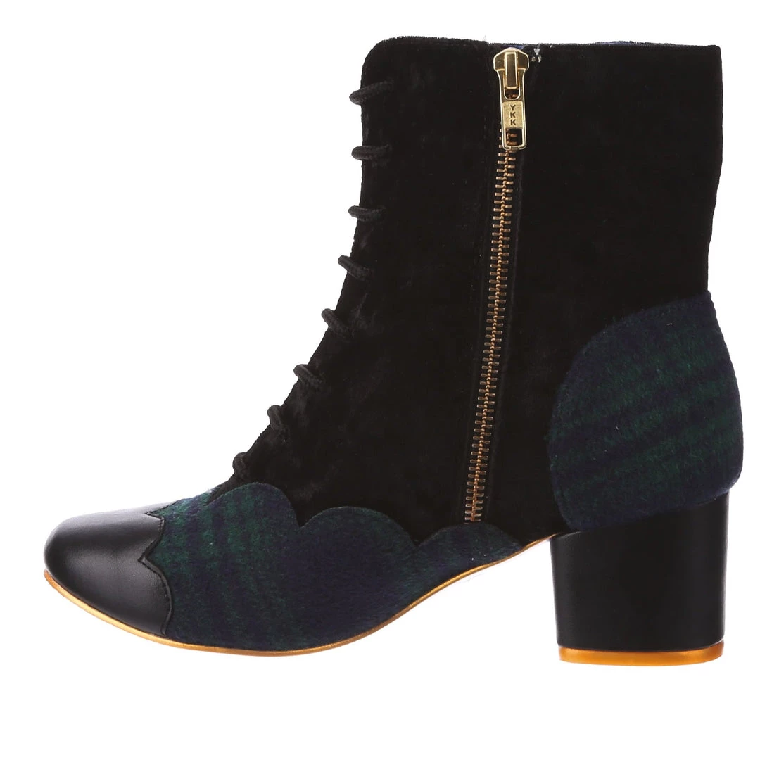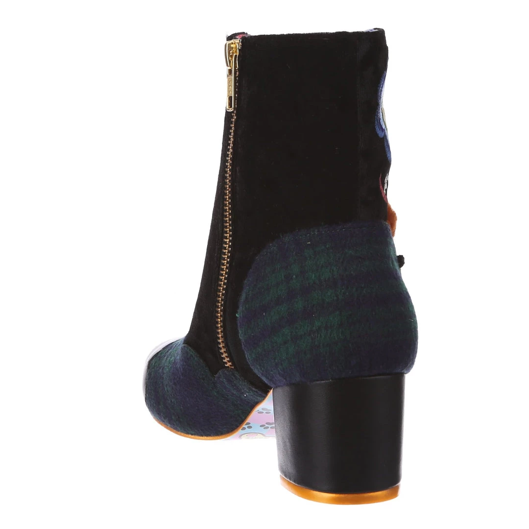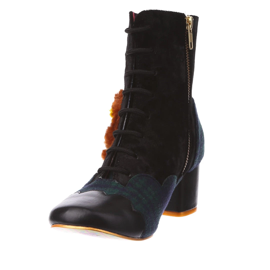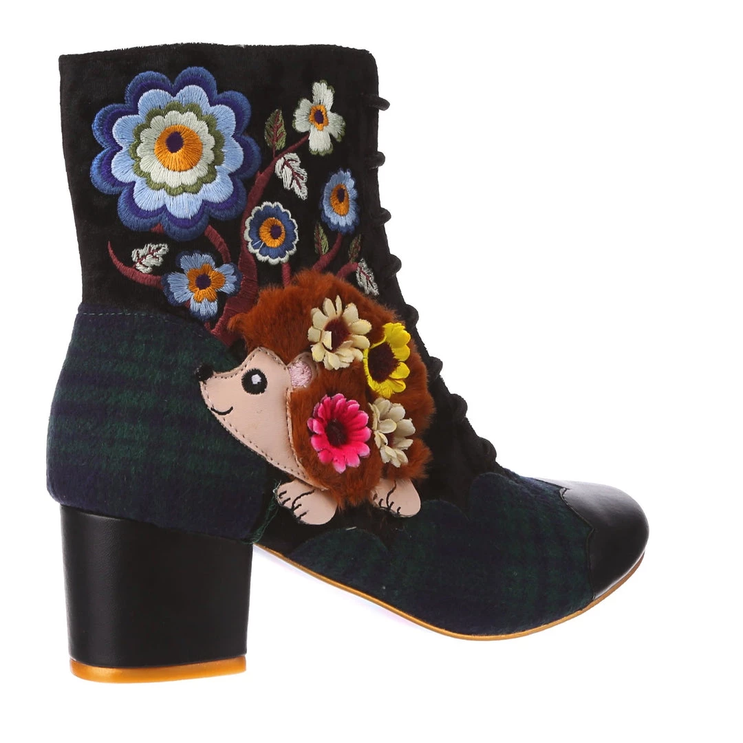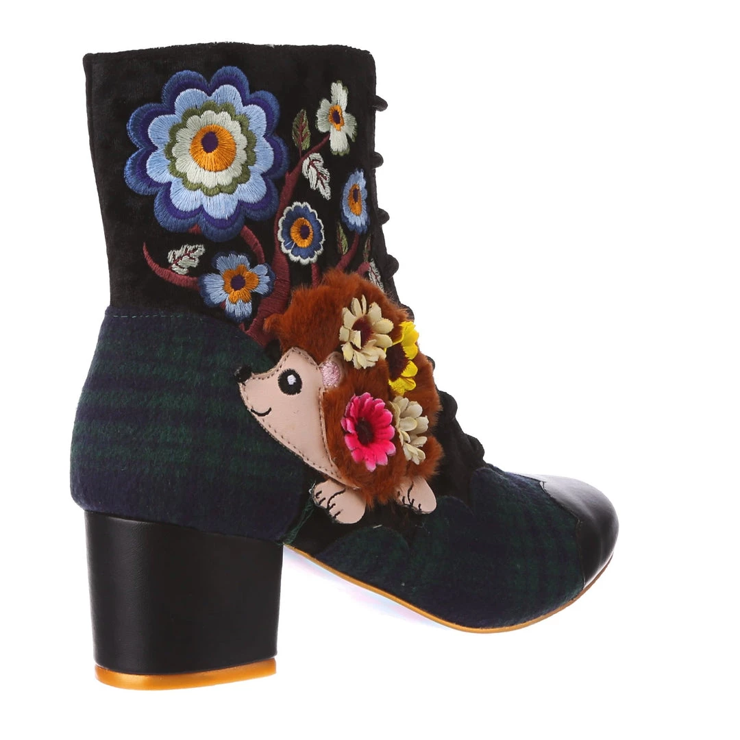 Wander through the forest and say hello to the wilderness! These adorable boots feature a 3D fluffy hedgehog, statement flowers and gorgeous floral embroidery. The fabulous blue tones of the flowers contrast beautifully to the deep black velvet on the upper, and are harmonious with the cosy green tone plaid which wraps around the rest of the boot. Lace up these beauties and have some fun today!