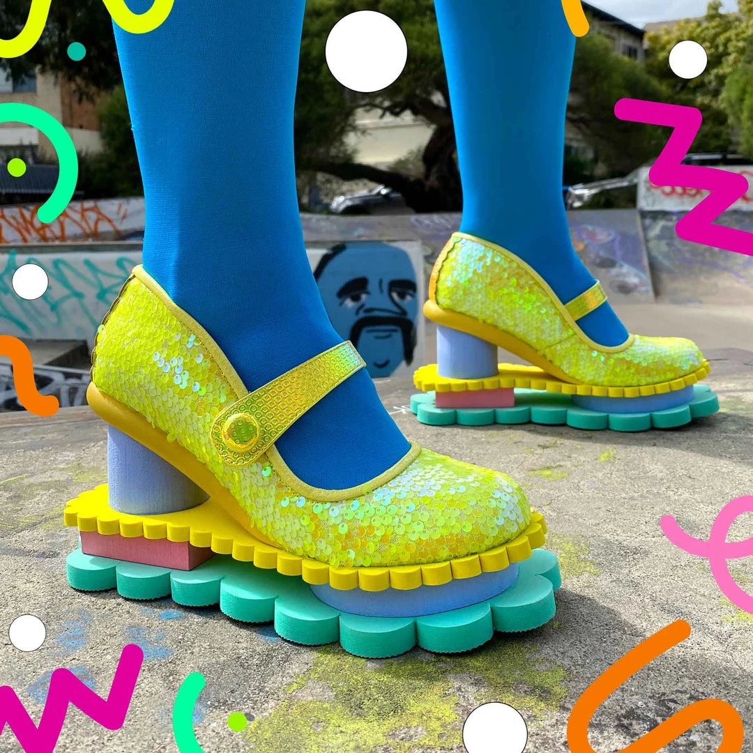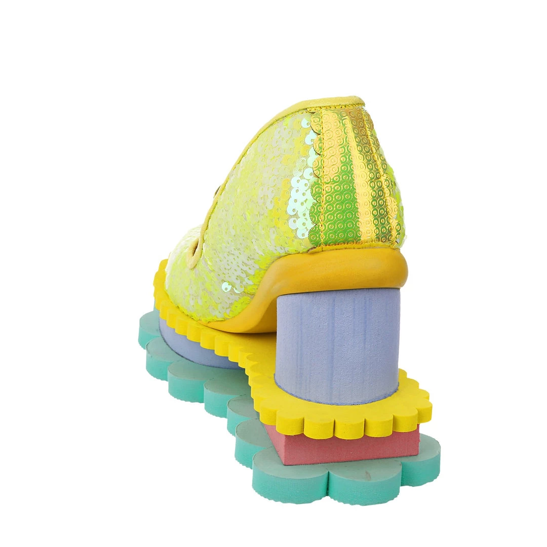 Give your outfit a SPLASH of colour in these special somethings! Bright and iridescent yellow sequins on the upper are combined with a matching iridescent Mary Jane strap and piping to give an overall appearance of magic! The eye-catching wedge heel is made from block colours in gorgeous pastel cookie-cutter inspired shapes – the perfect tasty addition to your wardrobe!