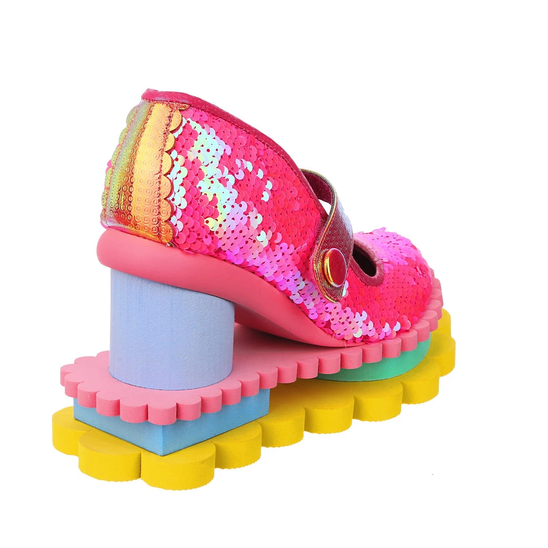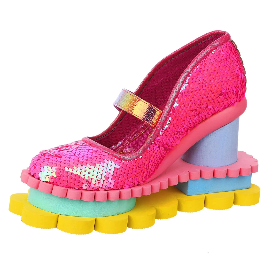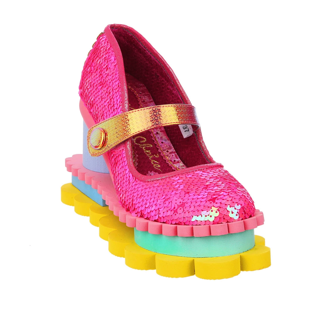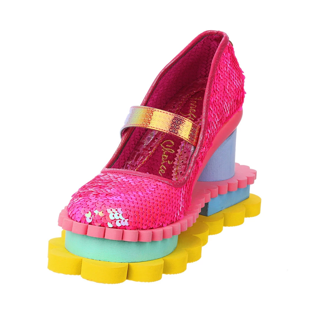 Give your outfit a SPLASH of colour in these special somethings! Bright and neon pink sequins on the upper are combined with an iridescent Mary Jane strap and piping to give an overall appearance of magic! The eye-catching wedge heel is made from block colours in gorgeous pastel cookie-cutter inspired shapes – the perfect tasty addition to your wardrobe!