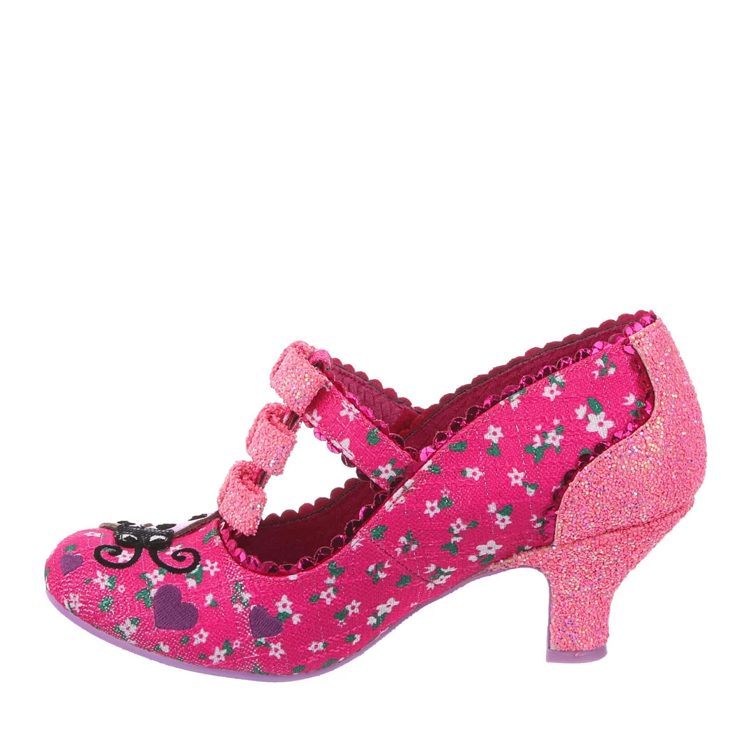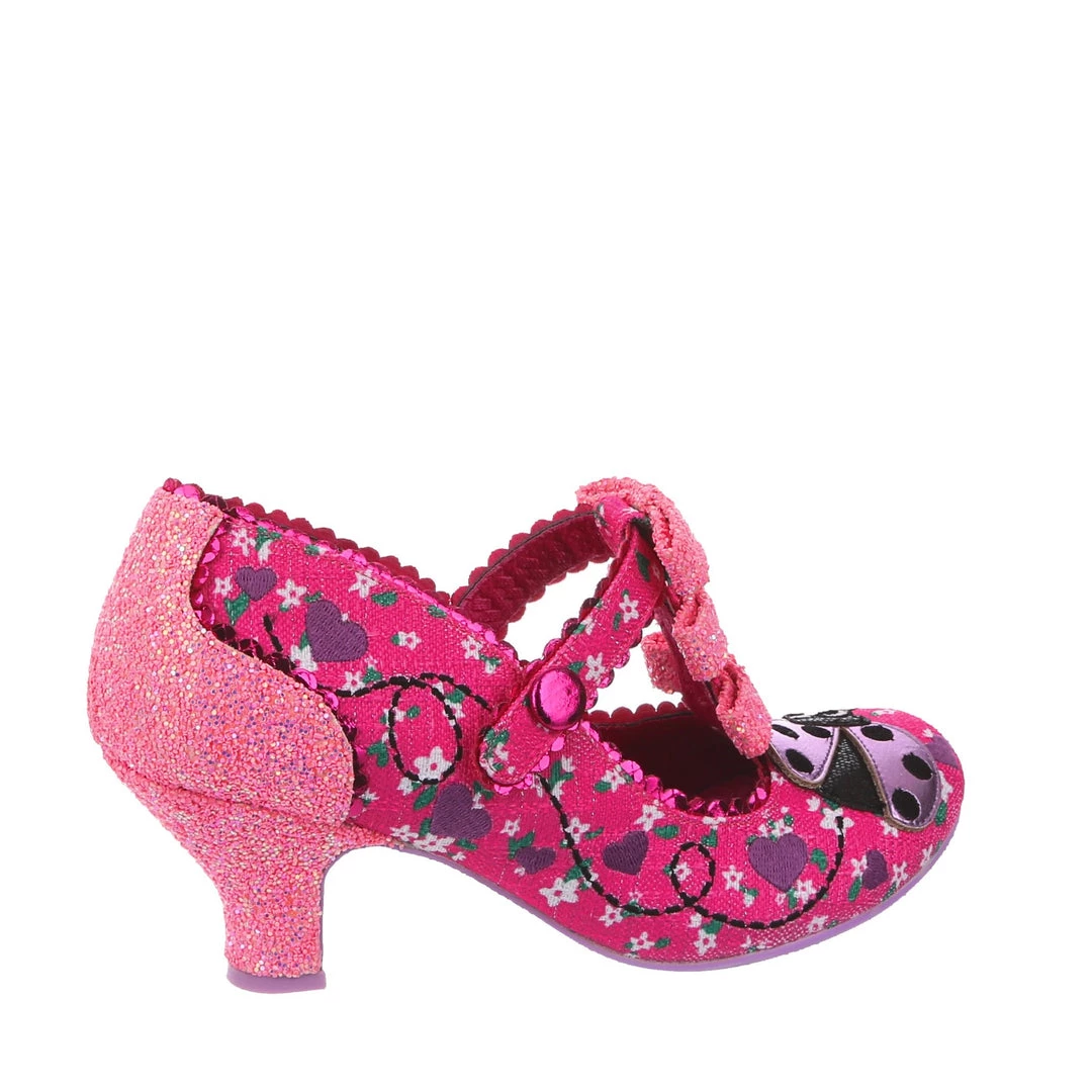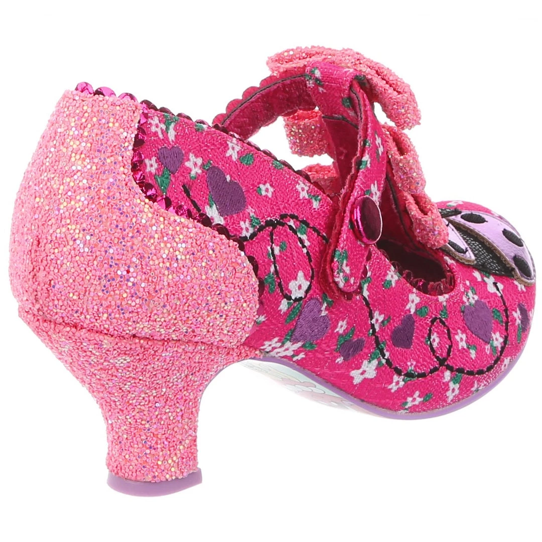 Flying along through the hedgerows its a lovely little ladybug! Swirling lines criss cross along the darling hot pink floral fabric leading to the adorable little lavender ladybug applique on the toe with matching embroidered hearts! The pink T-Bar straps are also adorned with three little pink glitter encrusted bows along the front strap! Perfect and prim, add them to your life today!