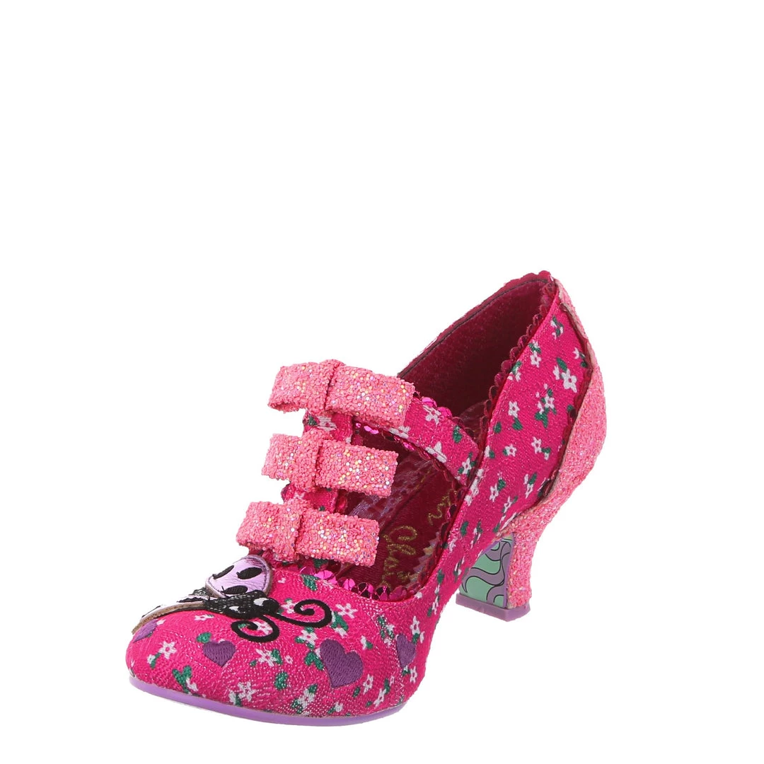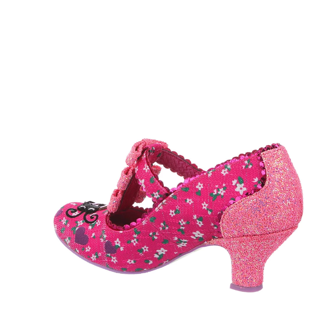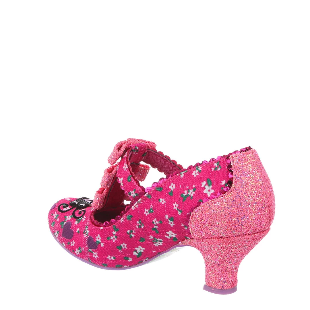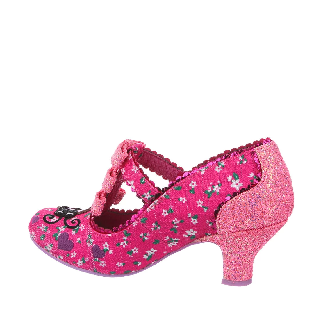 Flying along through the hedgerows its a lovely little ladybug! Swirling lines criss cross along the darling hot pink floral fabric leading to the adorable little lavender ladybug applique on the toe with matching embroidered hearts! The pink T-Bar straps are also adorned with three little pink glitter encrusted bows along the front strap! Perfect and prim, add them to your life today!