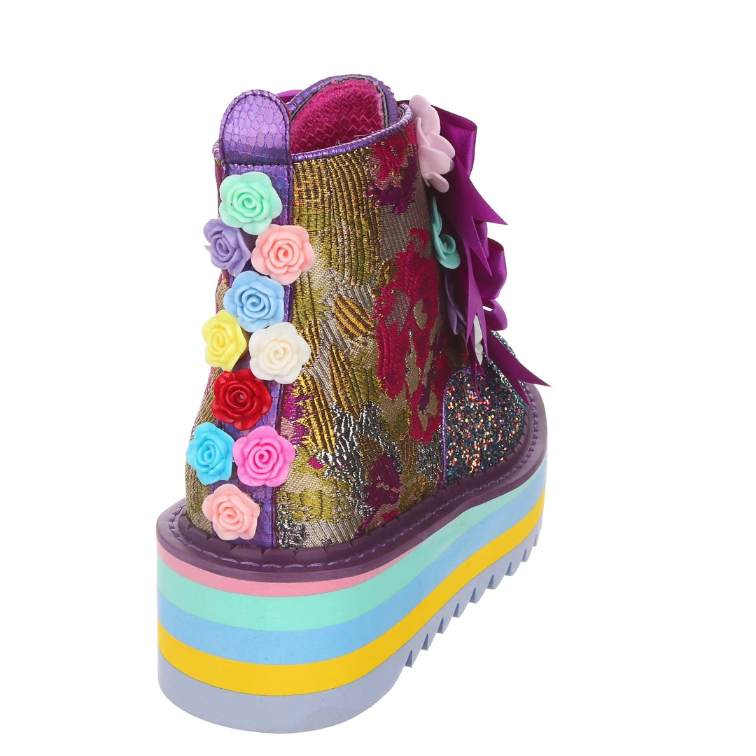 Covered in bows, these boots are a combination of textures, from the purple ribbons on the laces, to the tapestry brocade in gold, pinks and green on the side, to the sparkling purple glitter on the toe, these lovelies are sure to turn heads! Little details like the multicoloured roses along the back, and the stacked sole with a jagged tread give these shoes a bit of a bright streetwear feel, perfect to give your outfit that boost you’ve been looking for!