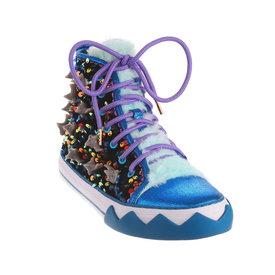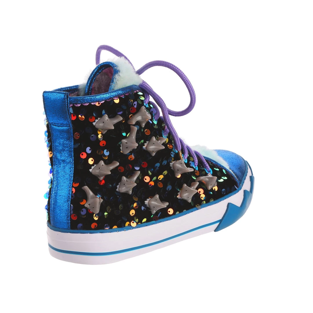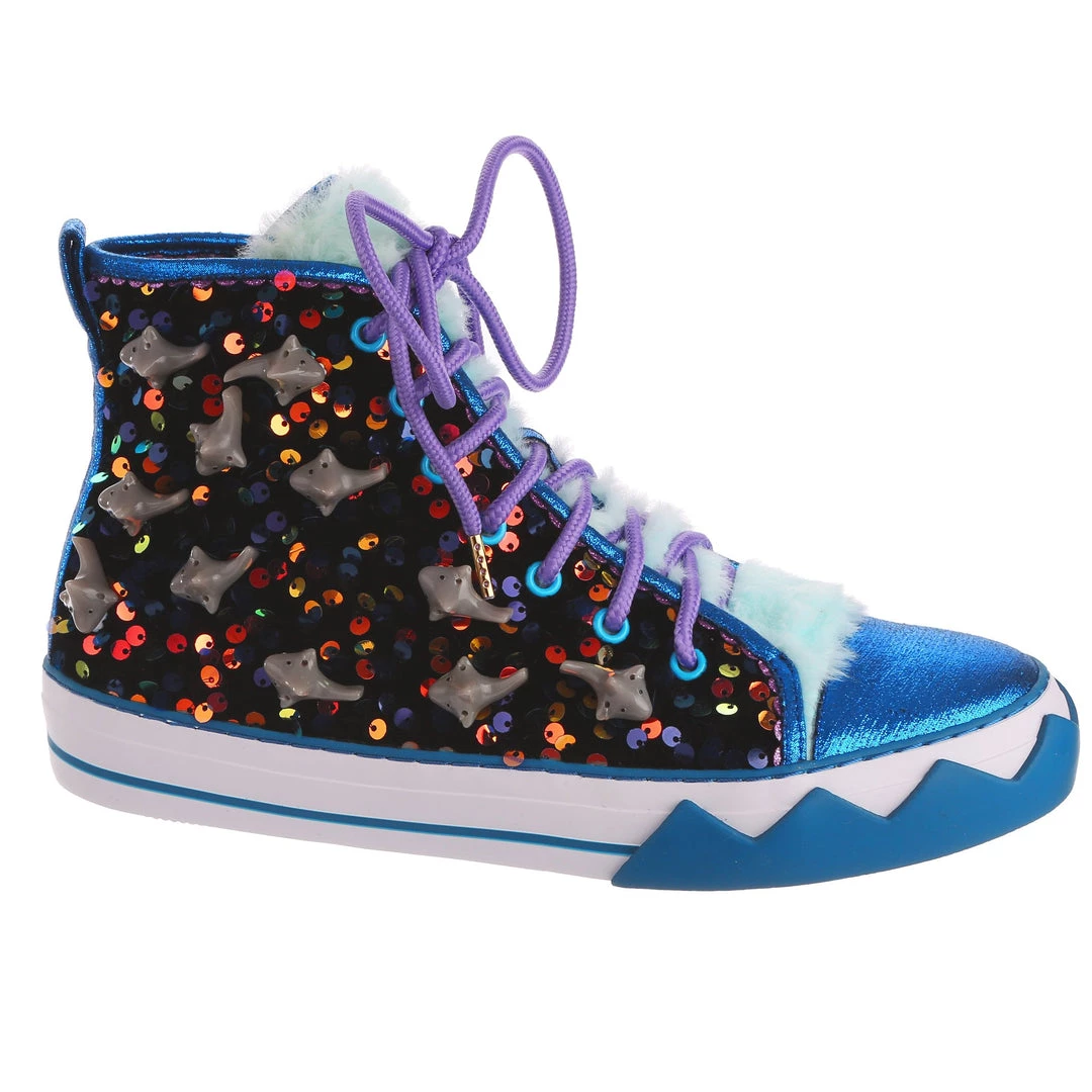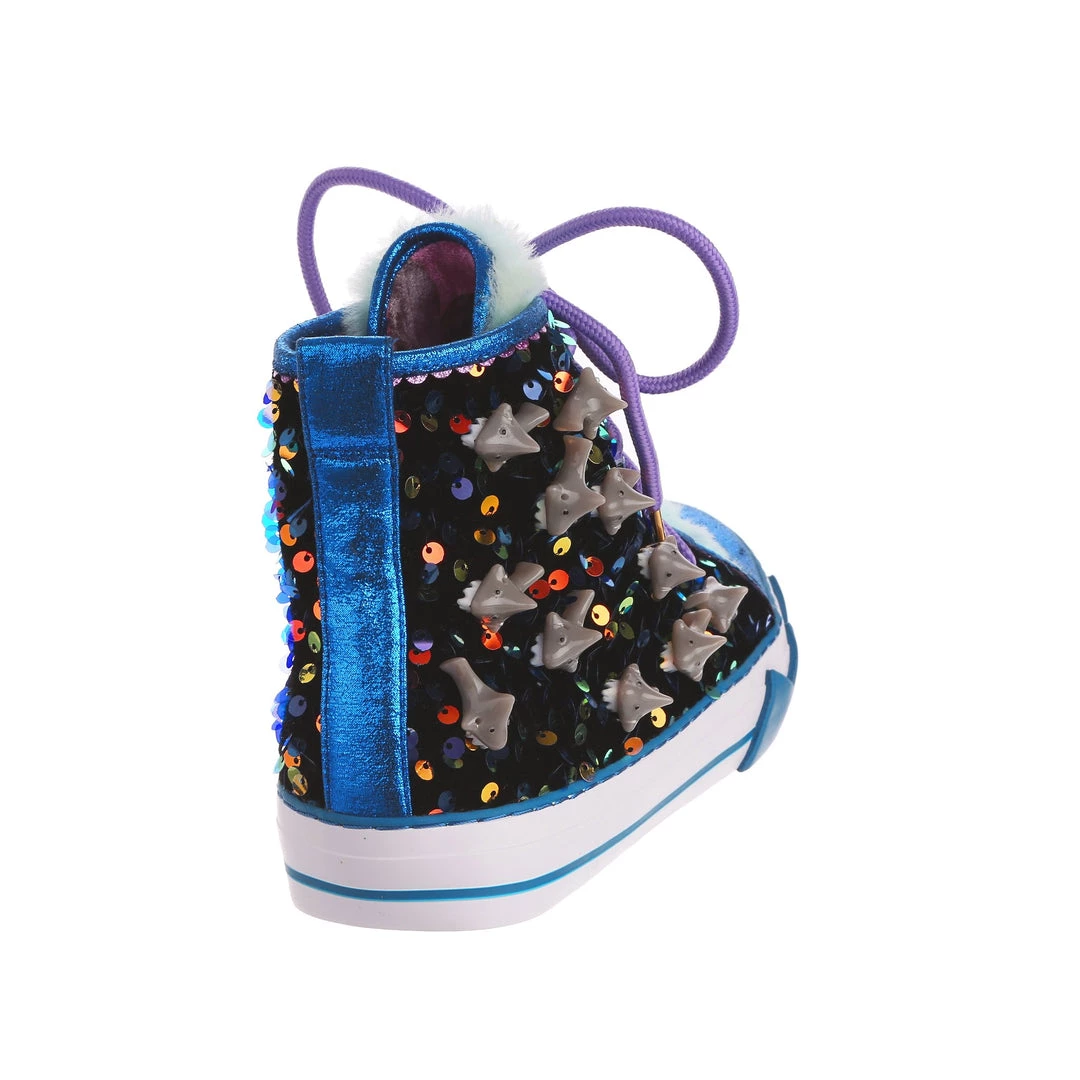 Look a shark, do do, do do do do! Shimmering sequins that look like the sea at night and adorable shark decorations cover these lace up high tops, with a contrasting fluffy aqua tongue for a softer touch. Finished with eye-catching metallic blue piping and toe and lilac laces, these really are the trainers for all seasons! Get your jaws round these before they’re all gone!