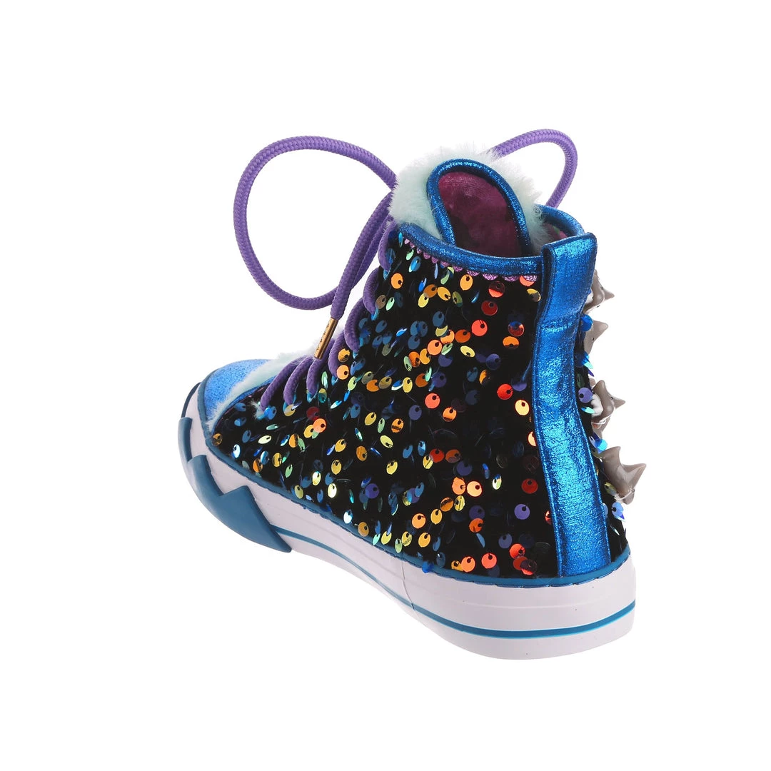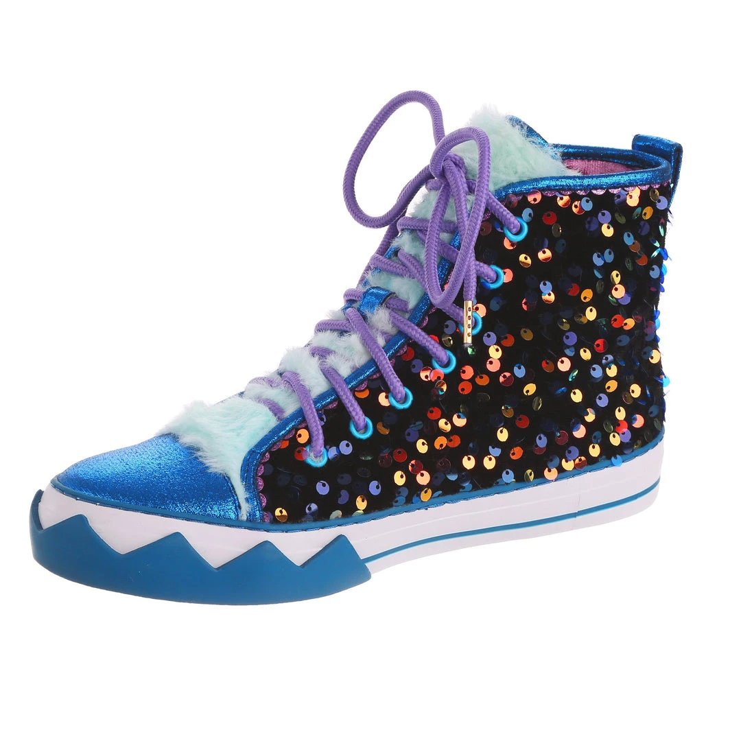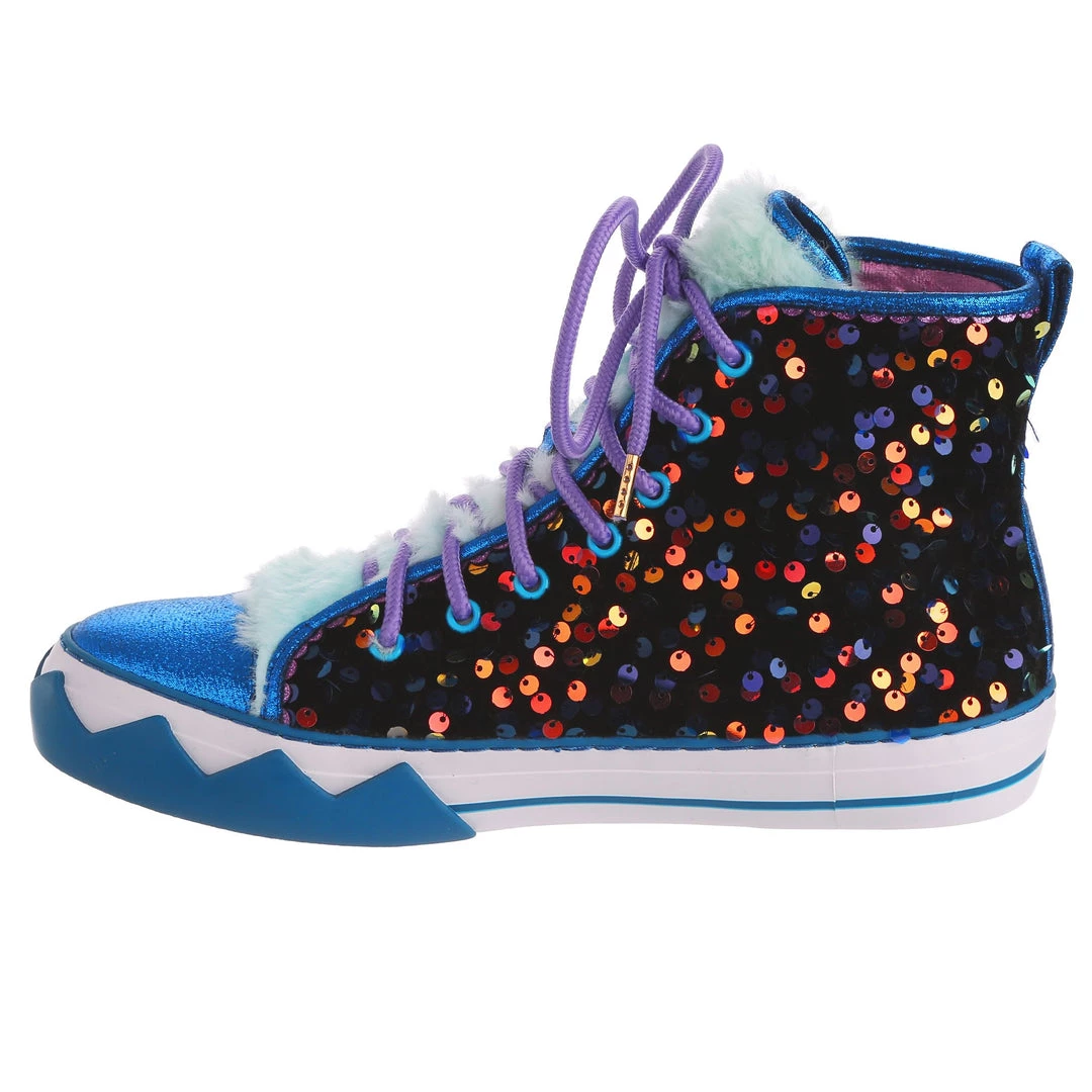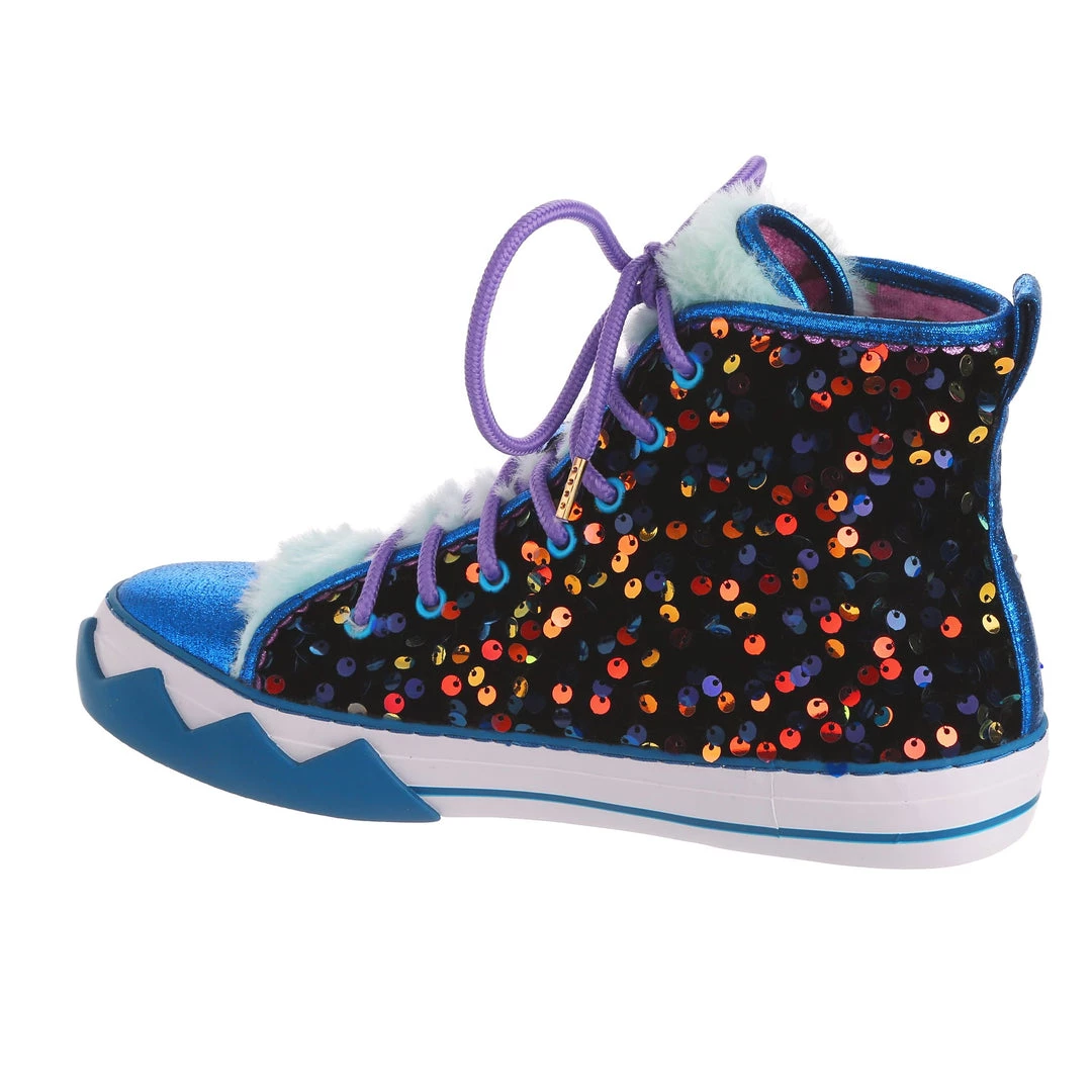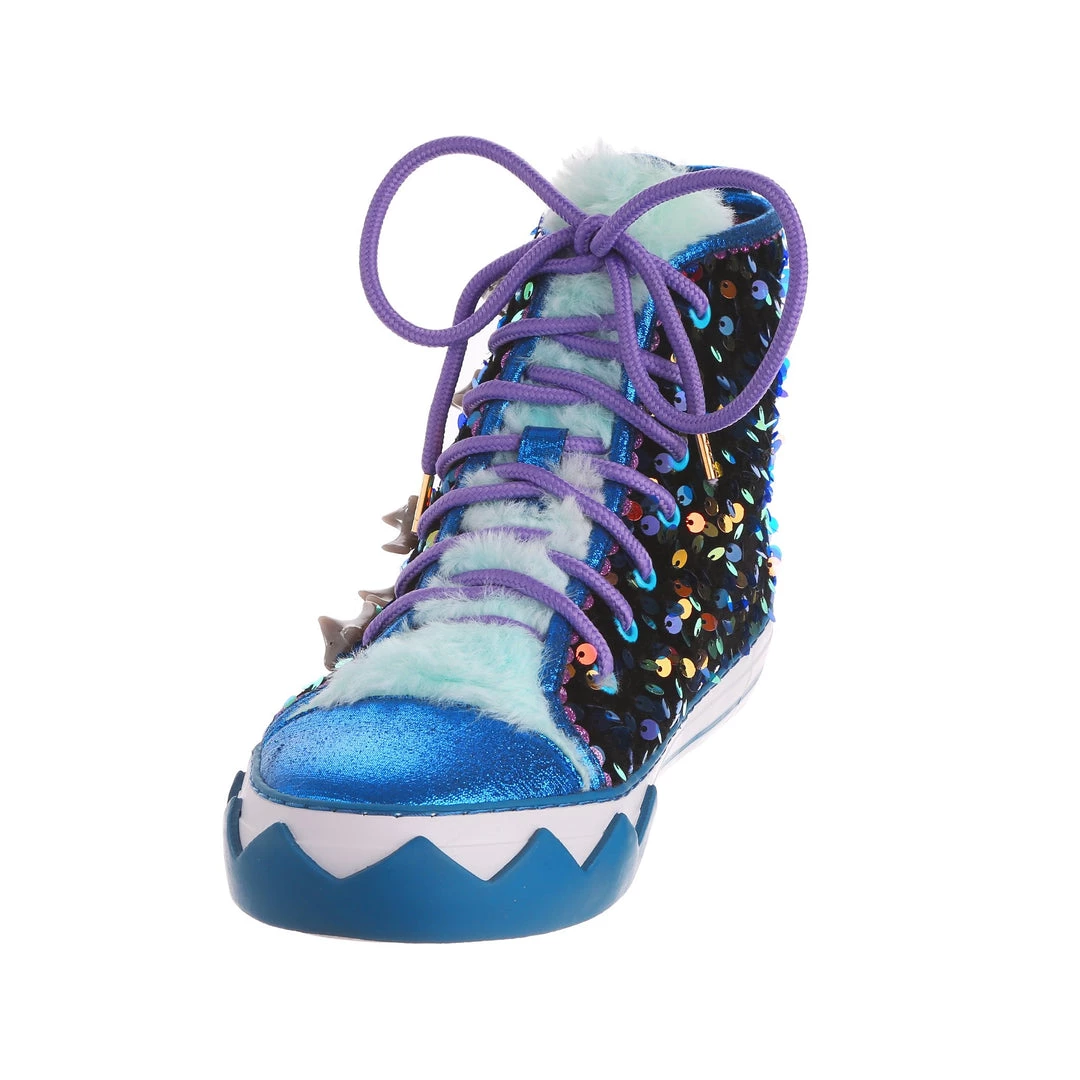 Look a shark, do do, do do do do! Shimmering sequins that look like the sea at night and adorable shark decorations cover these lace up high tops, with a contrasting fluffy aqua tongue for a softer touch. Finished with eye-catching metallic blue piping and toe and lilac laces, these really are the trainers for all seasons! Get your jaws round these before they’re all gone!