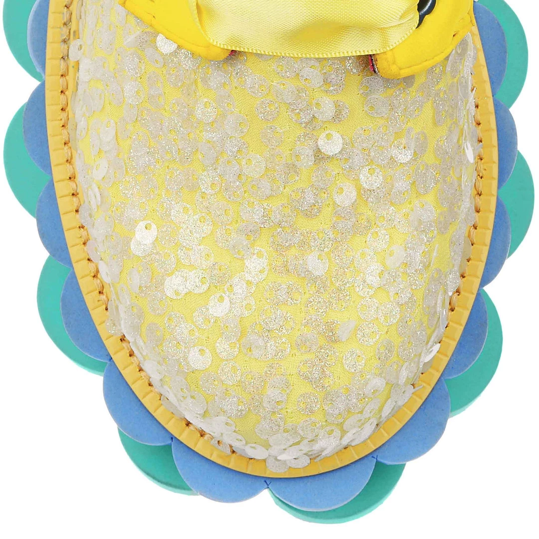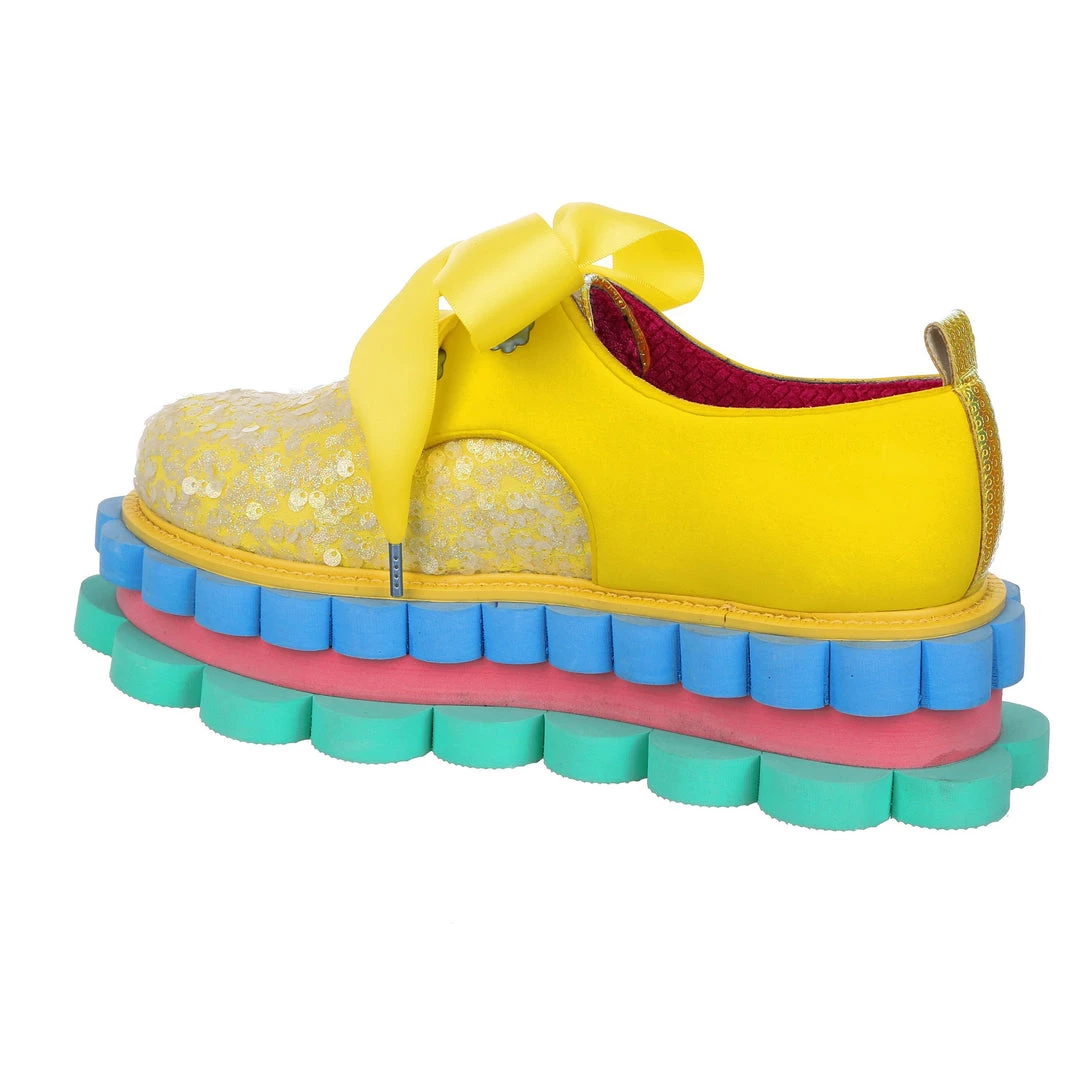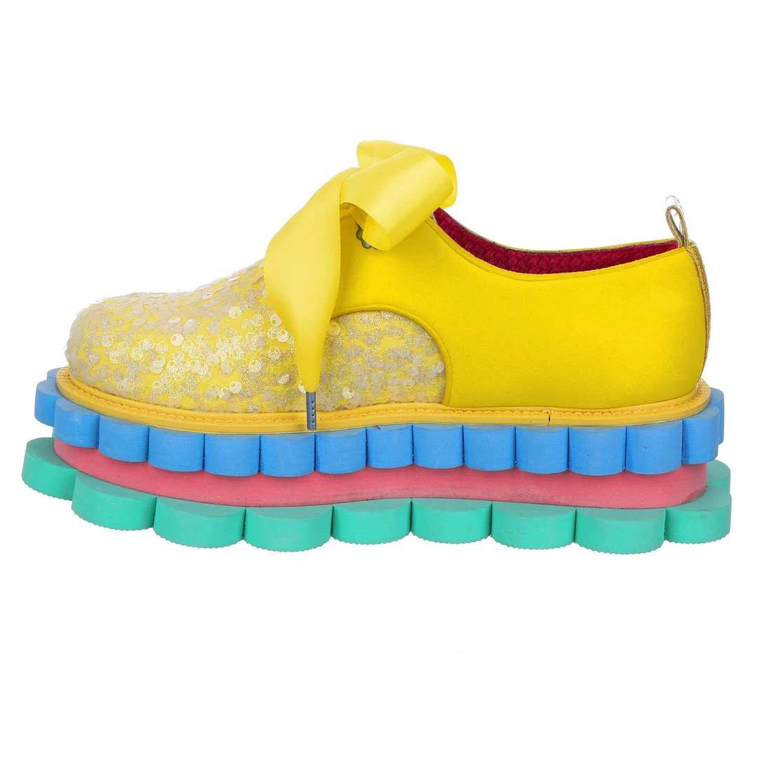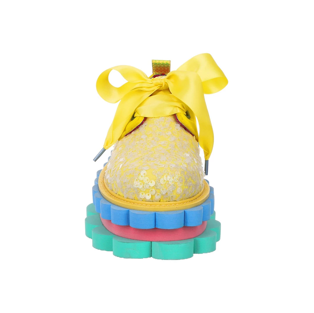Perfect to add a POP of colour to any outfit these bright flatforms are your new wardrobe fave! With an upper of a unique yellow foamy texture with sparkly silver sequins and a ribbon lace, the real super star of these shoes is the sole! Triple stacked scalloped and special, these block colour layers are here to take your outfit to the next level – give them a go today!