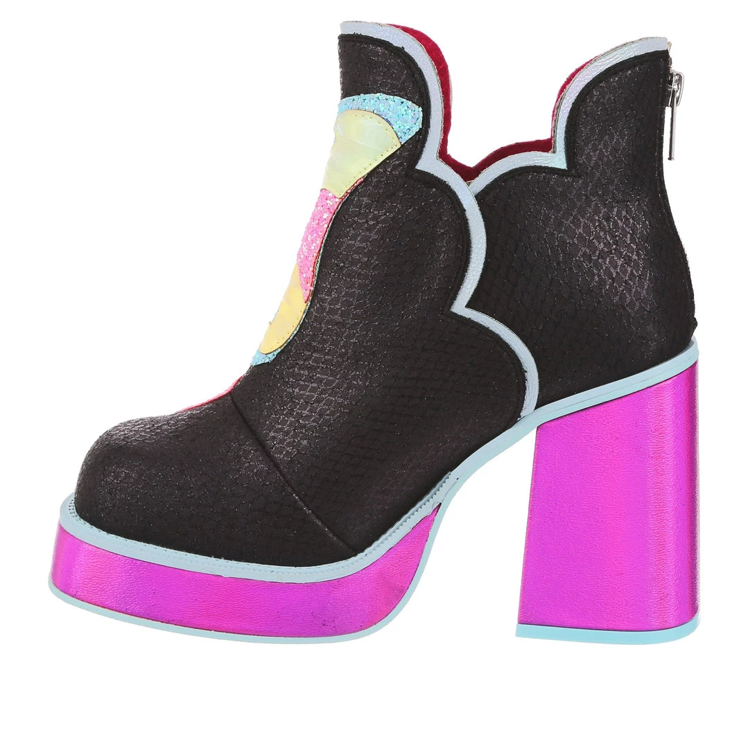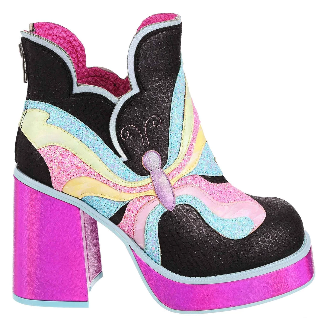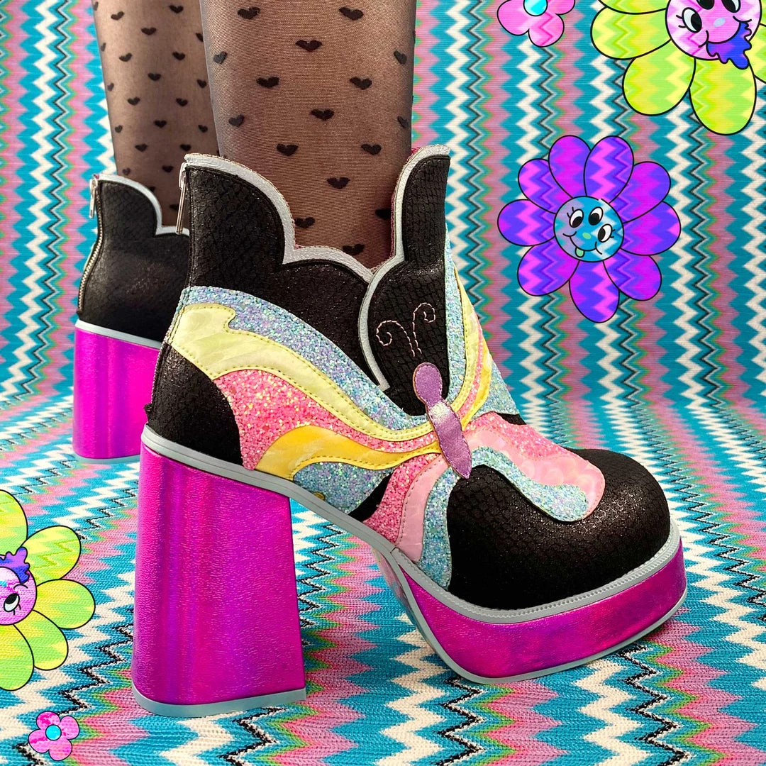 Fluttering and fabulous, these funky platforms are here to get you groovin! Featuring a stunning butterfly made of gorgeous glitter panels in shades of blue, pink and yellow combined on top of the gorgeous black metallic upper, which is contrasted to the bright fuschia heel and platform giving you the ultimate statement shoe! Slip them on and have a little boogie!