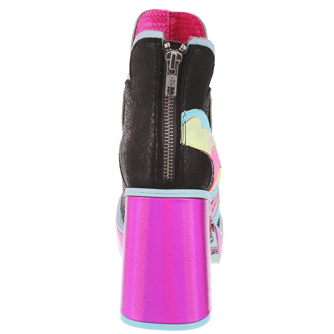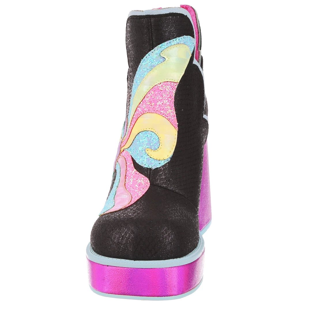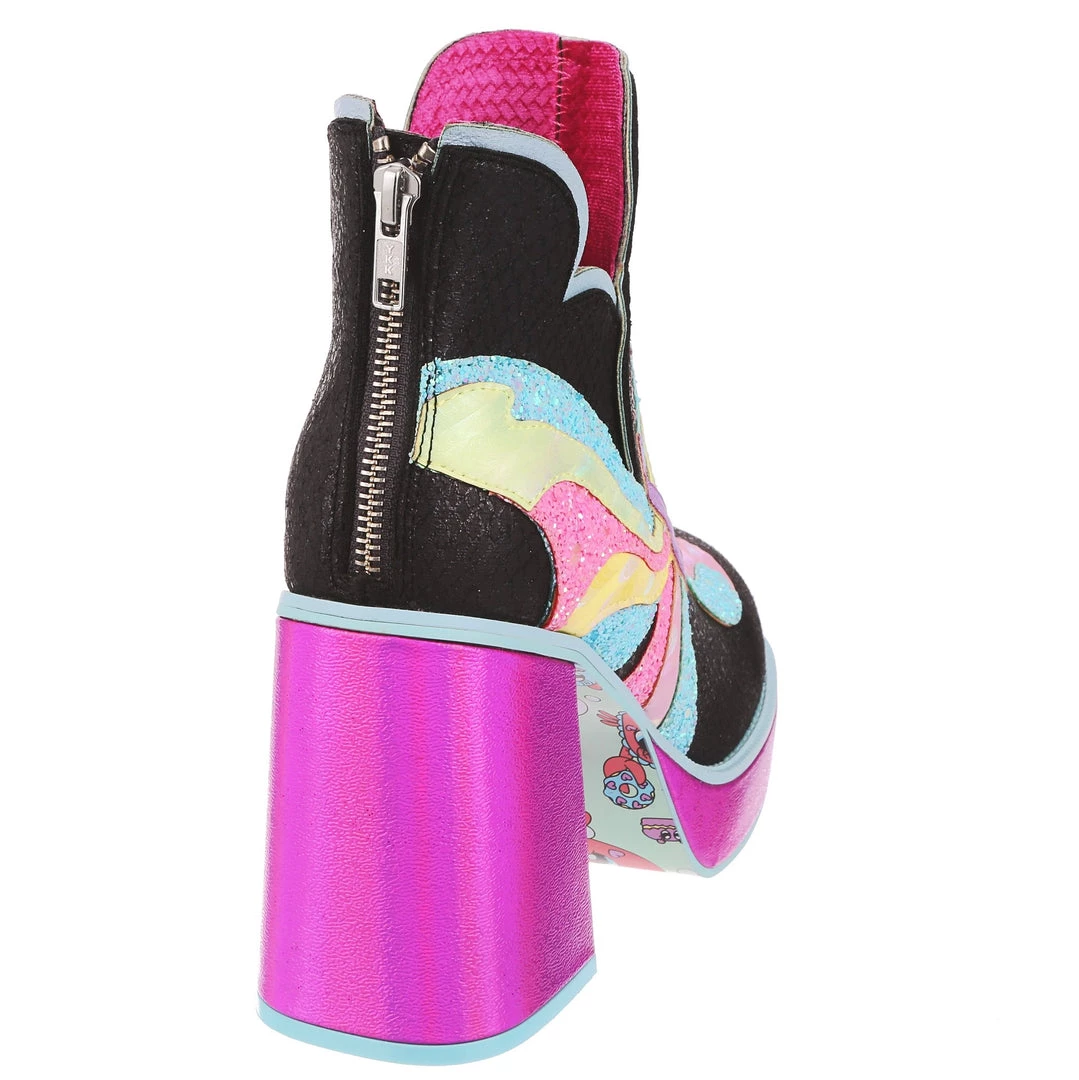 Fluttering and fabulous, these funky platforms are here to get you groovin! Featuring a stunning butterfly made of gorgeous glitter panels in shades of blue, pink and yellow combined on top of the gorgeous black metallic upper, which is contrasted to the bright fuschia heel and platform giving you the ultimate statement shoe! Slip them on and have a little boogie!
