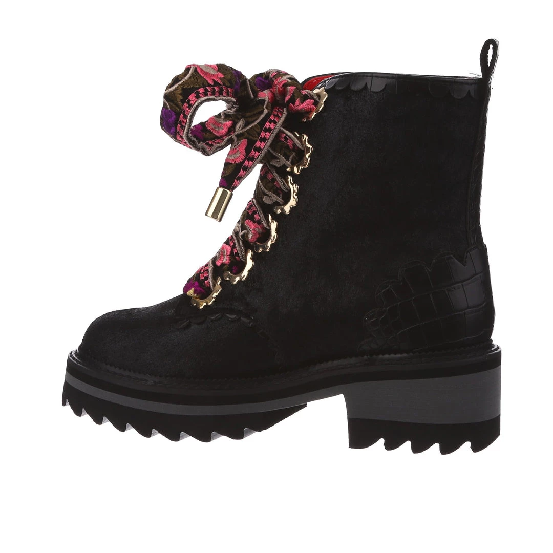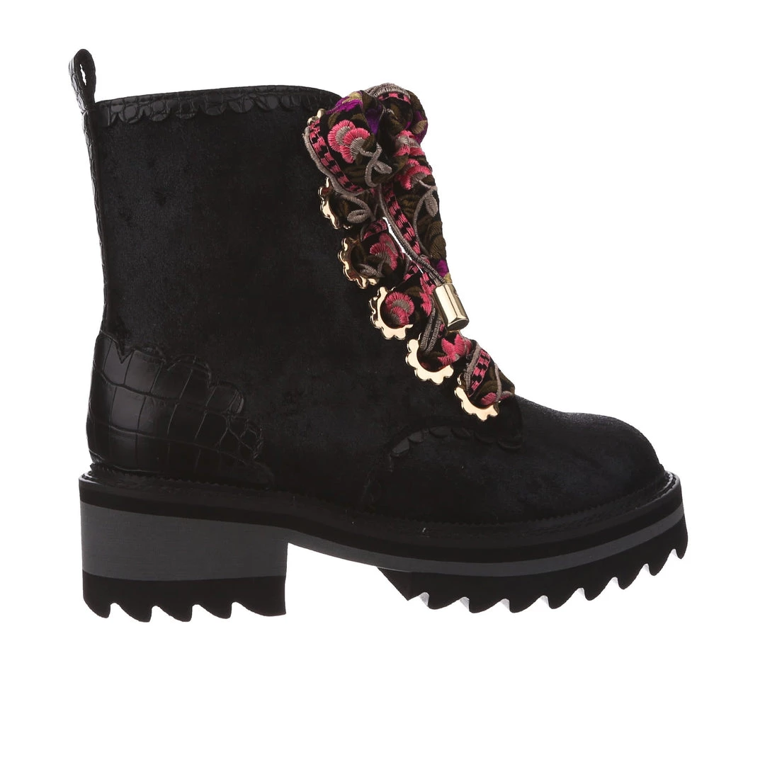 A great staple for your wardrobe, these boots are fun, comfy and practical – all with an irregular twist! Sumptuous black crushed velvet is wrapped around the upper, paired with matching glossy crocodile texture and gorgeous golden oversized eyelets in the shape of flowers! The laces are a spectacular woven fabric, with just a hint of mixed pinks in the pattern to really make these beauties pop! Add them to your wardrobe and up your boot game today!