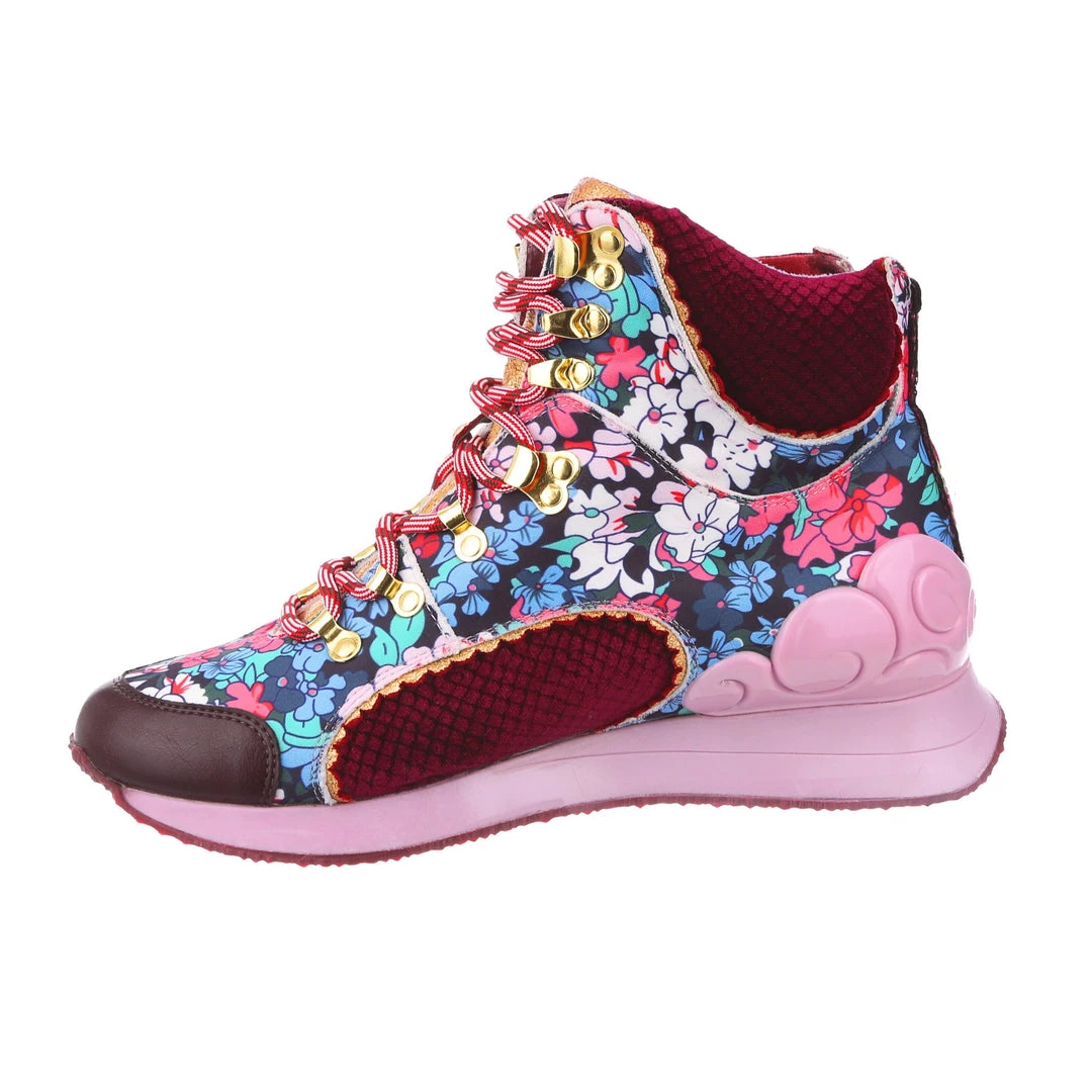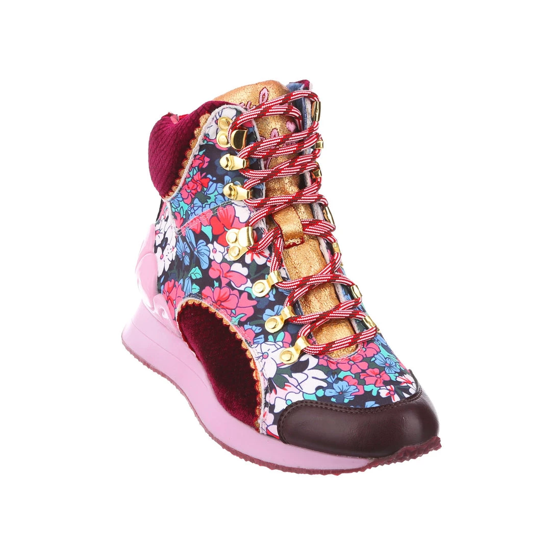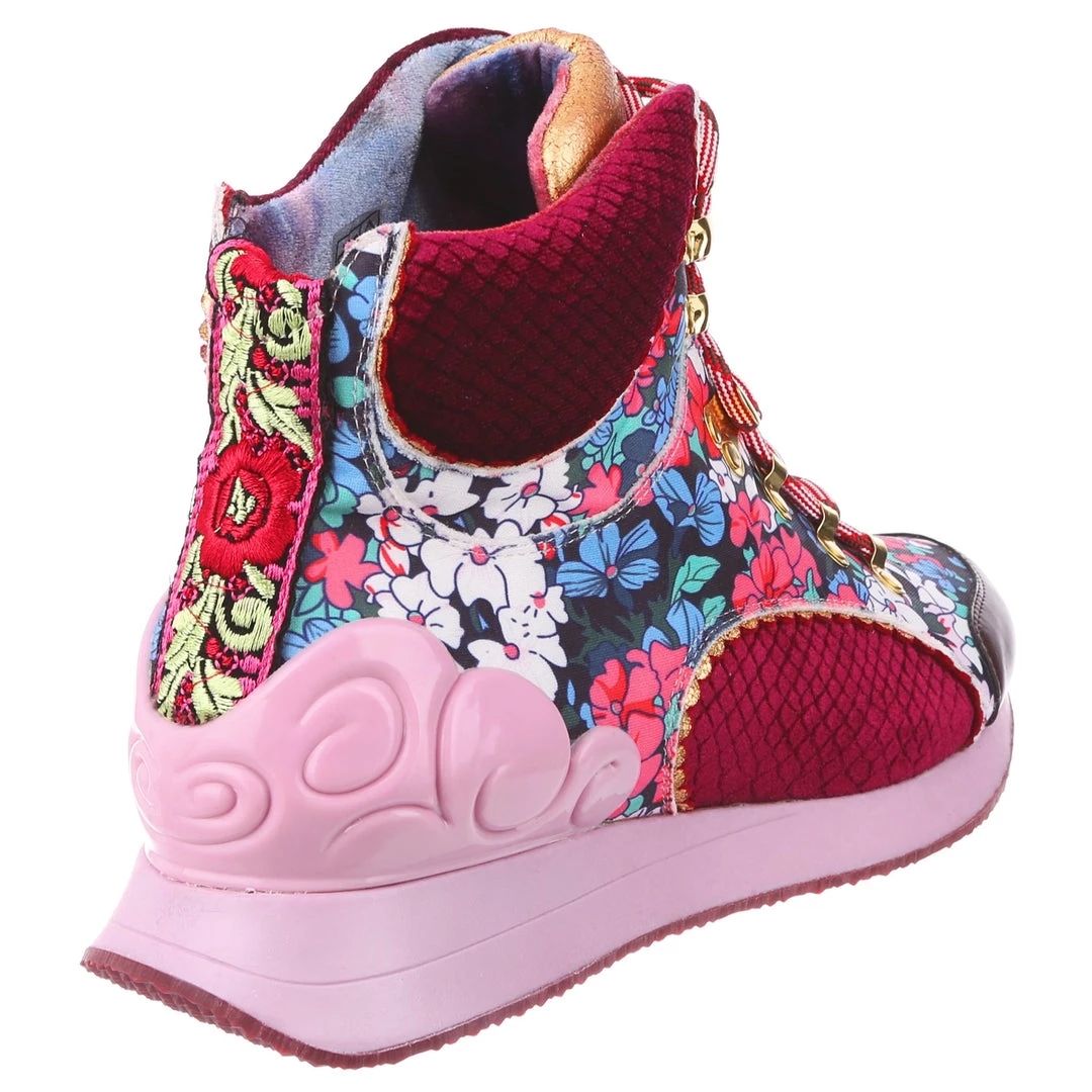 Take your glam on the go with these awesome high tops! The perfect mix of quirky and cool, these trainers have everything you need. The heel is cupped by a fabulous rolling baby pink cloud, which matches the athletic inspired sole. The upper is the real star of the show, with gorgeous burgundy velvet panels flowing into striking retro seveties florals! Gold hardware is paired with a braided red lace to really take these beauties over the edge – add them to your collection today, you won’t regret it!