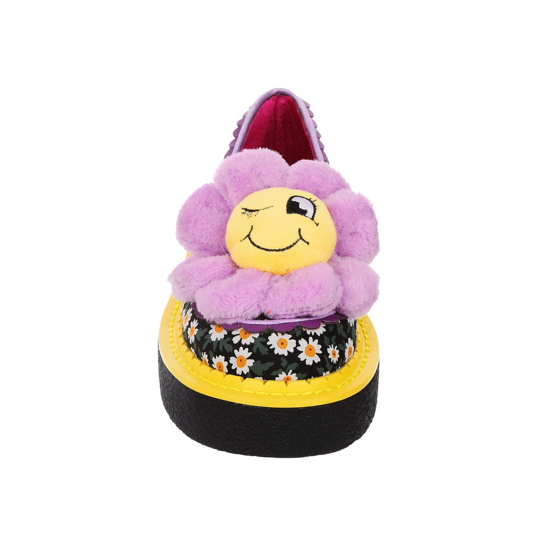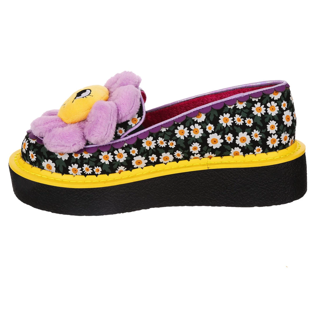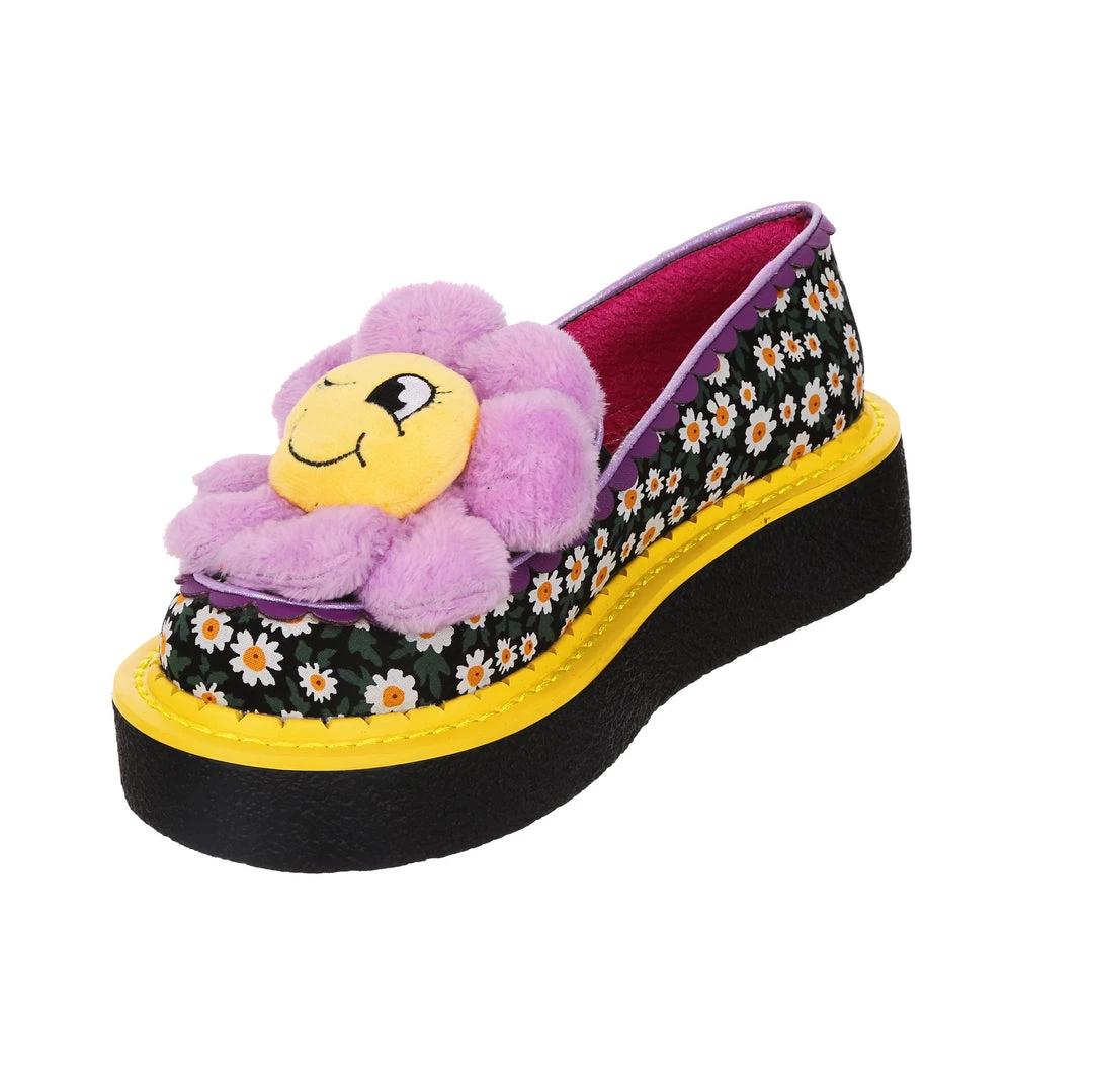 Add some floral fun to your wardrobe today! These slip on sassy flatform shoes are sure to put a smile on your face, featuring a 3D plush purple and yellow flower on the toe, which is paired with the gorgeous black based floral upper fabric! Little details include the purple scalloping and piping along the top edge, linking to the adorable applique hearts on the side! So pop these platforms on and get grooving!