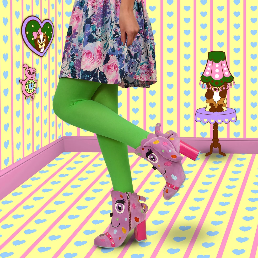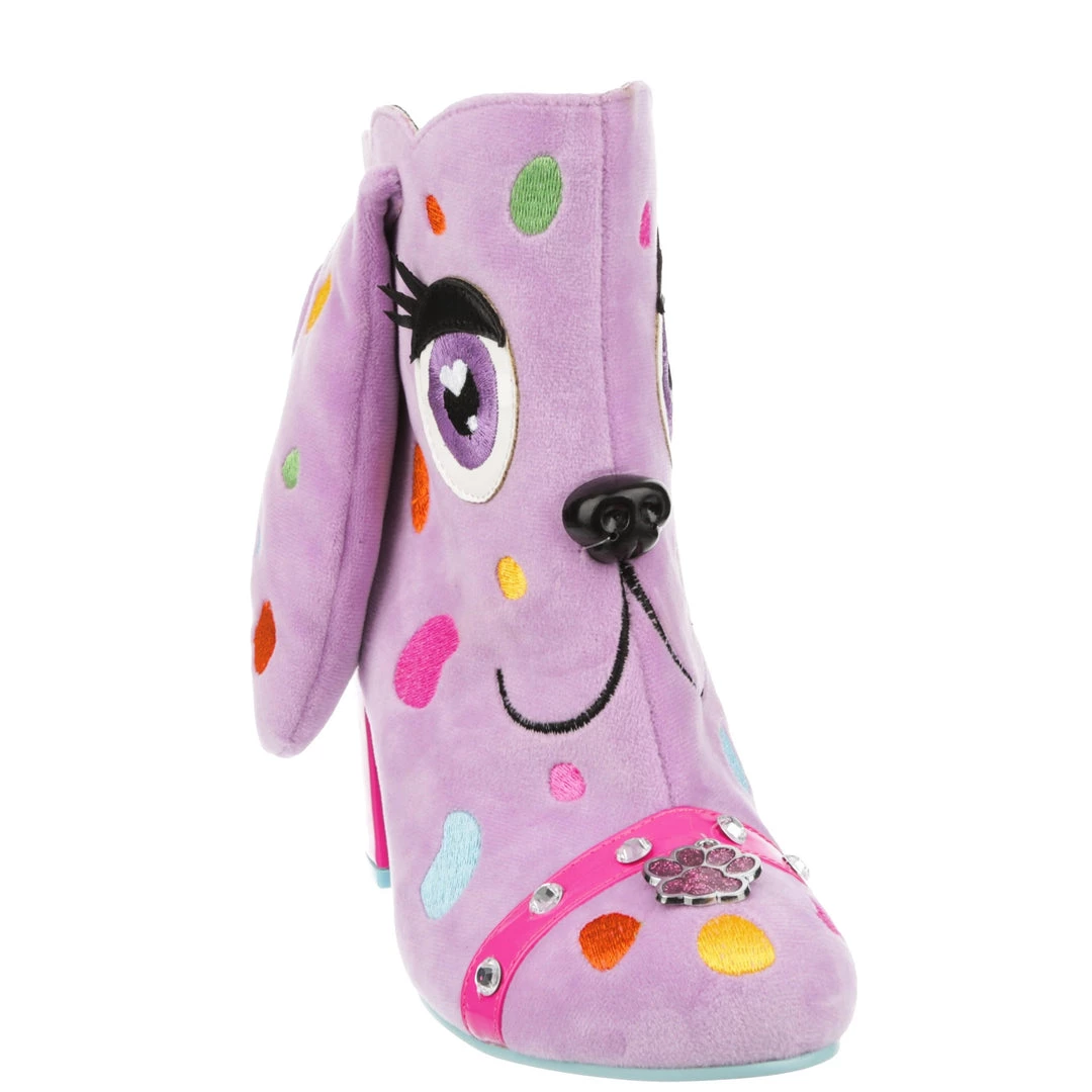 Woof! Woof! Step out in the ultimate canine couture! These statement boots are styled to look like a fabulous multicoloured spotted doggy friend, with striking fuchsia accents on the heel and collar detailing! With 3D ears, a tail, and even a shimmering tag dangling from the rhinestoned collar – these are sure to make you feel like the top dog!