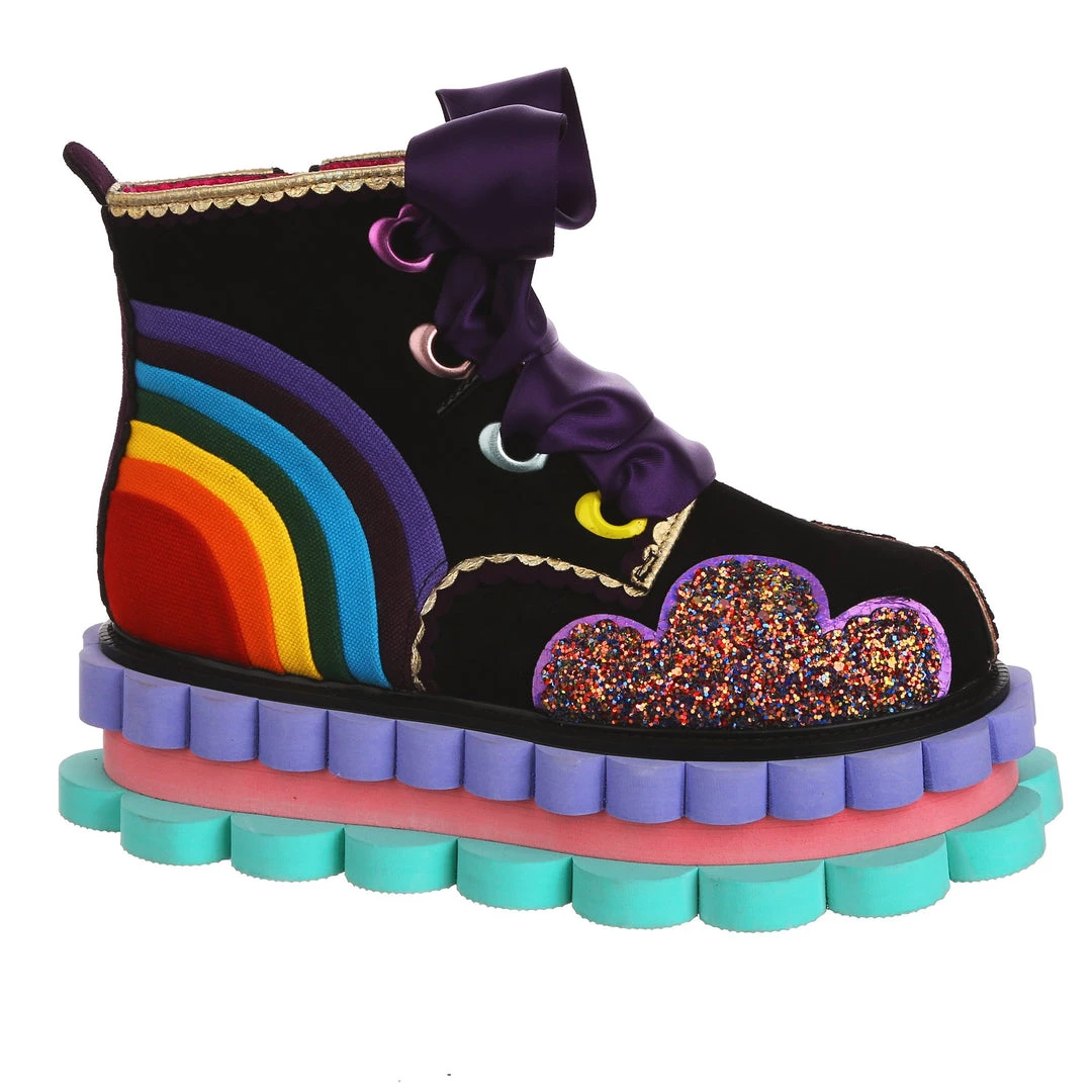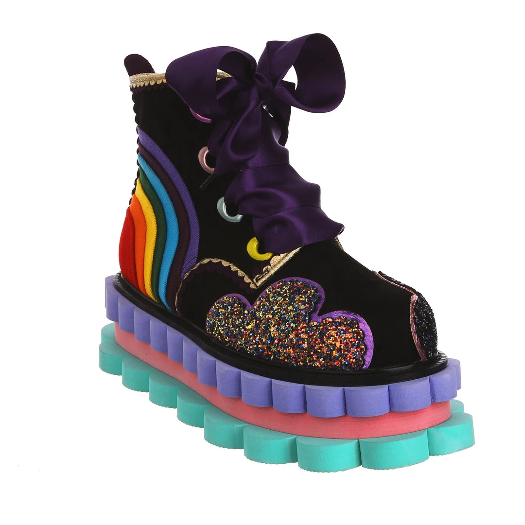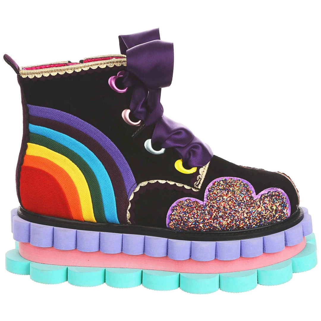 Love the rainbow magic of our classic Shirley Bass but want something flat? We got you covered! These incredible striking black flatform boots feature the rainbow motif on the heel, combined with a glittery cloud on the toe, stunning scalloped edges, heart shaped eyelets and sumptuous purple ribbon laces – these wonders are not to be missed!