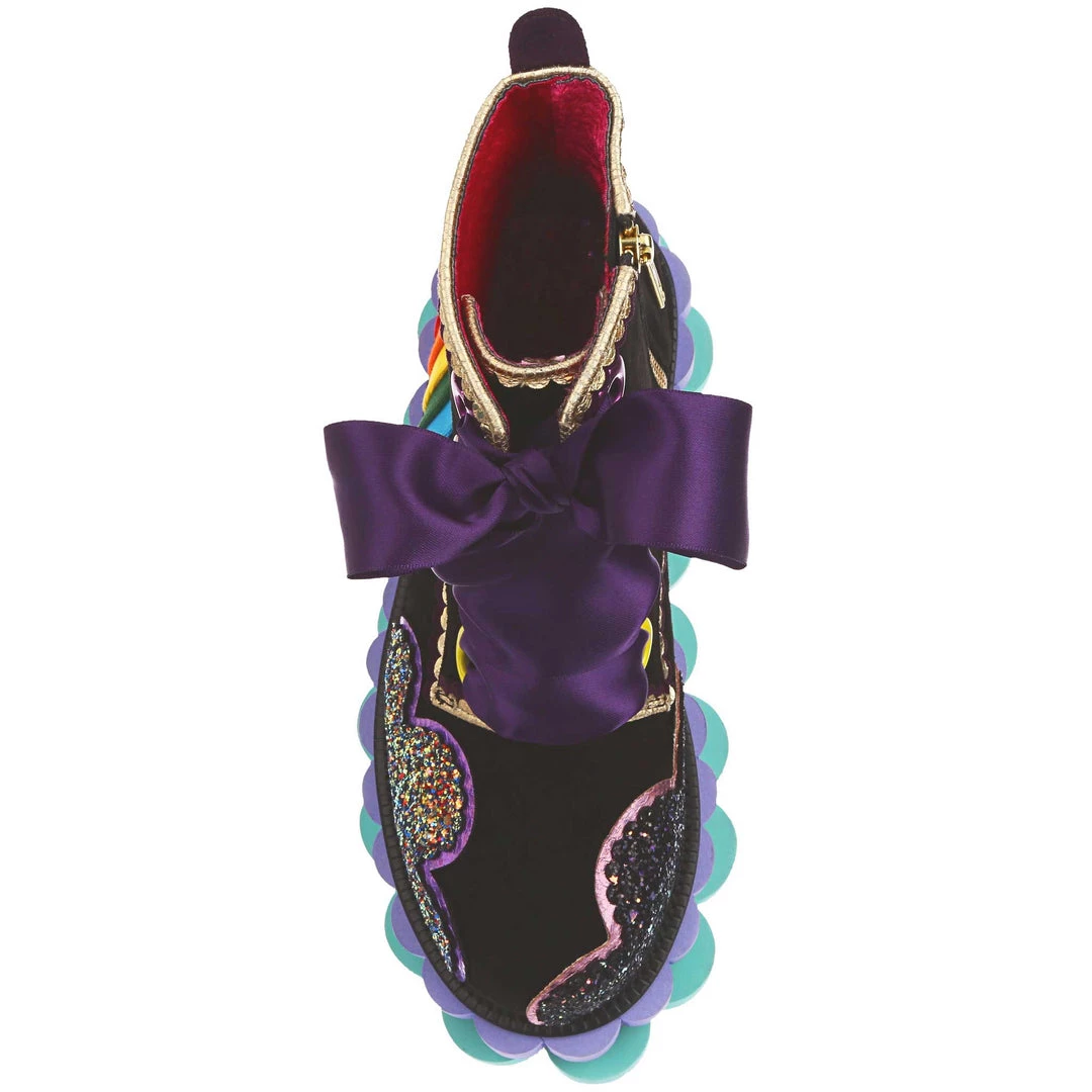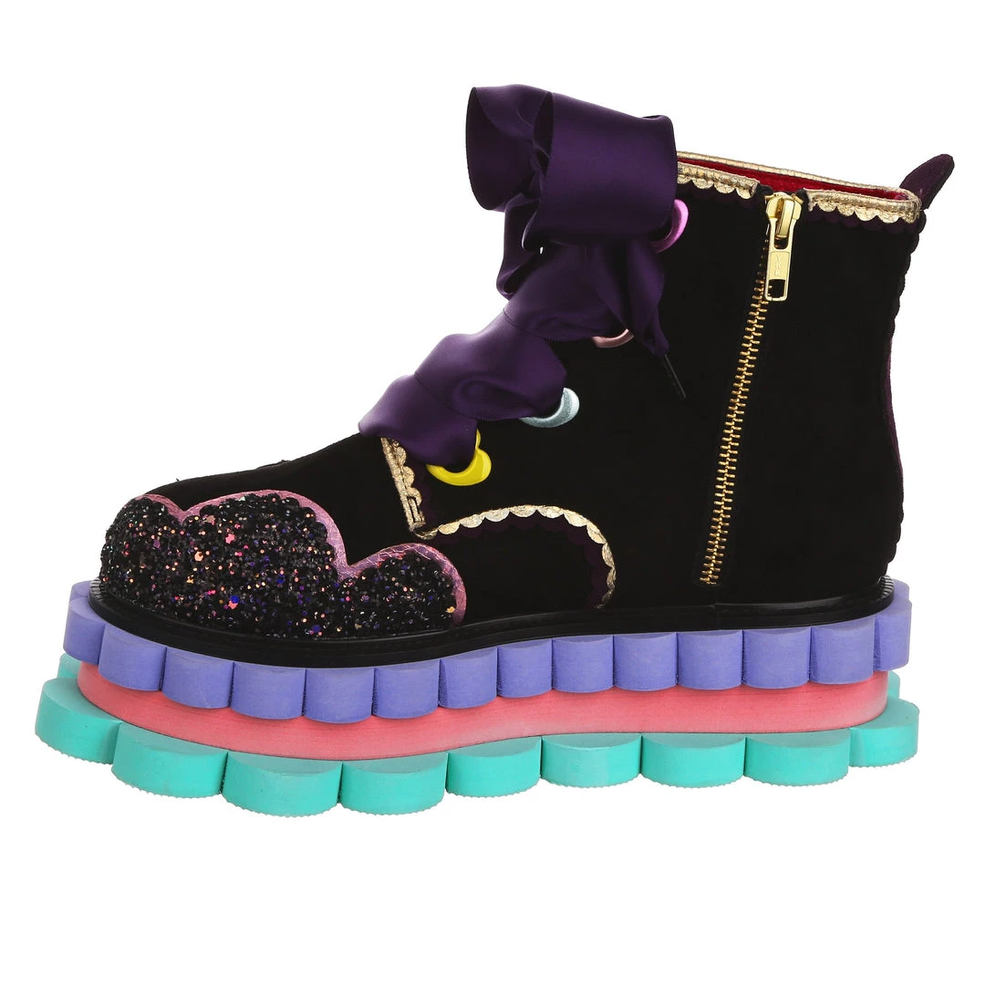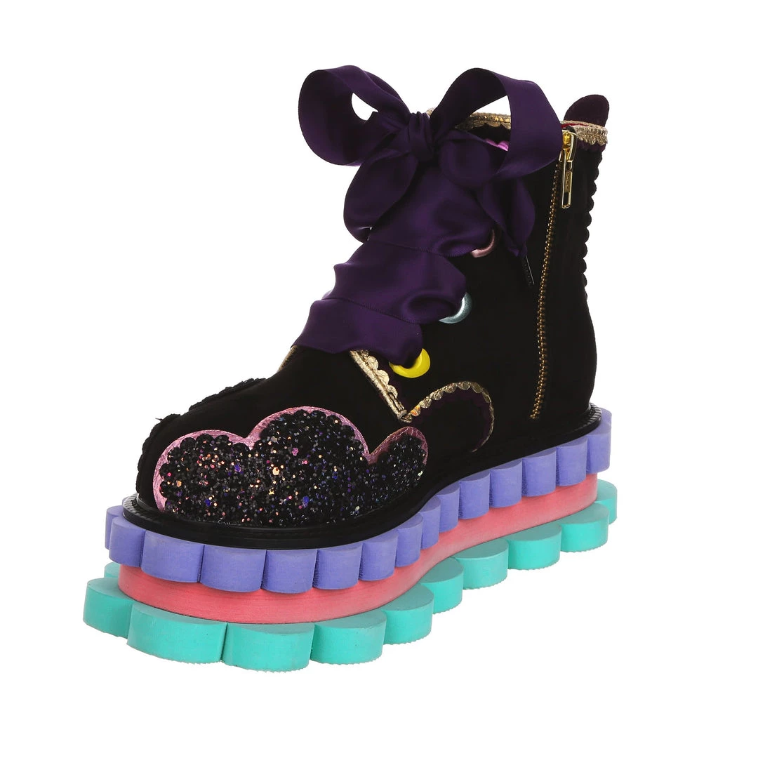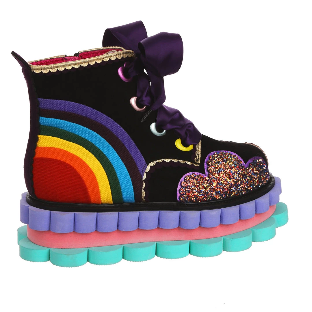 Love the rainbow magic of our classic Shirley Bass but want something flat? We got you covered! These incredible striking black flatform boots feature the rainbow motif on the heel, combined with a glittery cloud on the toe, stunning scalloped edges, heart shaped eyelets and sumptuous purple ribbon laces – these wonders are not to be missed!