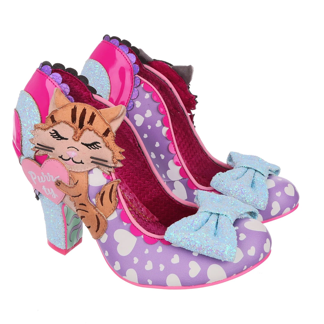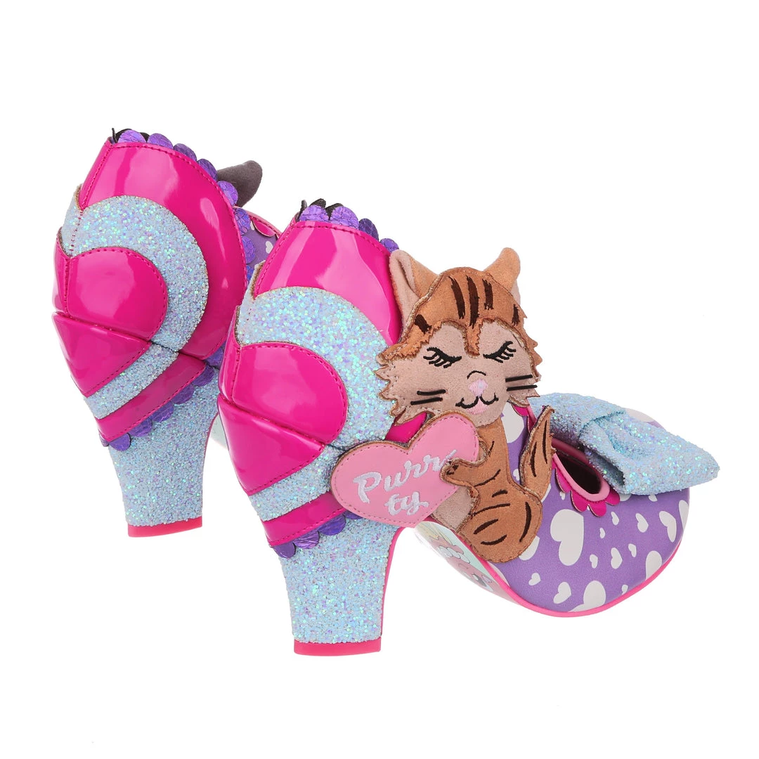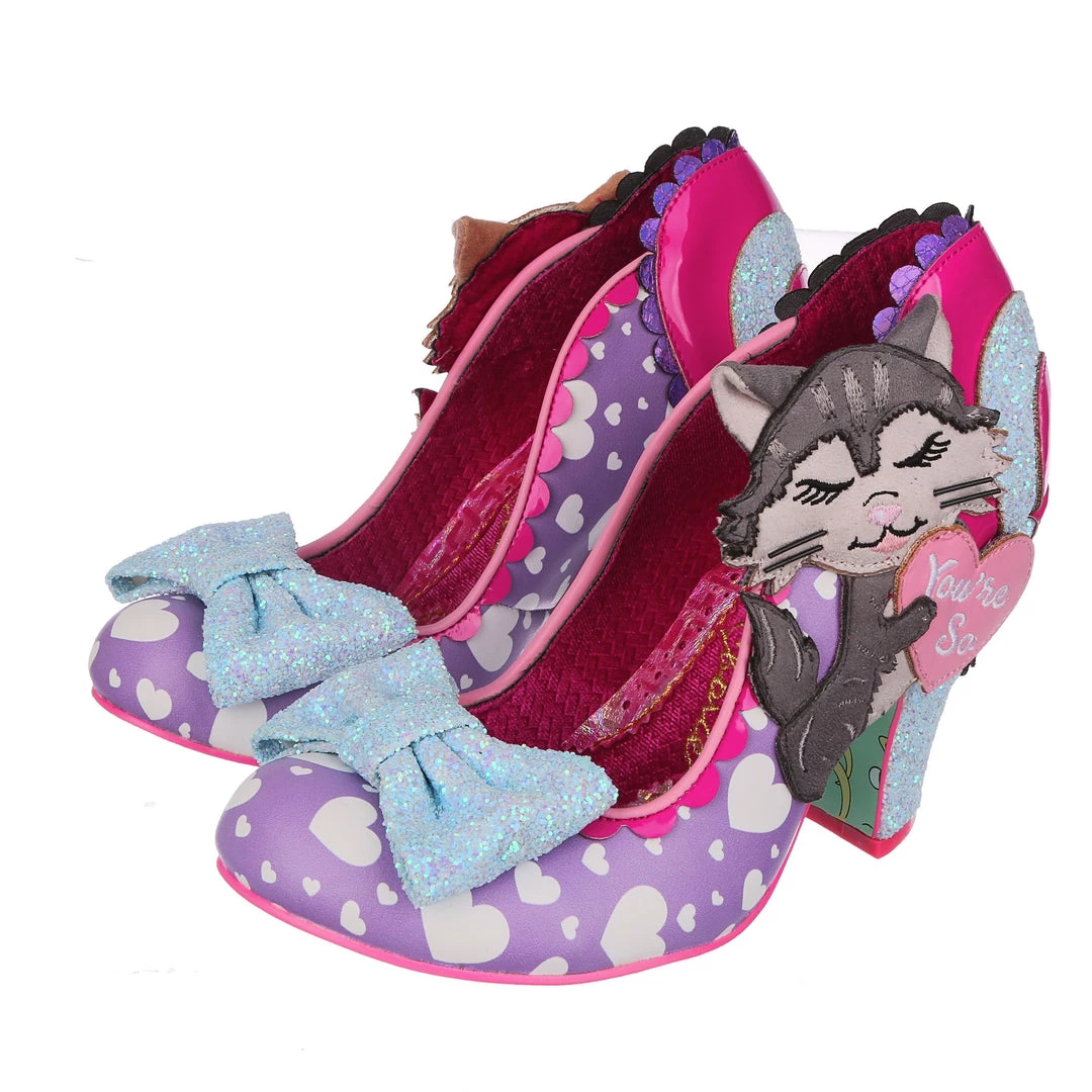 Be your own smitten kitten in these darling kitty cat heels! Perfect for a cat person, these pink, purple and blue wonders are dazzling and darling, featuring two fabulous felines holding hearts with romantic messages inside. The blue glitter bow on the toe matches the encrusted heel, and the scalloped edging along the back edge is the perfect tiny detailing to make these a pair of shoes you will never forget! A wonderful gift for a cat lover to show them how much they mean to you!