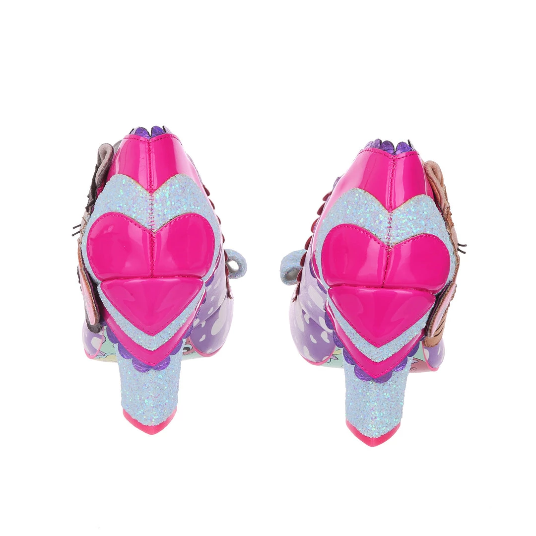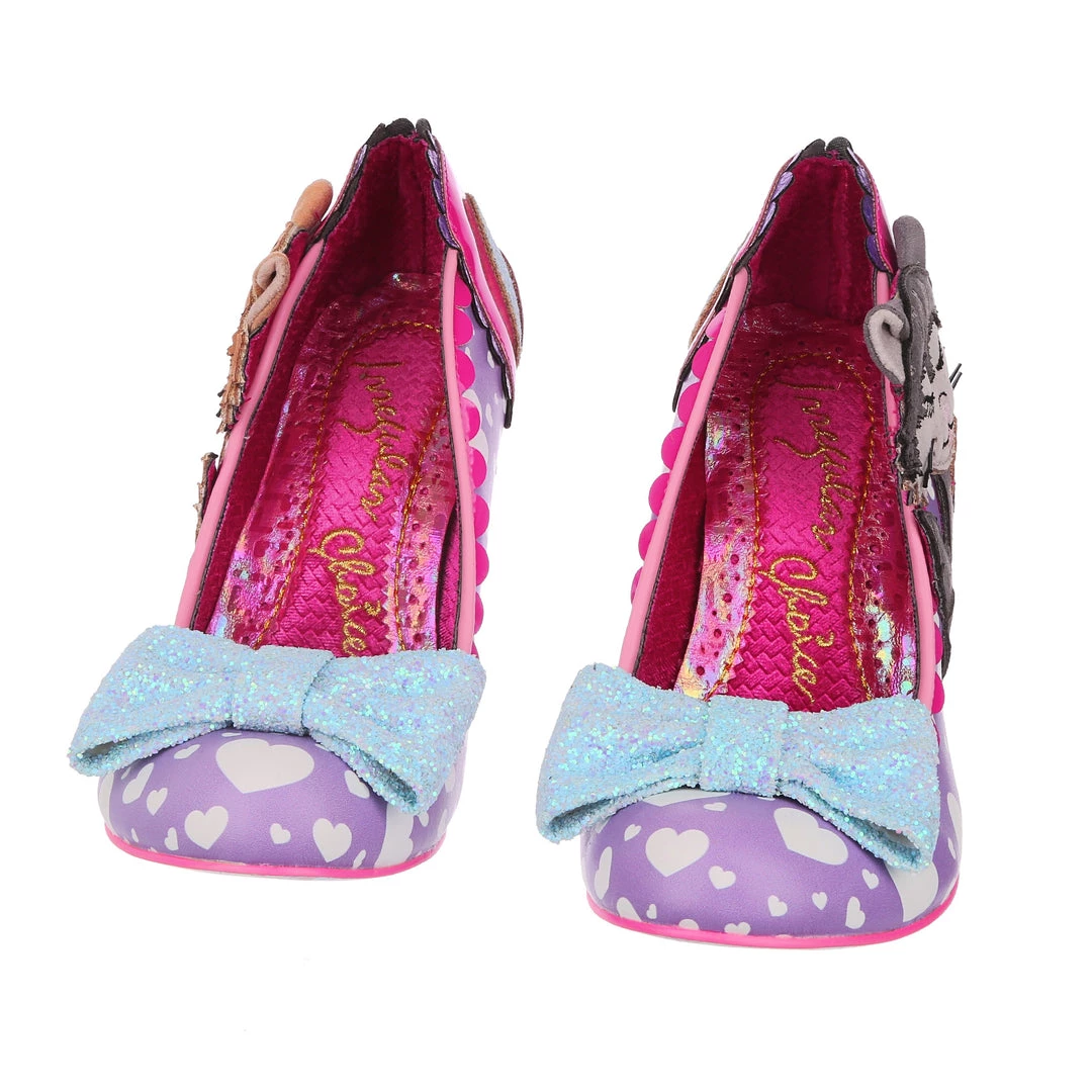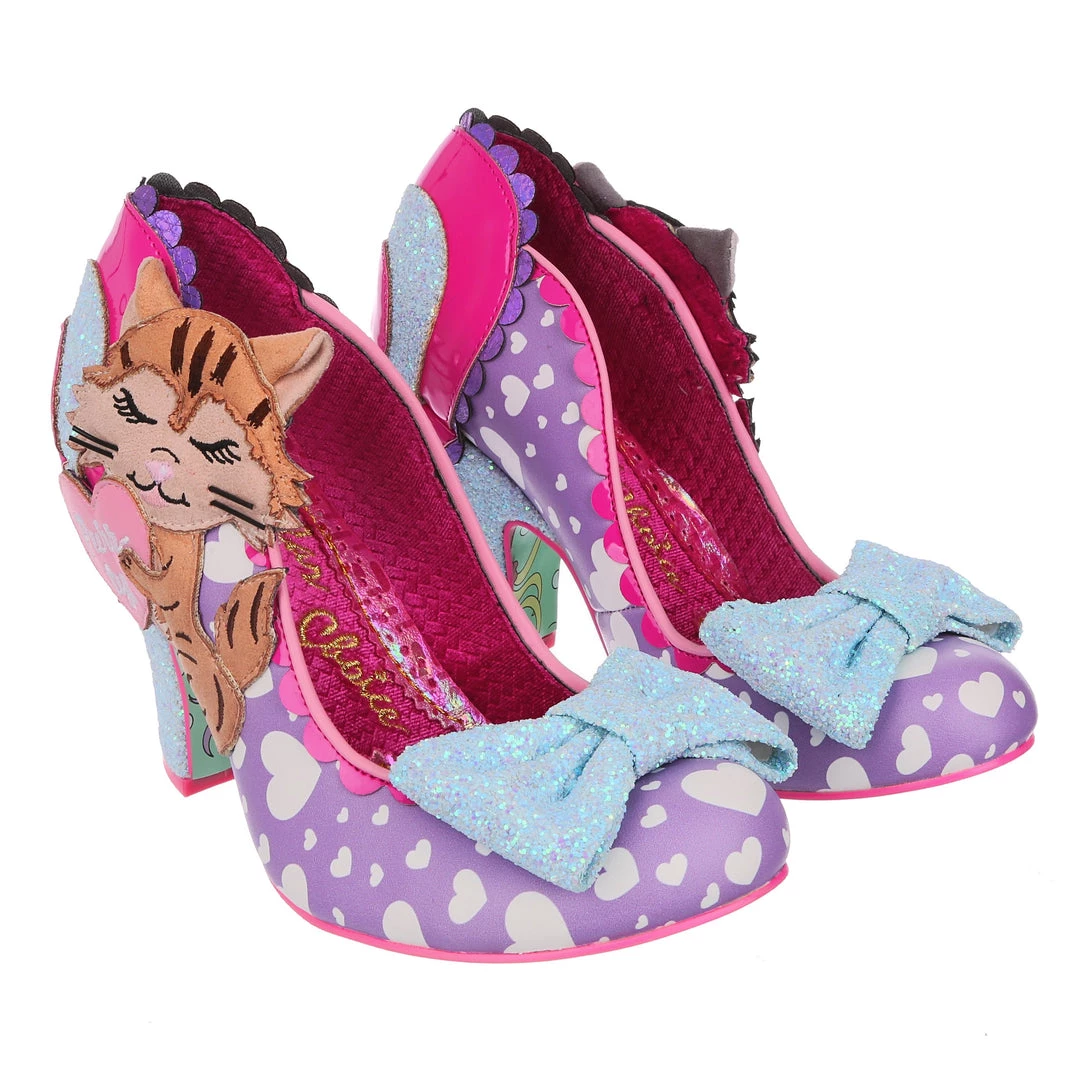 Be your own smitten kitten in these darling kitty cat heels! Perfect for a cat person, these pink, purple and blue wonders are dazzling and darling, featuring two fabulous felines holding hearts with romantic messages inside. The blue glitter bow on the toe matches the encrusted heel, and the scalloped edging along the back edge is the perfect tiny detailing to make these a pair of shoes you will never forget! A wonderful gift for a cat lover to show them how much they mean to you!