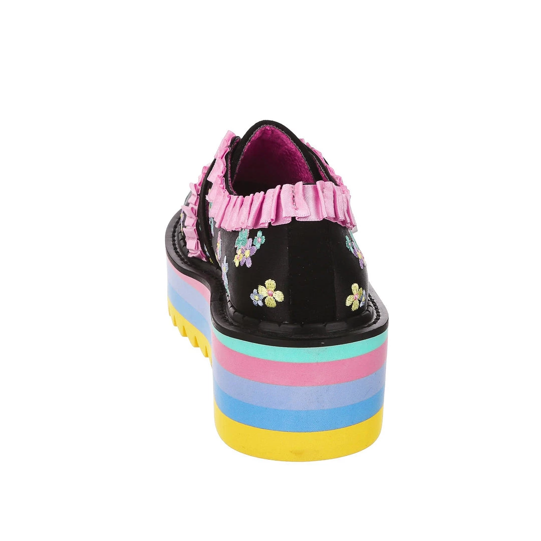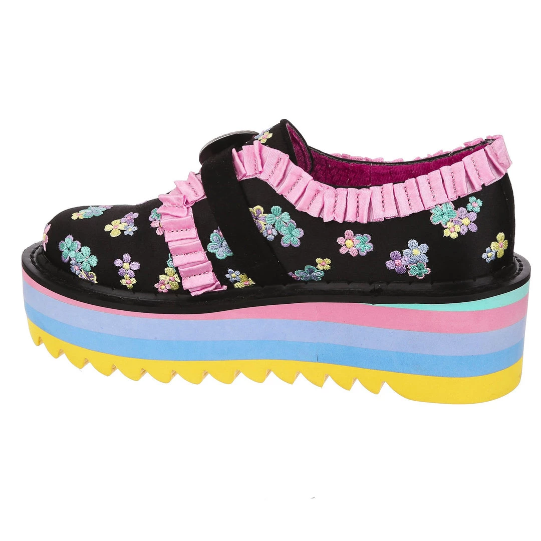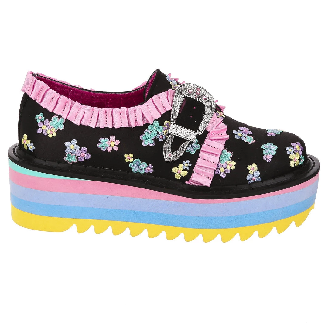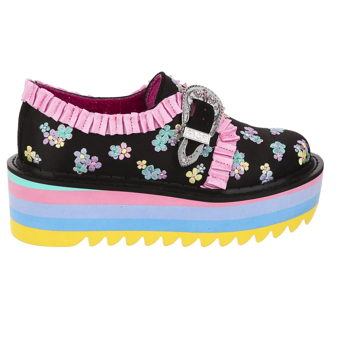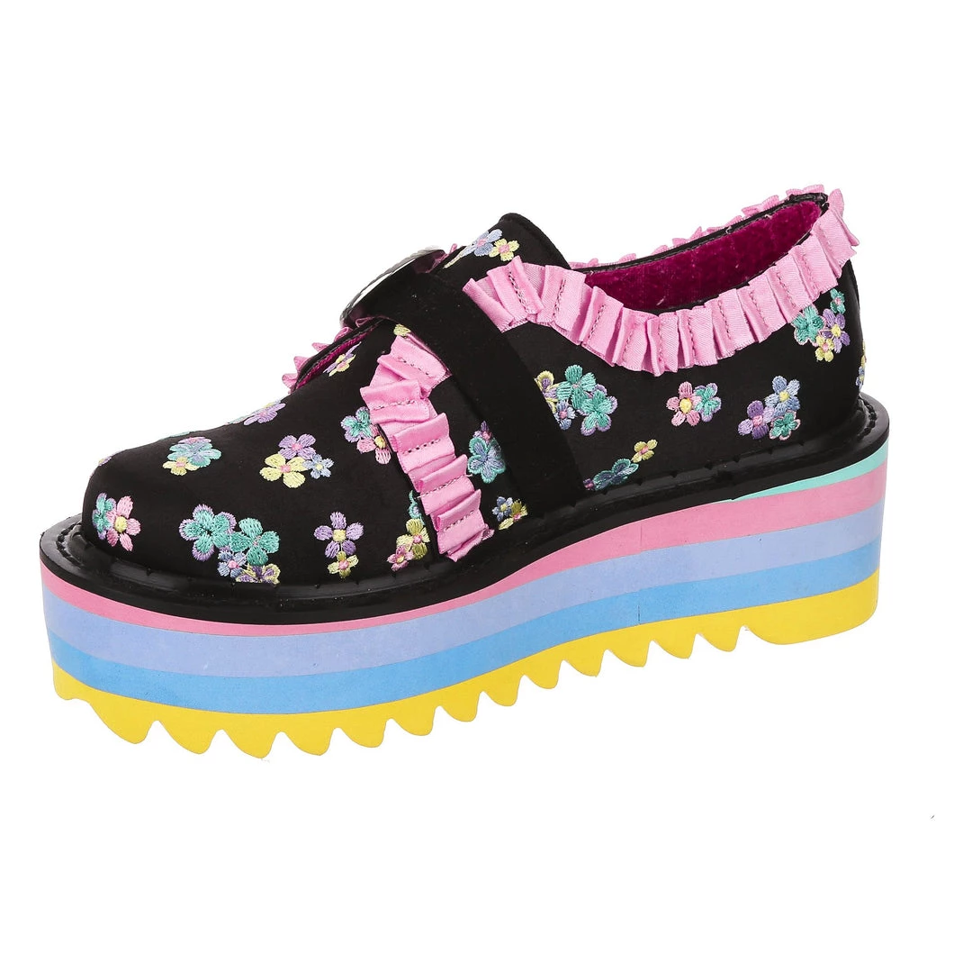 Buckle up! These beauties are something special! An adorable black and pastel floral brocade is paired with darling baby pink ruffles and a statement vintage style buckle, to give a completely unique feel! The sole is layers of pastel block colours finished with a chunky tread for ease of wear, these are definitely party shoes! Sure to turn heads and get you feeling like the star of the show, add them to your life today!