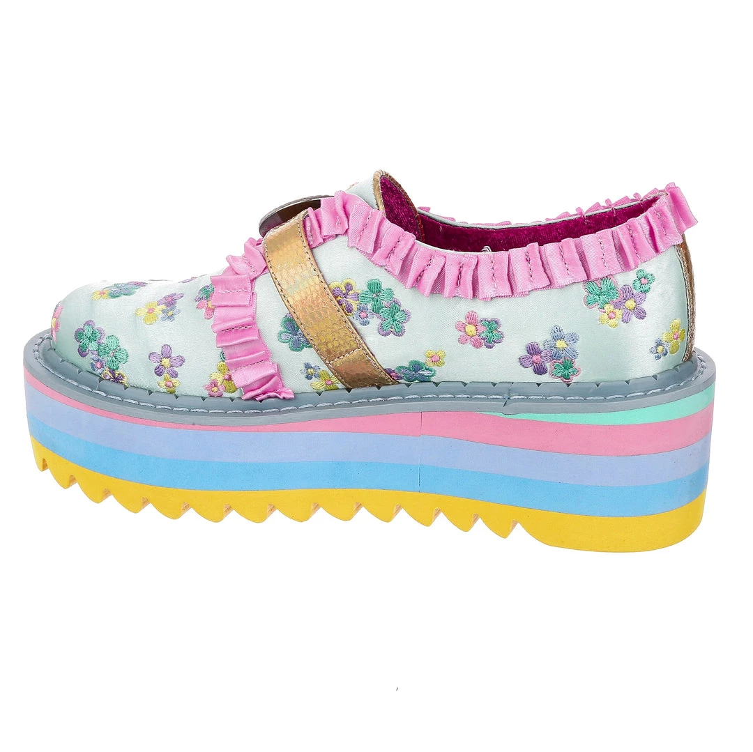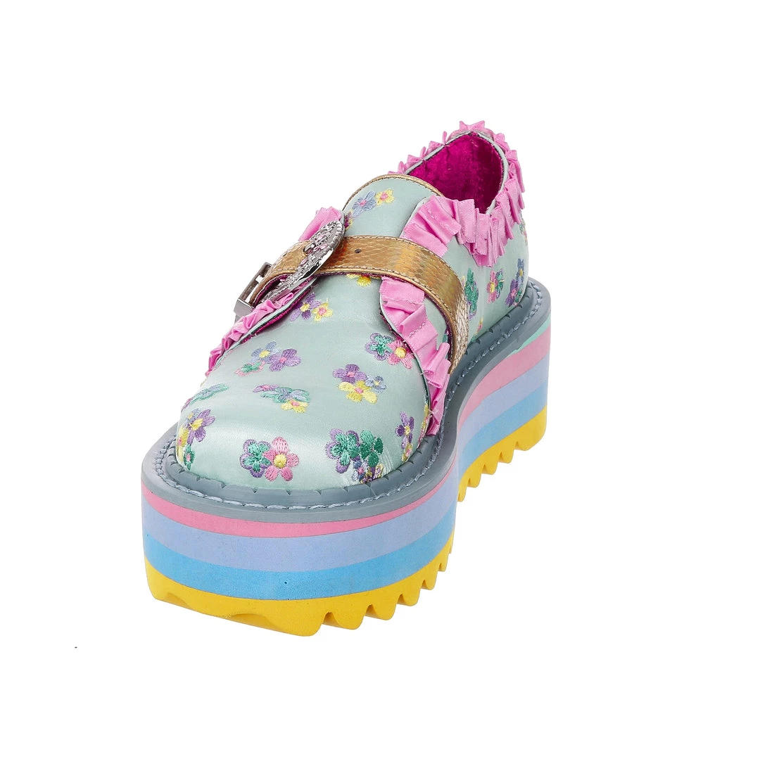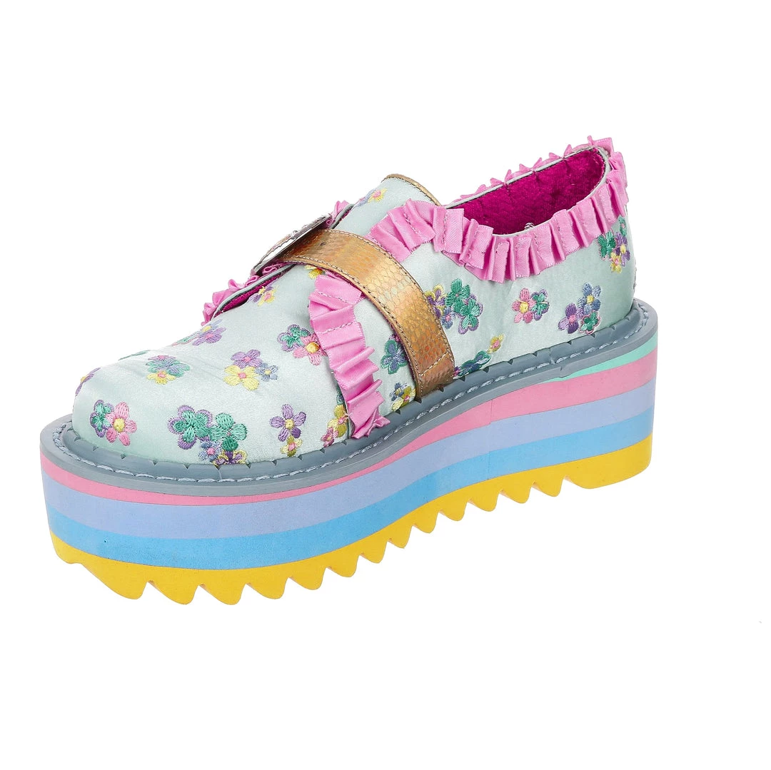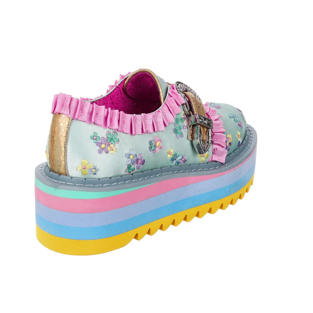 Buckle up! These beauties are something special! An adorable mint floral brocade is paired with darling baby pink ruffles and a statement vintage style buckle, to give a completely unique feel! The sole is layers of pastel block colours finished with a chunky tread for ease of wear, these are definitely party shoes! Sure to turn heads and get you feeling like the star of the show, add them to your life today!