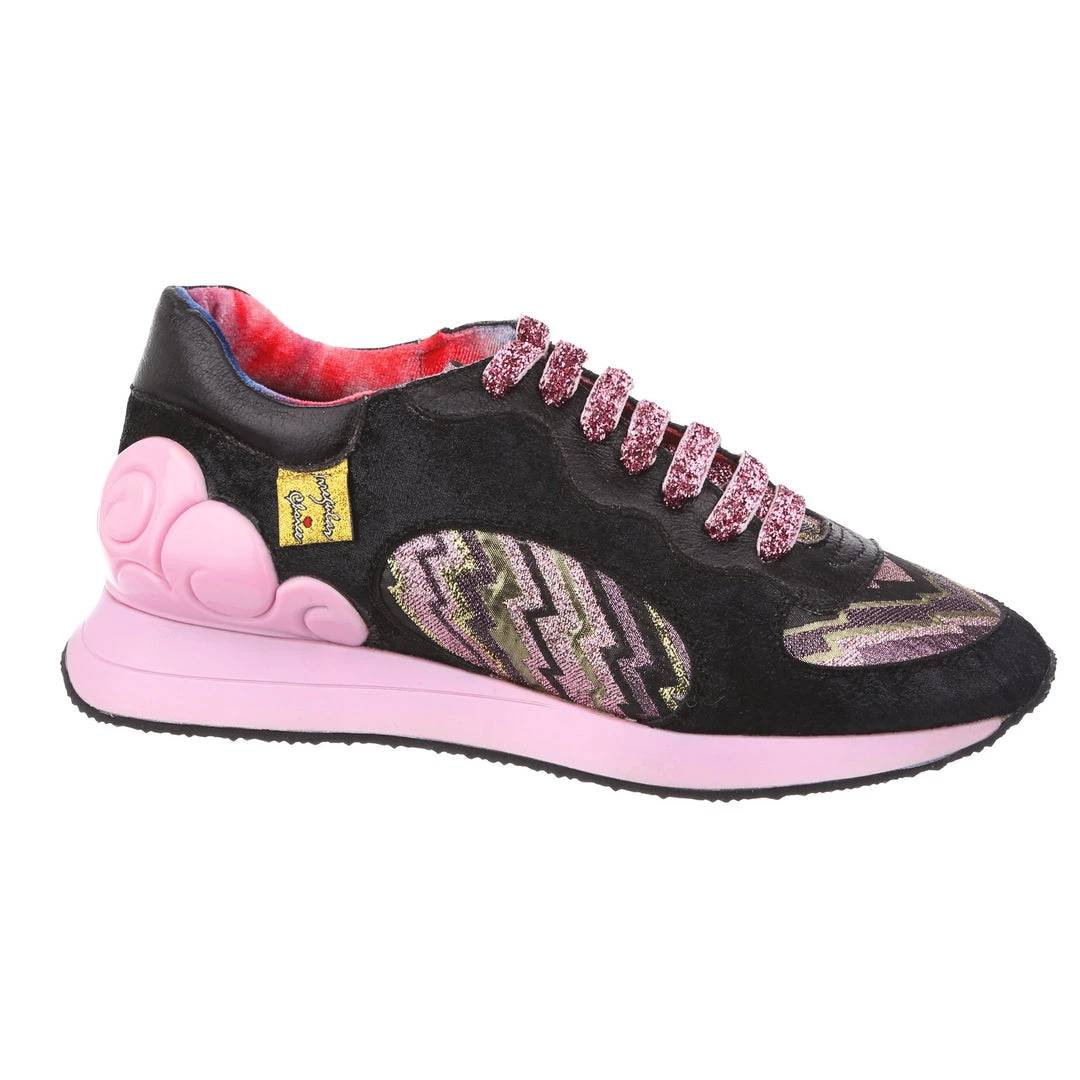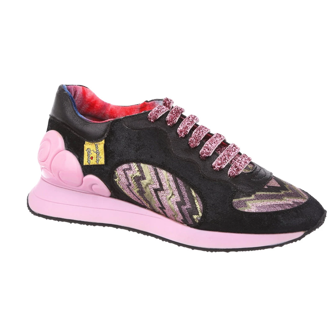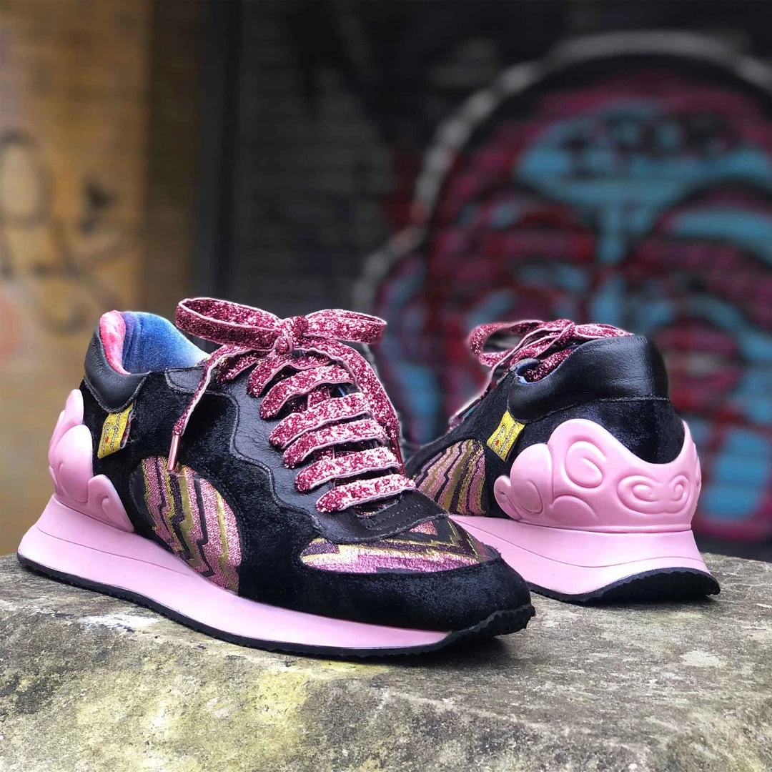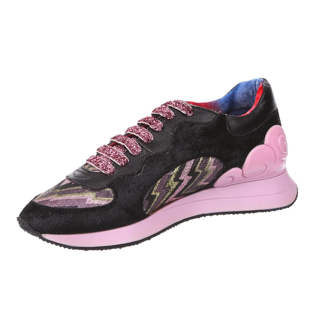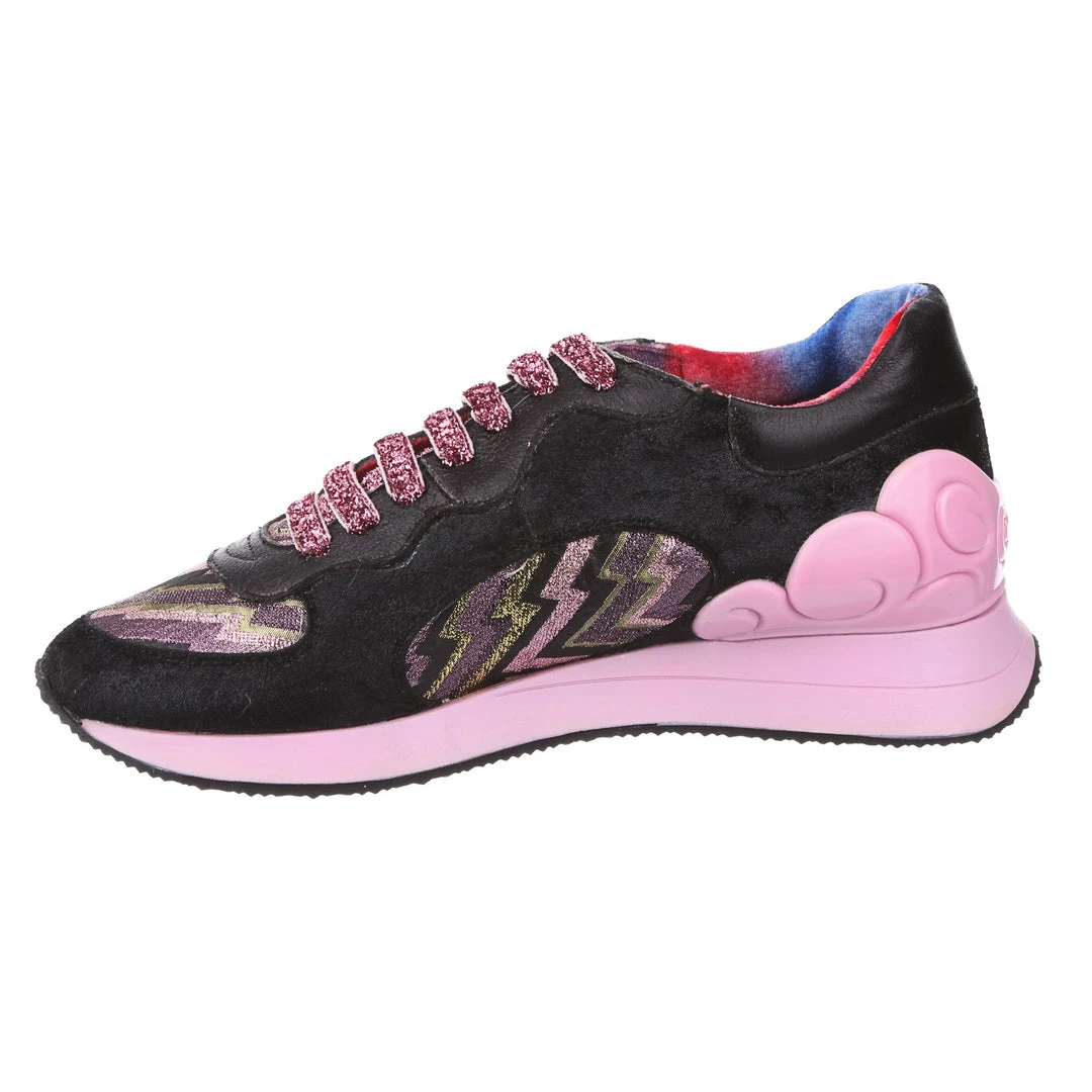 Lace into something out of this world! These trainers are sure to make your head spin! Featuring baby pink clouds which wrap around your heel, connecting to the athletic inspired sole in a similar hue. Decorated with shimmering retro purple, gold and pink zig zag stripes, all finished with fabulous blush tone glitter laces, these beauties are not to be missed!