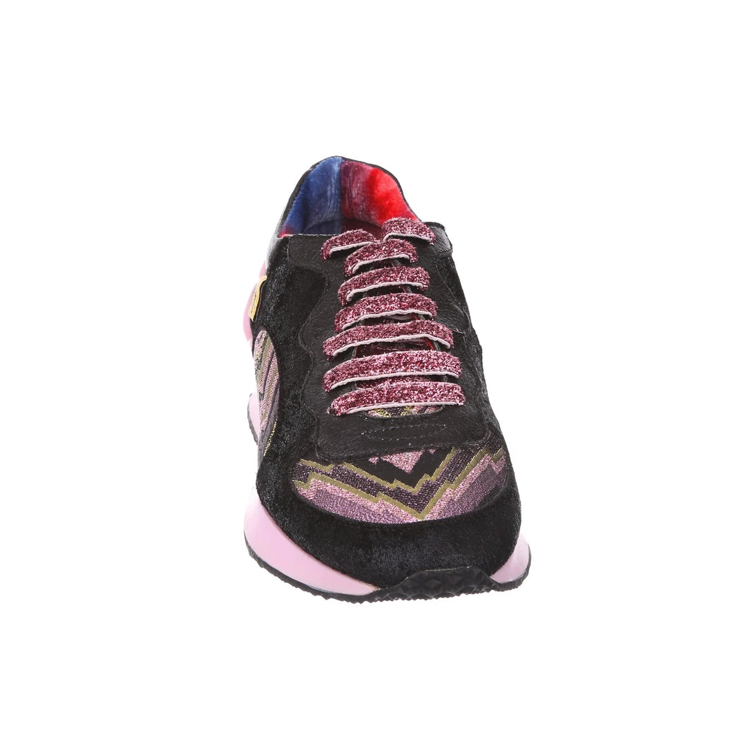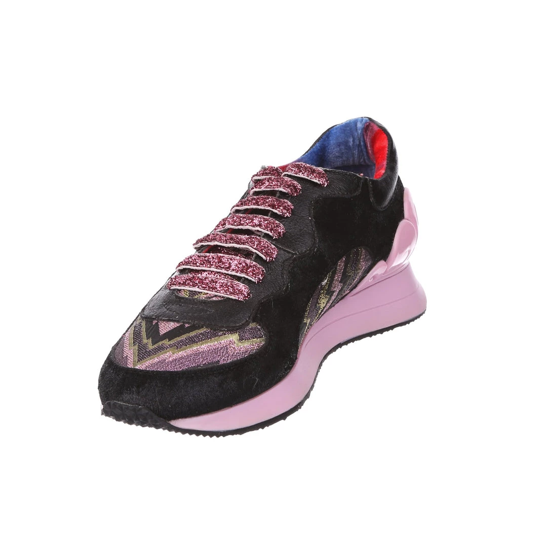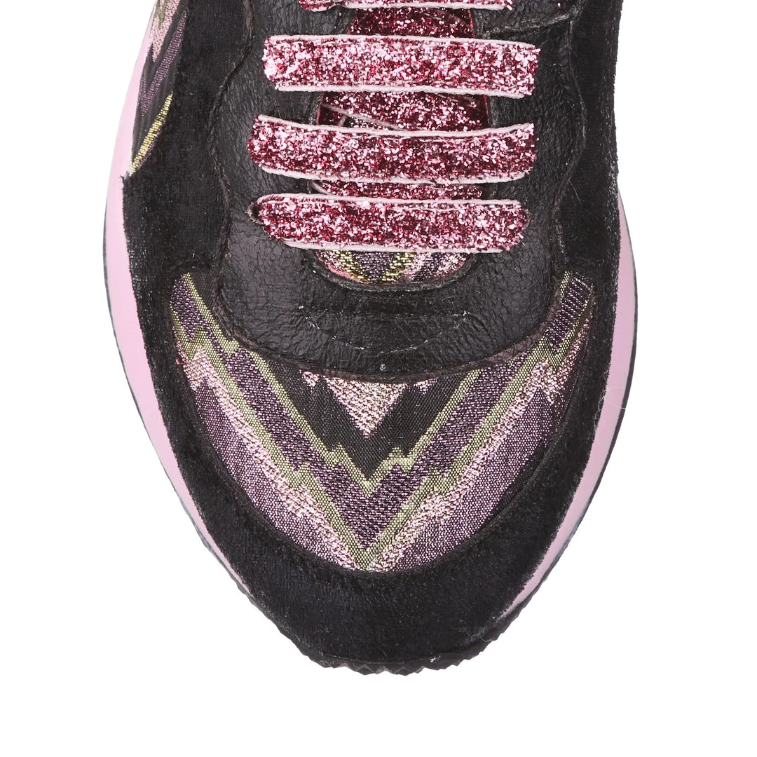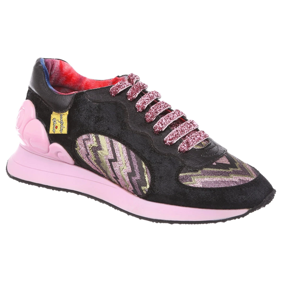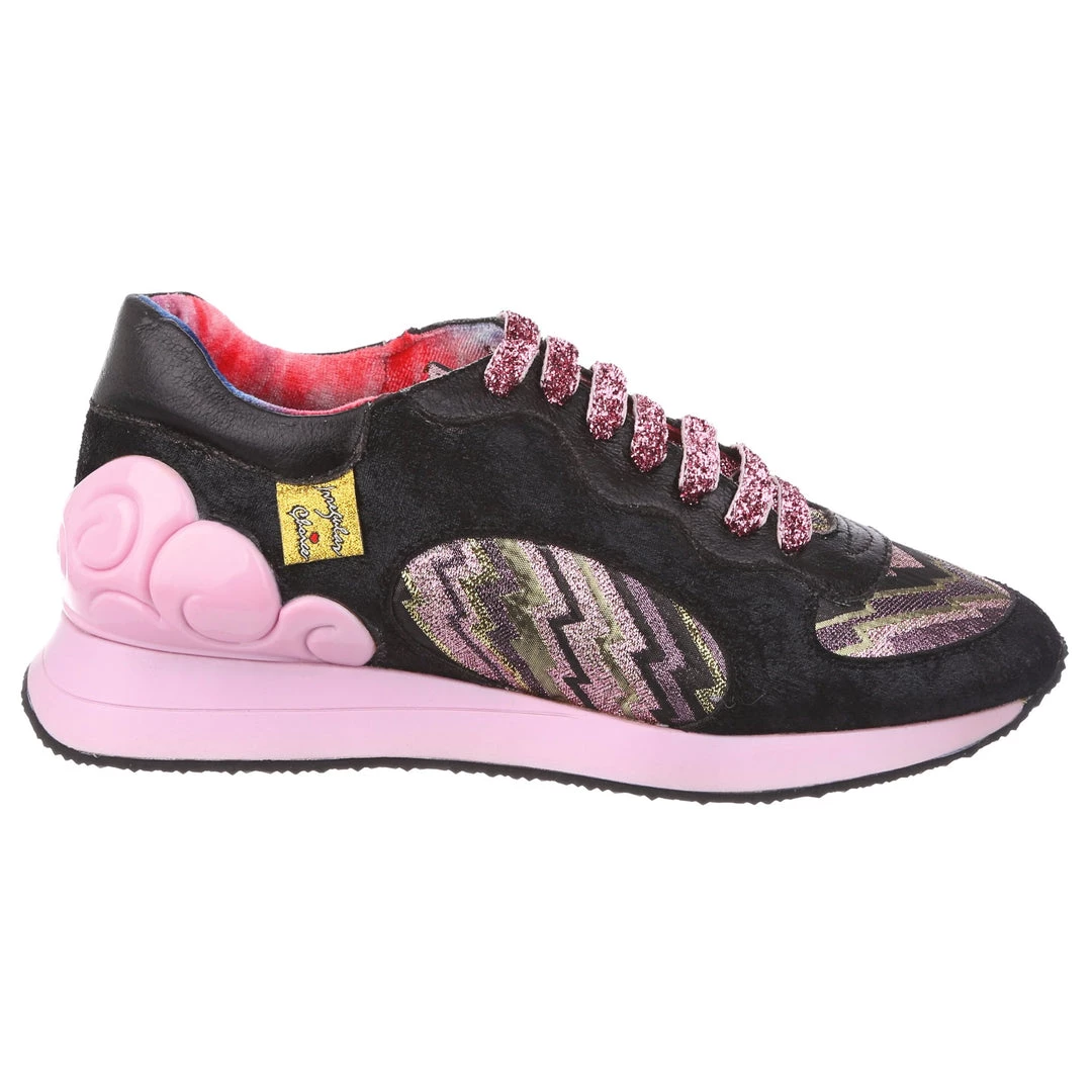 Lace into something out of this world! These trainers are sure to make your head spin! Featuring baby pink clouds which wrap around your heel, connecting to the athletic inspired sole in a similar hue. Decorated with shimmering retro purple, gold and pink zig zag stripes, all finished with fabulous blush tone glitter laces, these beauties are not to be missed!