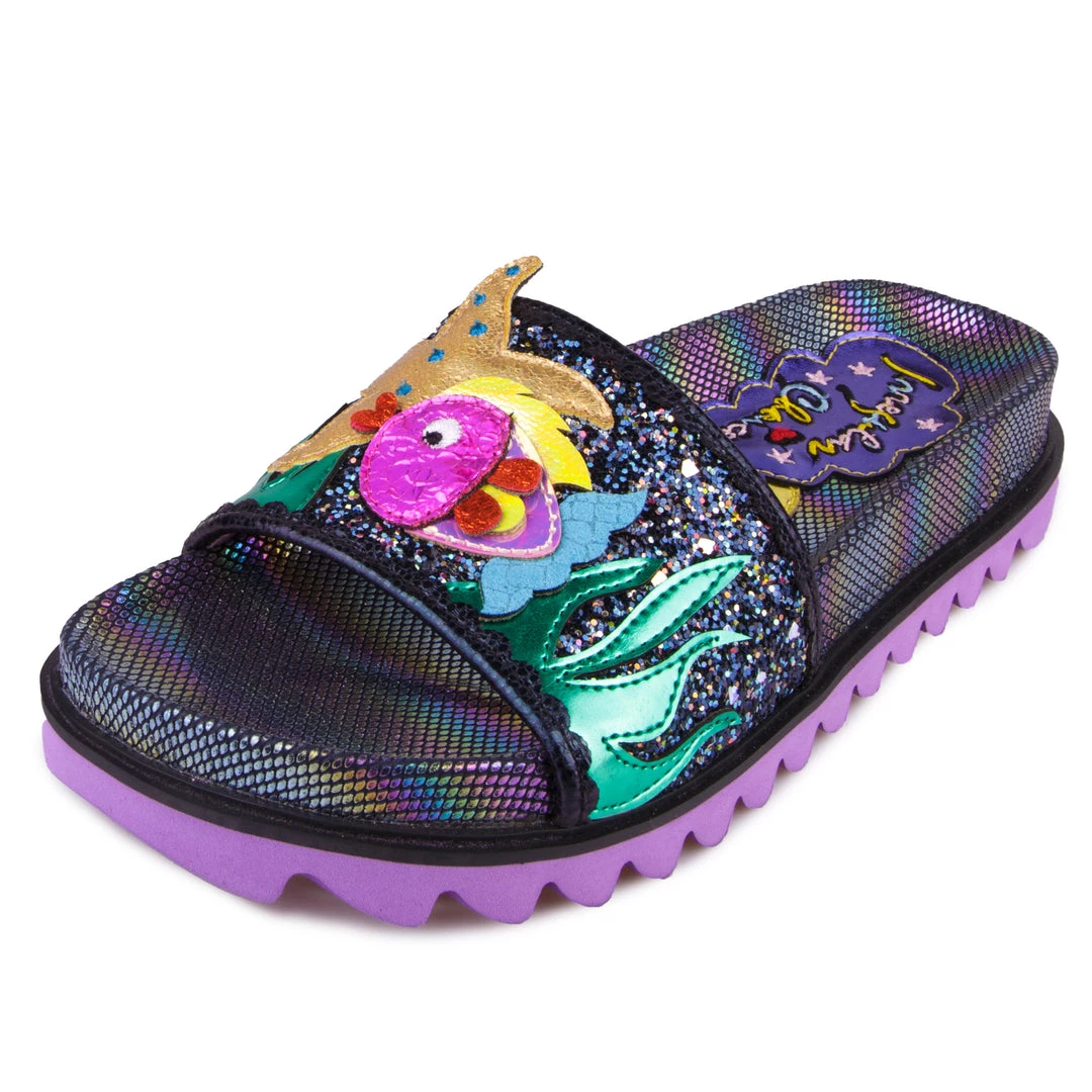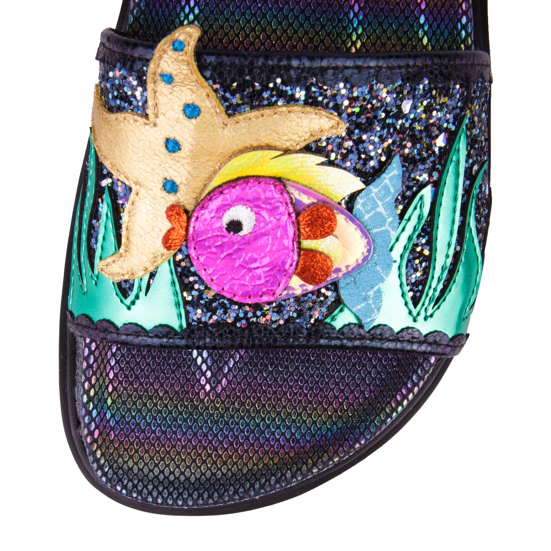 Slide on these beautiful briny sliders! A shimmering black glitter upper is topped with a kissing fish on each foot – and a starfish! Great for those beachy summer feels, or just to get your mermaid on!