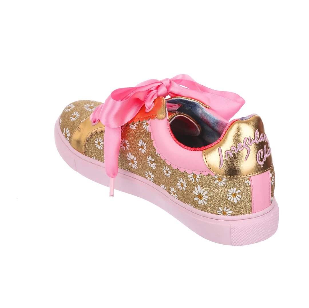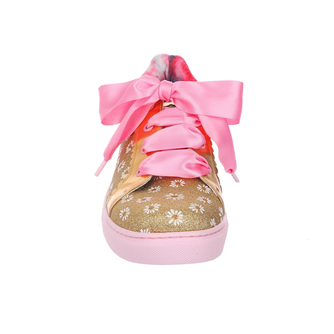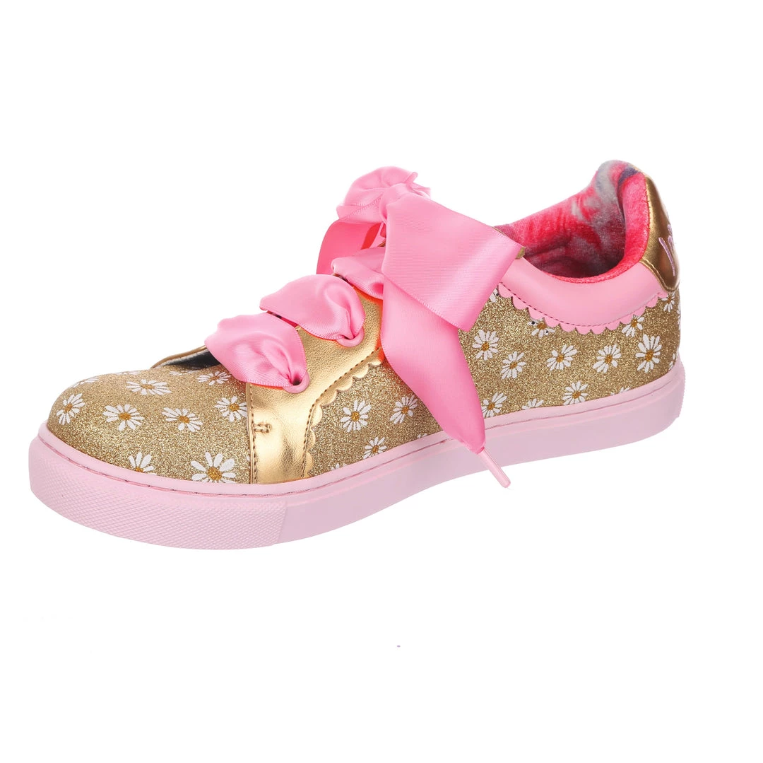 Wanting something comfy and casual but still with some irregular flair, these are the shoes for you! A comfy lace up sneaker style, these pumps are all decked out in a shimmering gold daisy covered glitter, with golden metallic details and a sumptuous pink satin ribbon lace! Absolutely perfect to lace up, step out and show the world what you are made of!