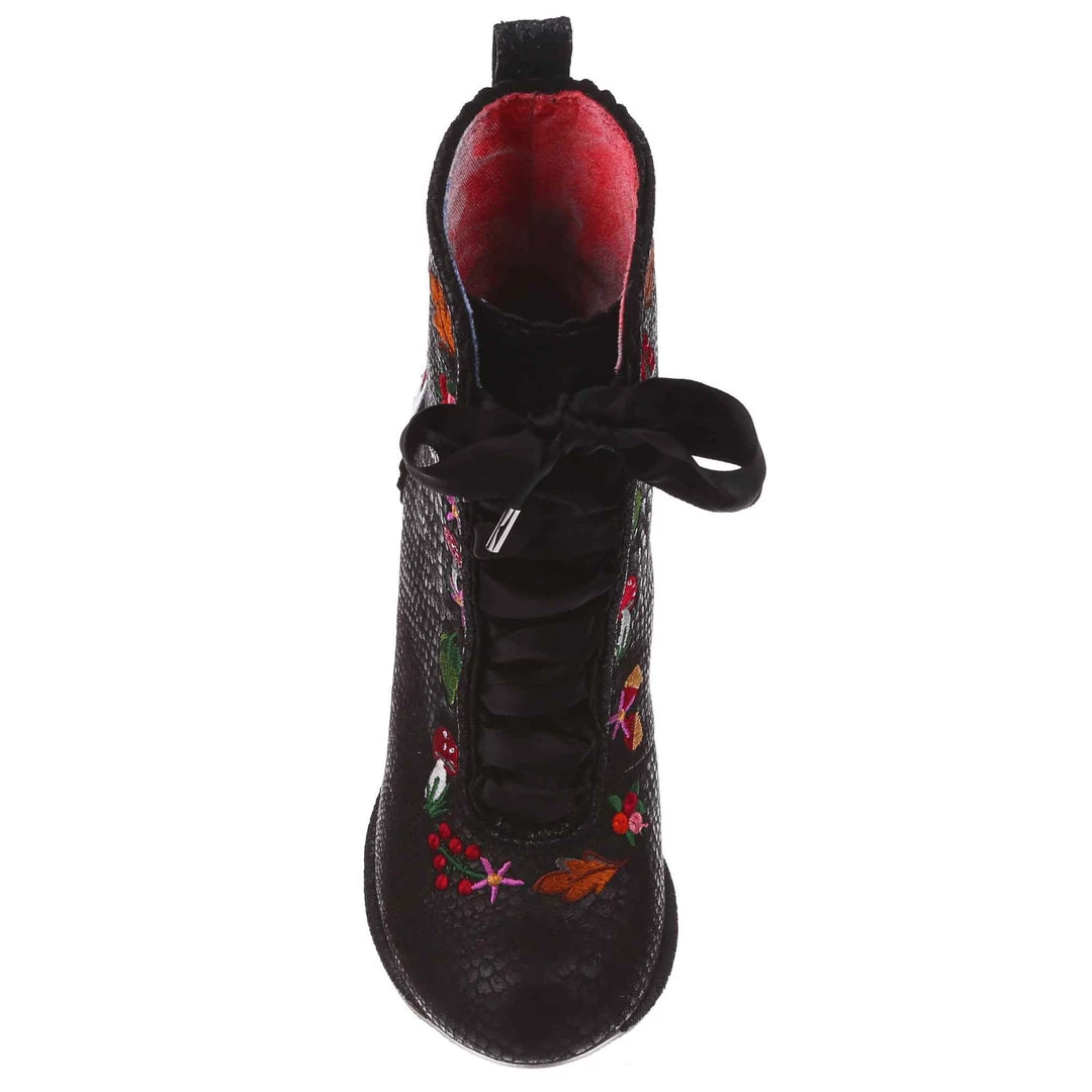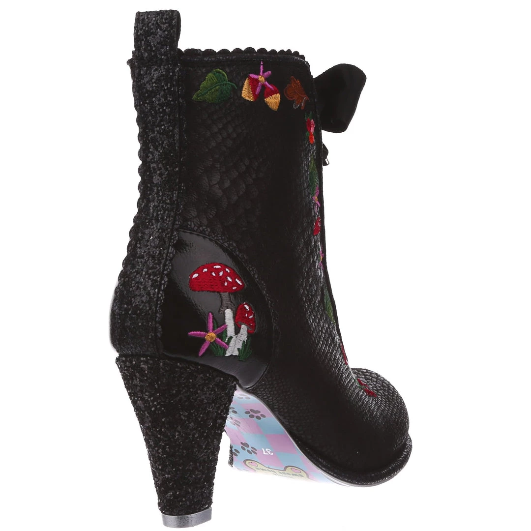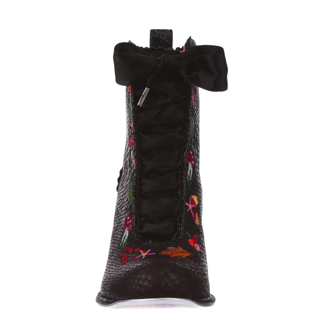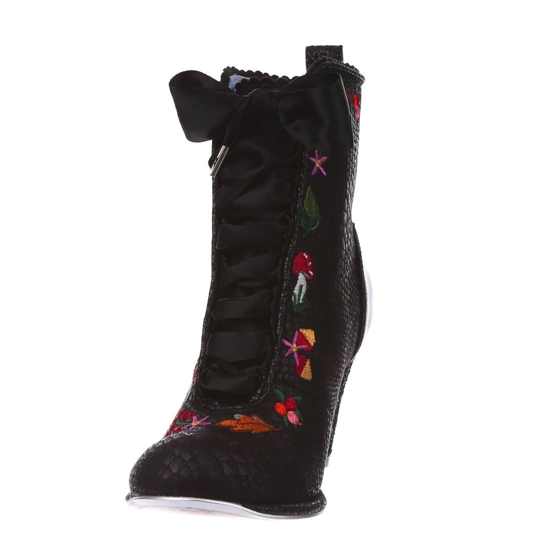 Lace up into these lovelies! Perfect to show your love for all things foresty and magical, these boots feature a statement shimmering black snake texture, adorned with adorable embroidery of mushrooms, leaves and flowers! Perfect to feel like you are on a little woodland adventure, add them to your life today!