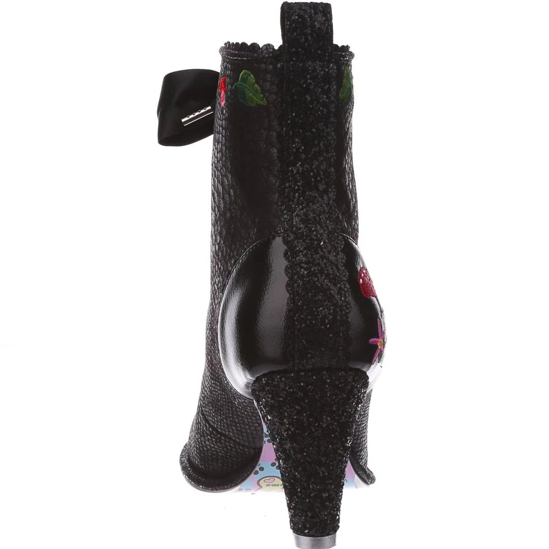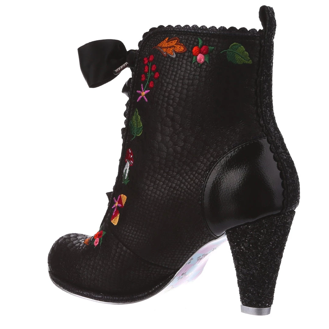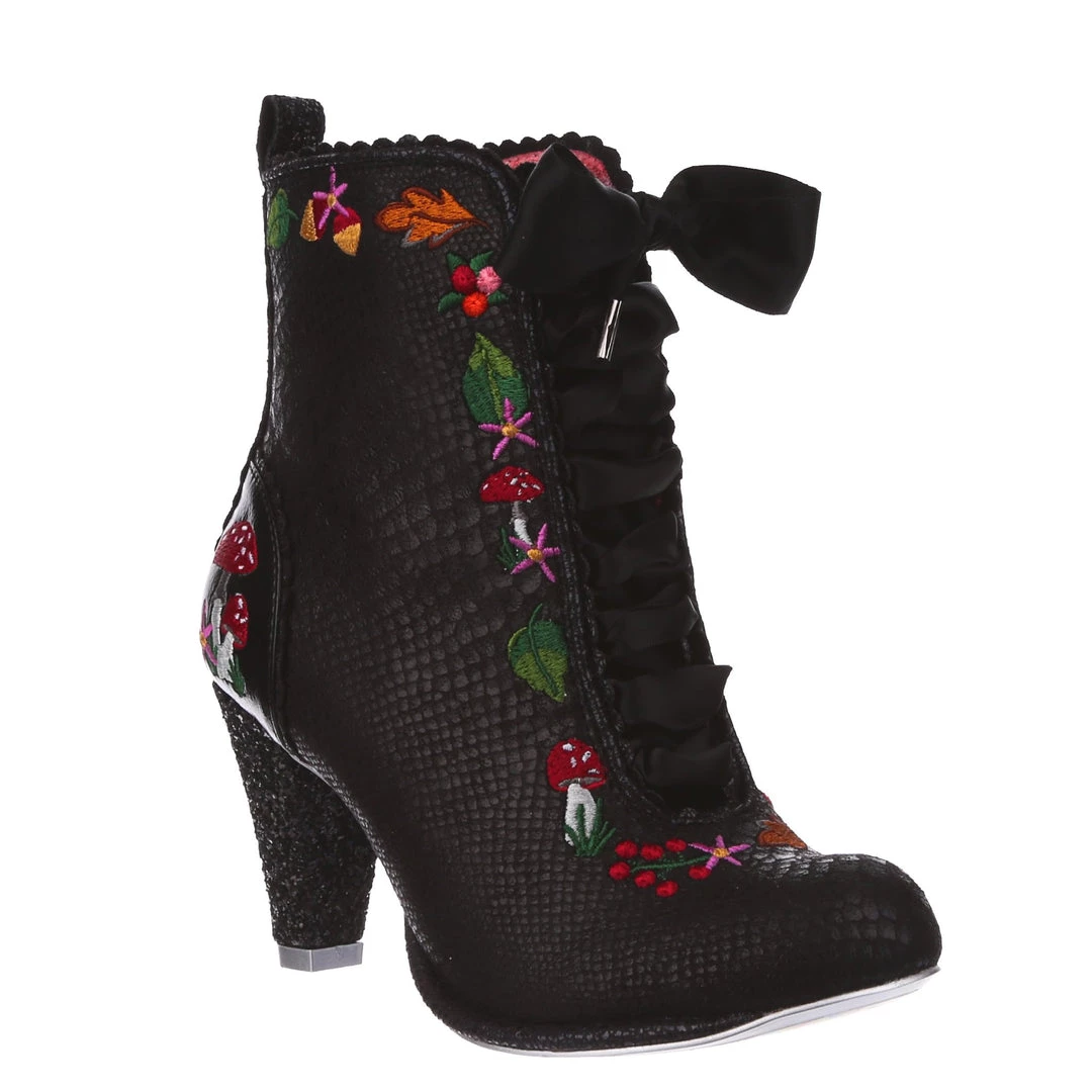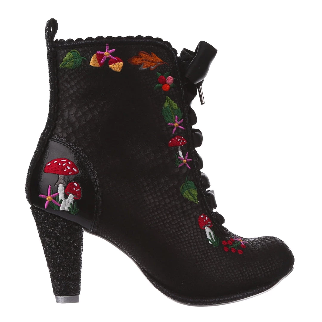 Lace up into these lovelies! Perfect to show your love for all things foresty and magical, these boots feature a statement shimmering black snake texture, adorned with adorable embroidery of mushrooms, leaves and flowers! Perfect to feel like you are on a little woodland adventure, add them to your life today!