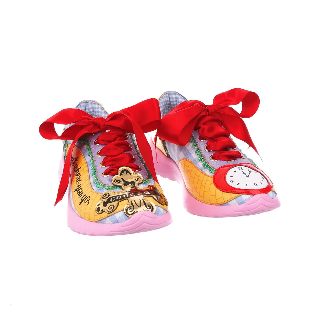 Brains, heart and courage – everything needed for the best of friends! These adorable statement trainers are adorned in everything the Wizard of Oz™, and the result is fabulous! The Yellow Brick Road™ winds around the shoes, with beautiful script scrolling across, leading to the statement applique on each toe – a medal for courage and a ticking heart! Fastened with brilliant red ribbons, and featuring a print of our favourite adventurers on the heel, these trainers are surely not to be missed!