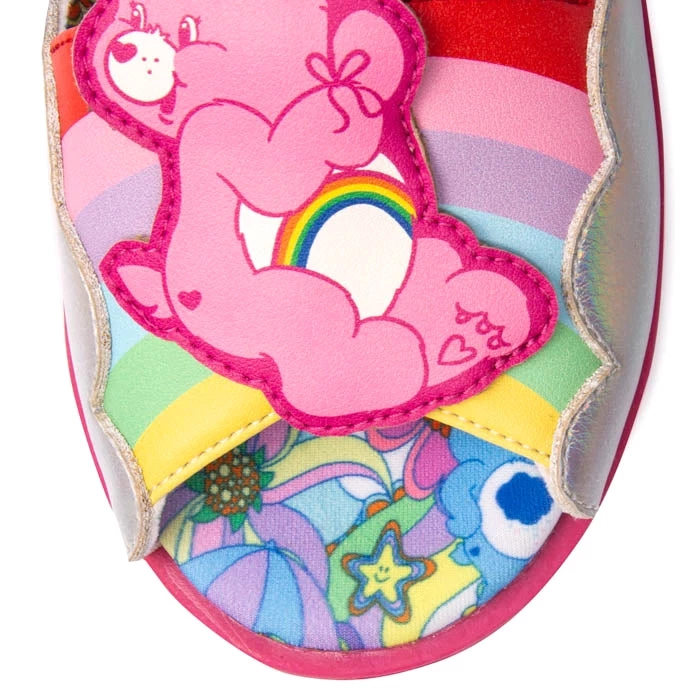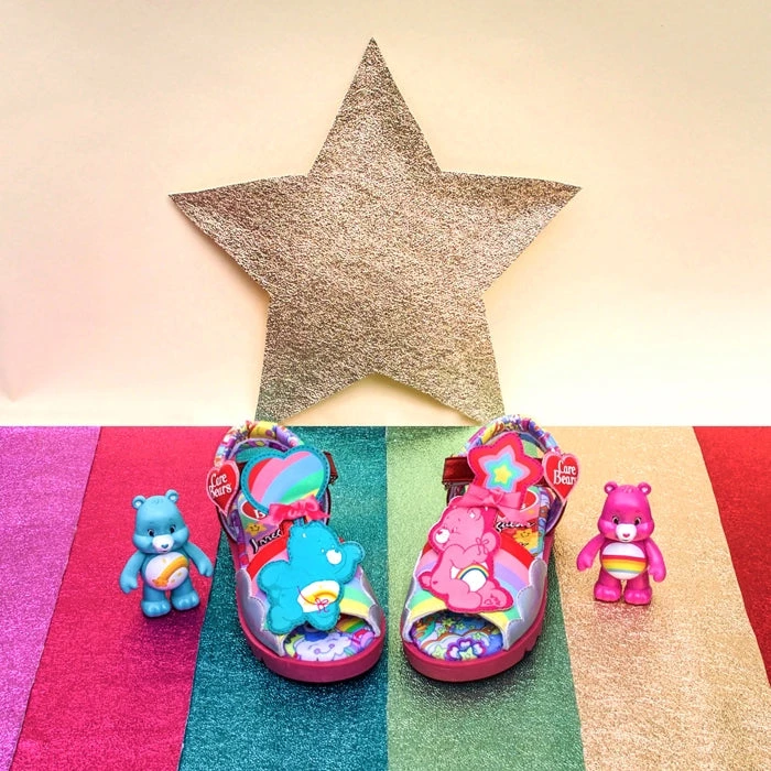 Seek magical adventures to Care-a-lot in a pair of these happy smiley sandals! Cheer Bear and Wish Bear float through rainbow-filled skies and sit atop each shoe. Both sandals feature a padded ankle strap and hook and loop fastening for extra comfort!