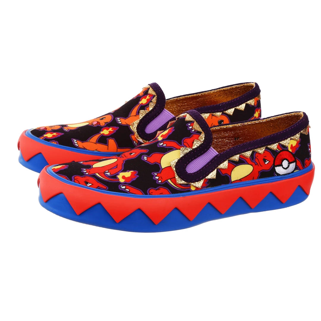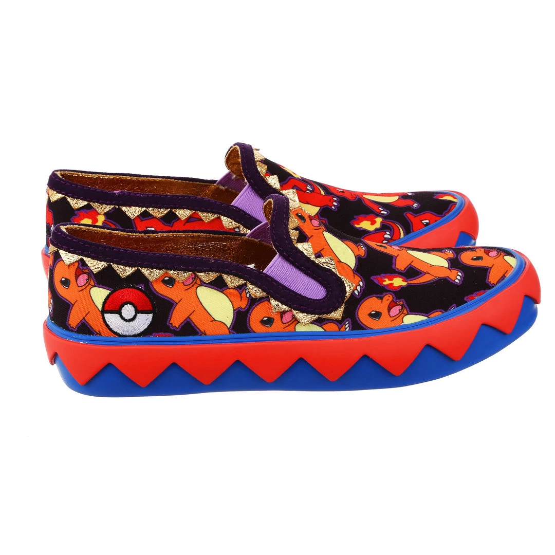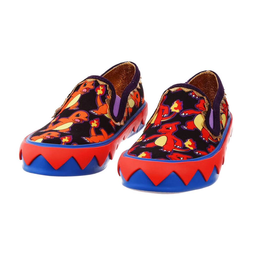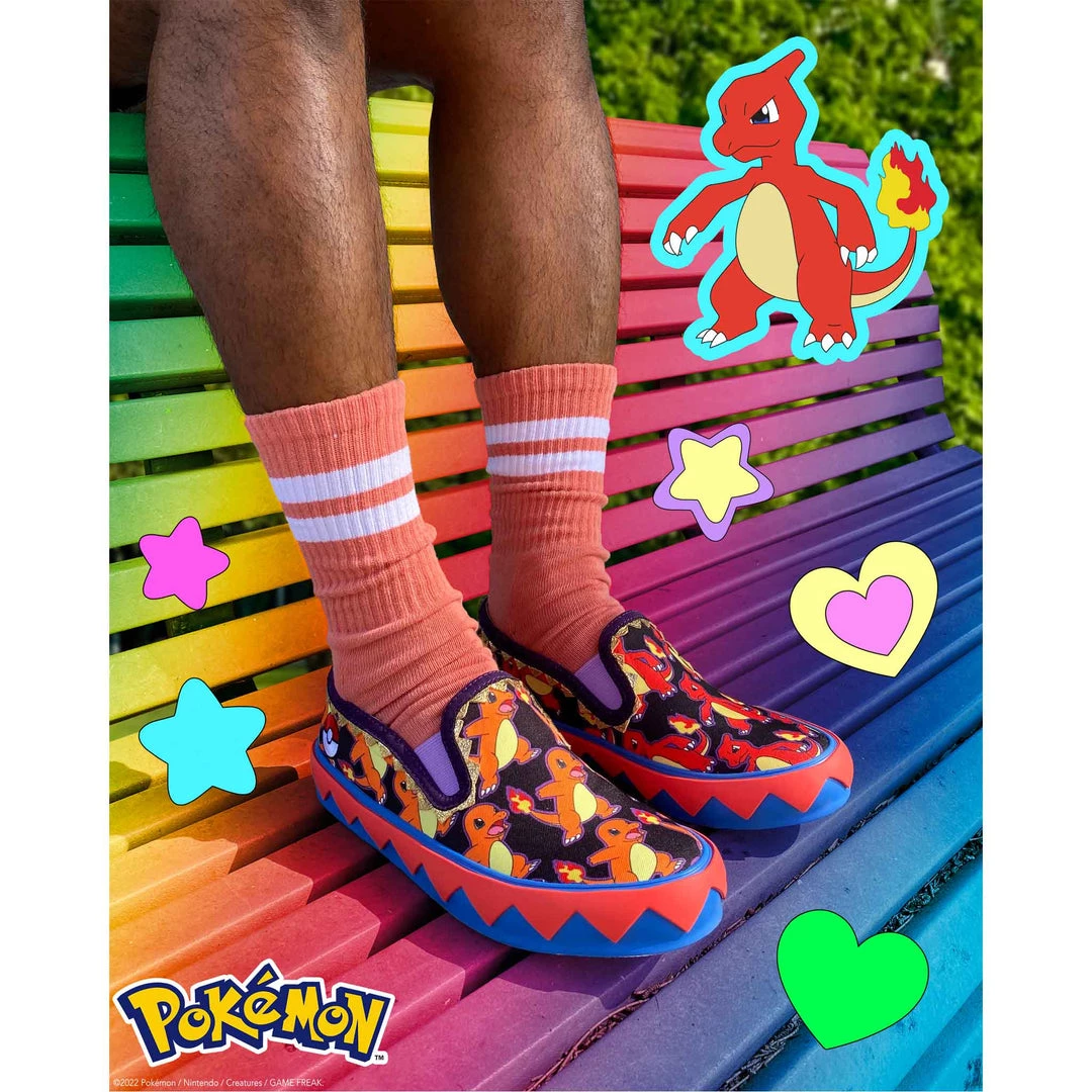 BRB, I’m adventuring! Choose your Pokémon and go on an adventure in these awesome slip ons! With one foot featuring Charmander and the other Charmeleon, these print-tastic kicks are perfect for any fire-type trainer or lover of the adorable Pokémon! A graphic zig-zag trim borders the sole to give a little extra detail, and the purple elastic on the upper makes it easy to slip them on and off! So what are you waiting for? Go, Charmander!