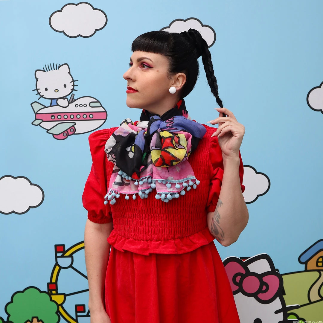 Wrap up extra lovely in this enchanting scarf featuring Hello Kitty! A striking print of Hello Kitty on bold colours with flowers and bows is spread across this fabulous scarf which is trimmed with fun pom poms! Great to add to any outfit and show your love of Hello Kitty!