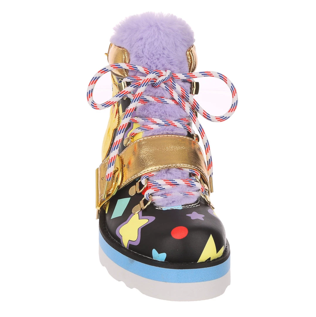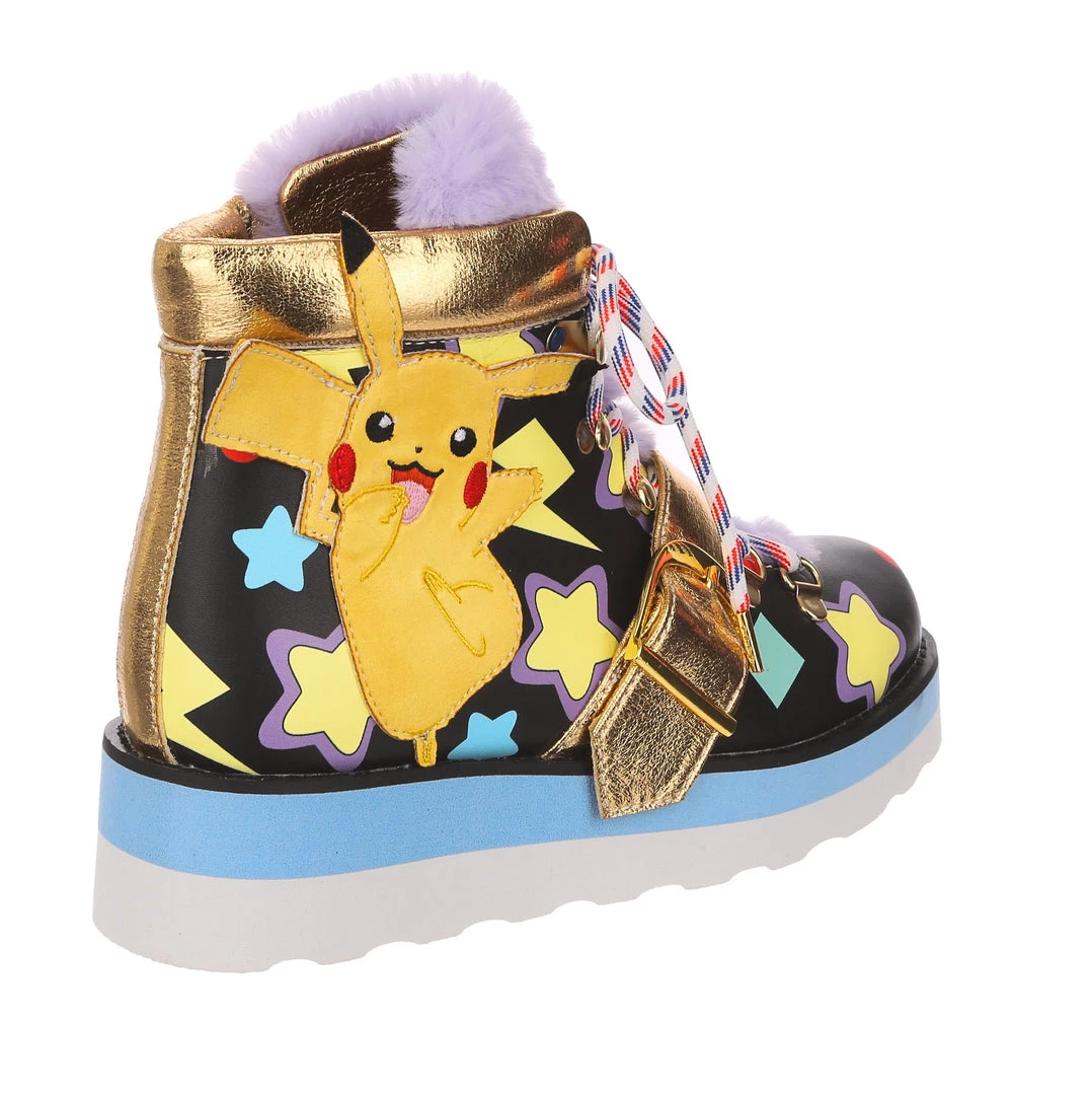 Who is ready for a Pokémon party? These shoes certainly are! Featuring an eye-catching multicoloured retro graphic print, metallic gold details, and a fluffy tongue, they aren’t your average boot. Pikachu is in pride of place on the side, sure to have you smiling all day long! The comfy stacked sole is practical and wearable, and the shoes are fastened with an awesome multicoloured lace – new faves alert!