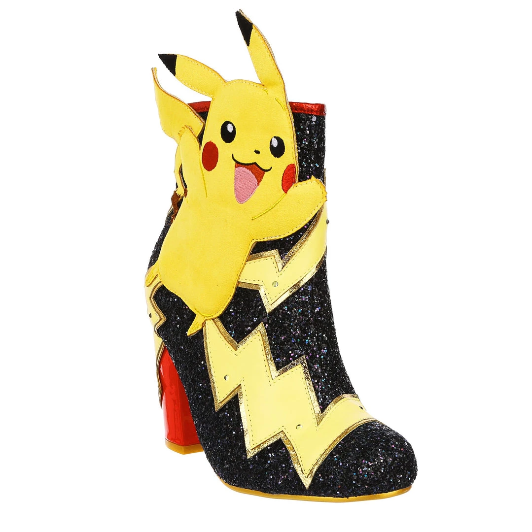 Pikachu! I choose you! These are the ULTIMATE Pikachu boots! Shimmering black glitter is topped with graphic lightning bolts that are dotted with flashing lights, and at the centre is a beautiful applique of Pikachu jumping! The chunky heel is a striking patent red to really make these a pair of boots to remember!